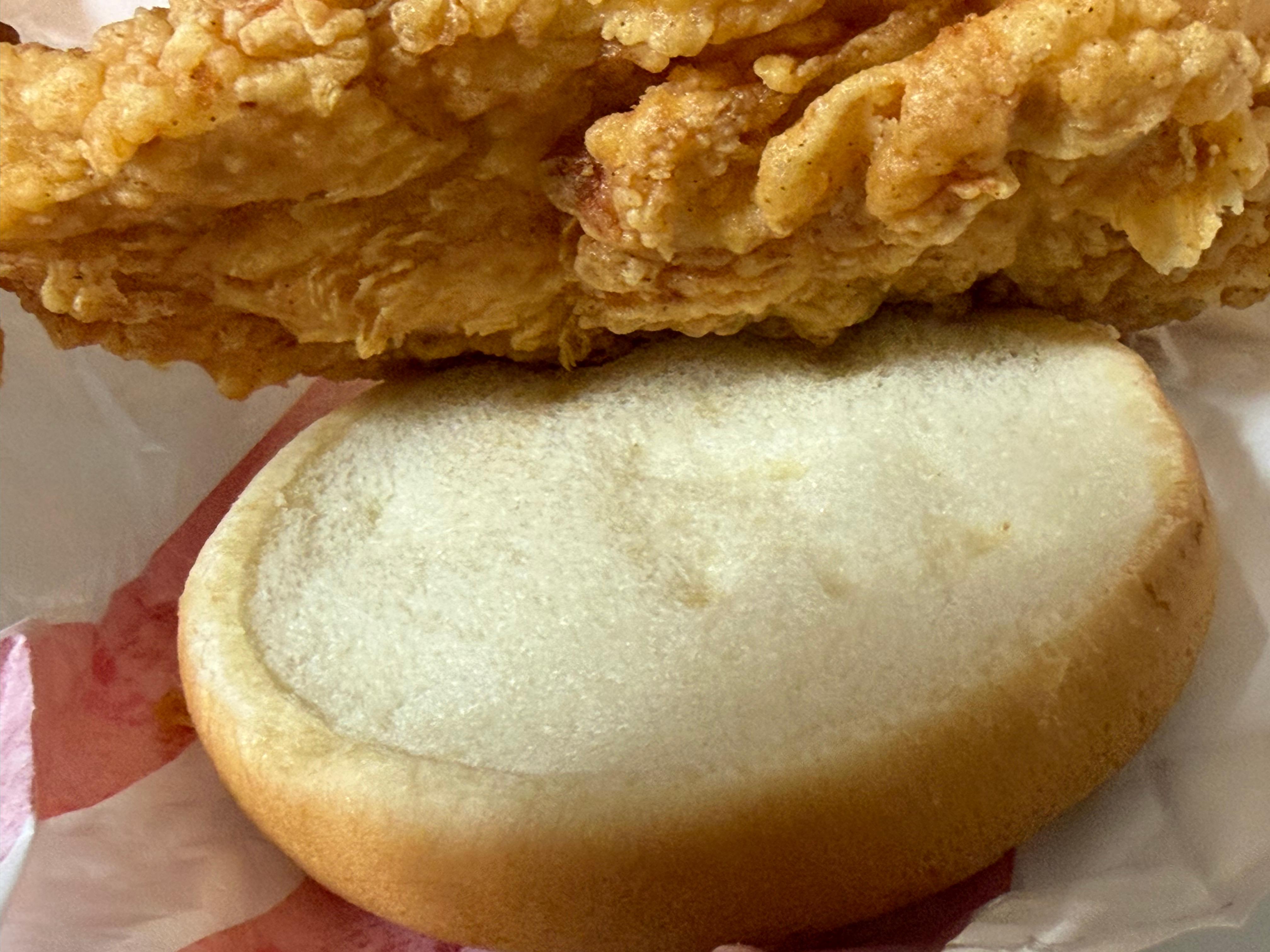 근데 응? 치킨 한 덩어리에 양상추 요만큼? 소스는??윗 번에 묻어 있는 소스가 전부이고, 양상추는 요만큼 들어 있습니다. 소스가 이렇게 없는 햄버거는 처음 봅니다. 하아..... 그래서 치킨을 들어 올려서 아래쪽 번을 봤습니다.
