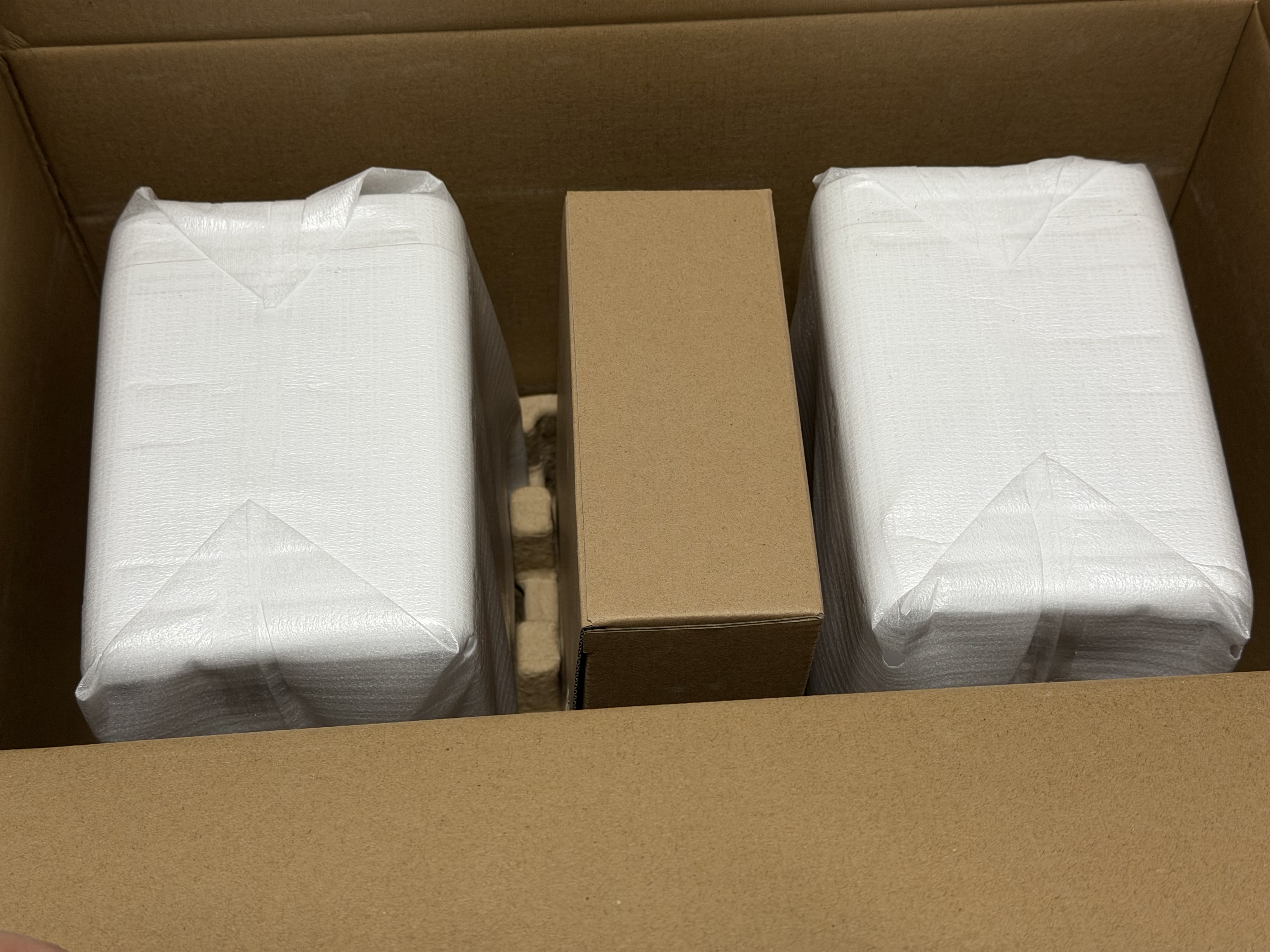 KANTO ORA4는 이중 포장이 되어 있습니다. 겉박스는 다소 찌그러지더라도 마음이 덜 아픈 1도 인쇄가 된 무지 골판지가 사용되었고, 속박스는 검은색에 임팩트 있는 4도 인쇄가 된 종이 상자입니다. 속박스까지 열어 보면 제품 매뉴얼과 스피커 받침이 보입니다. 종이 재질의 완충재도 벗겨내면 하얀 포장지에 싸여 있는 스피커를 볼 수 있습니다. 스피커와 스피커 사이에는 충격 방지를 위한 종이 완충재가 역시 마련되어 있습니다. 적어도 운송중에 문제가 생기지는 않을 것 같습니다.