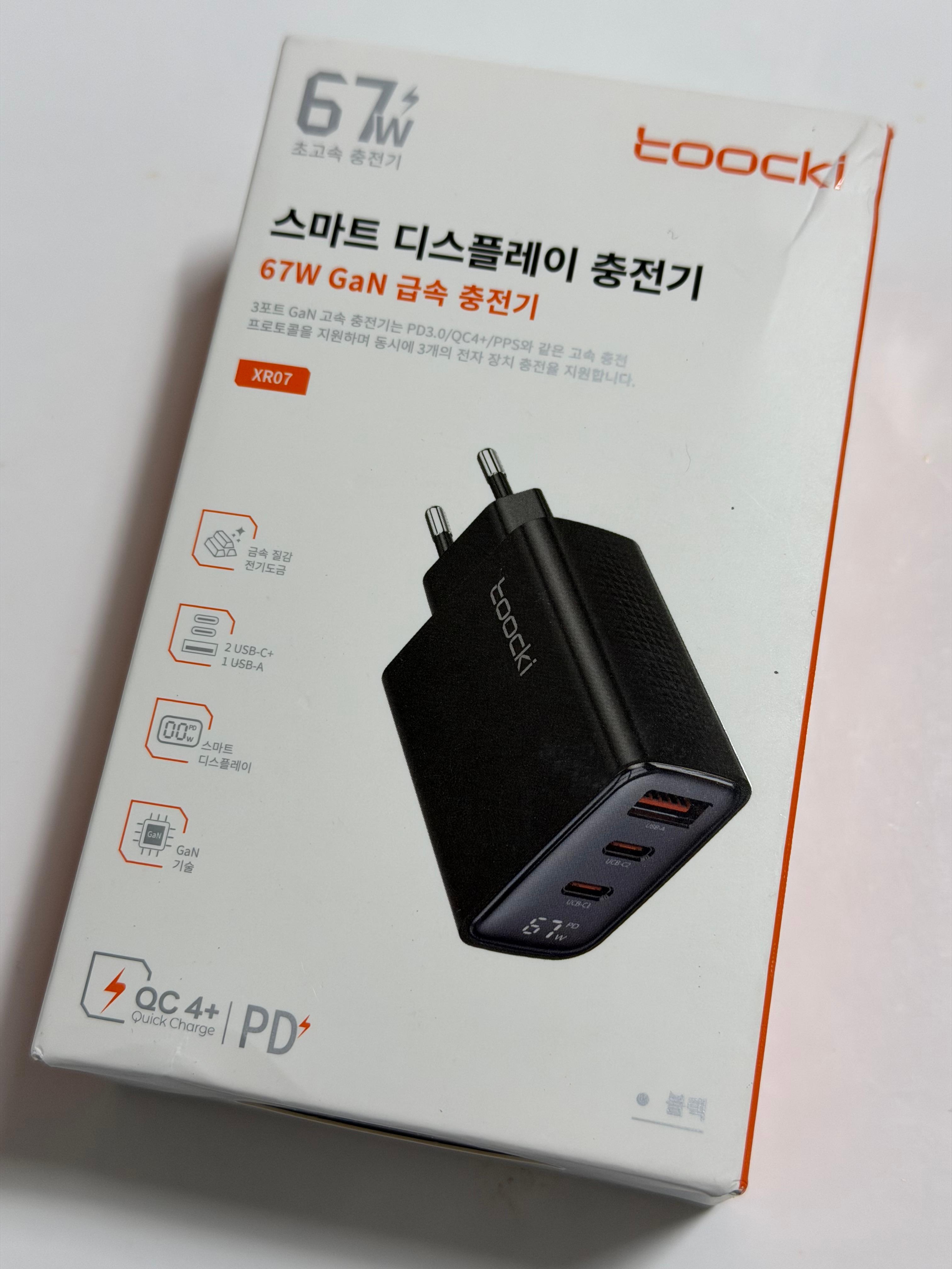 그래서 구입하기 시작한 것이 충전량과 제품 부피가 적절한 조화를 이루는 Toocki의 67W 충전기입니다. Toocki의 67W 충전기는 종류가 여럿인데 이번에 구입한 제품은 충전량을 디스플레이로 볼 수 있는 스마트 디스플레이 충전기입니다.