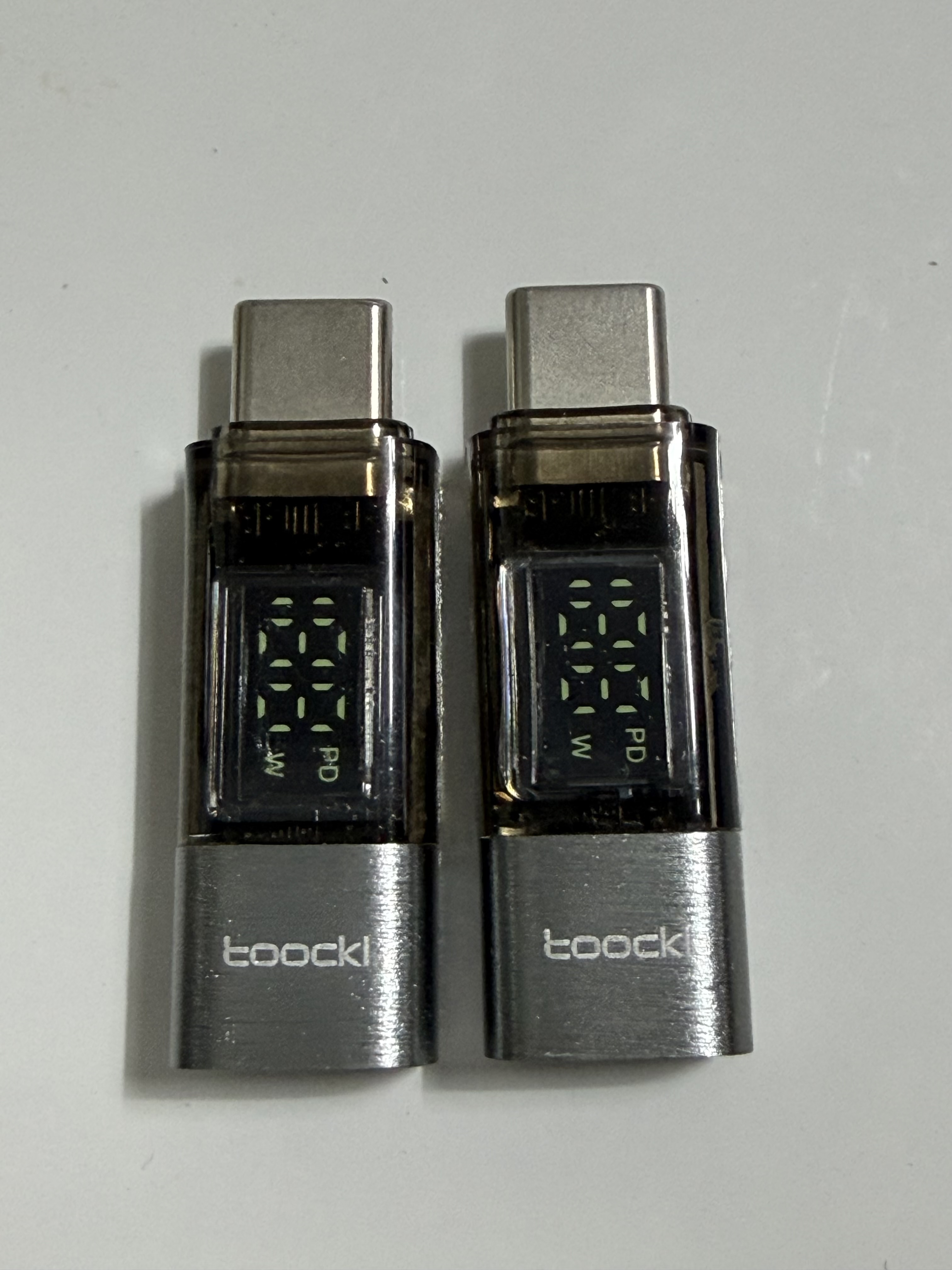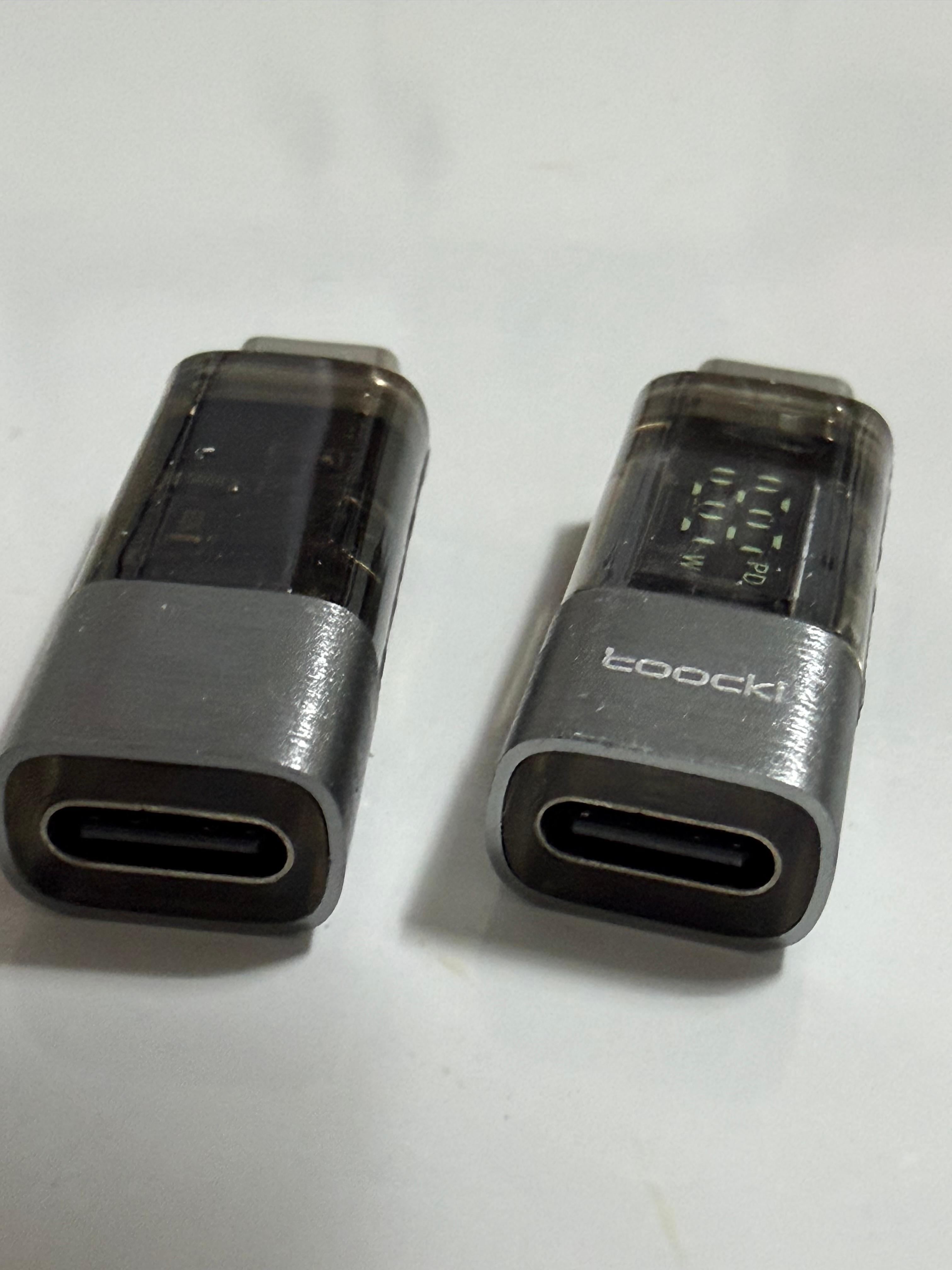 그래서 간단히 충전량을 측정할 수 있는 기기를 몇 개 구입을 해 봤습니다. 케이블에 꽂아서 현재 케이블로 전송되는 전력량을 측정할 수 있는 어댑터, 아예 제품 자체에 측정량을 확인할 수 있는 디스플레이가 장착된 케이블입니다. 둘 다 Toocki 제품이네요.