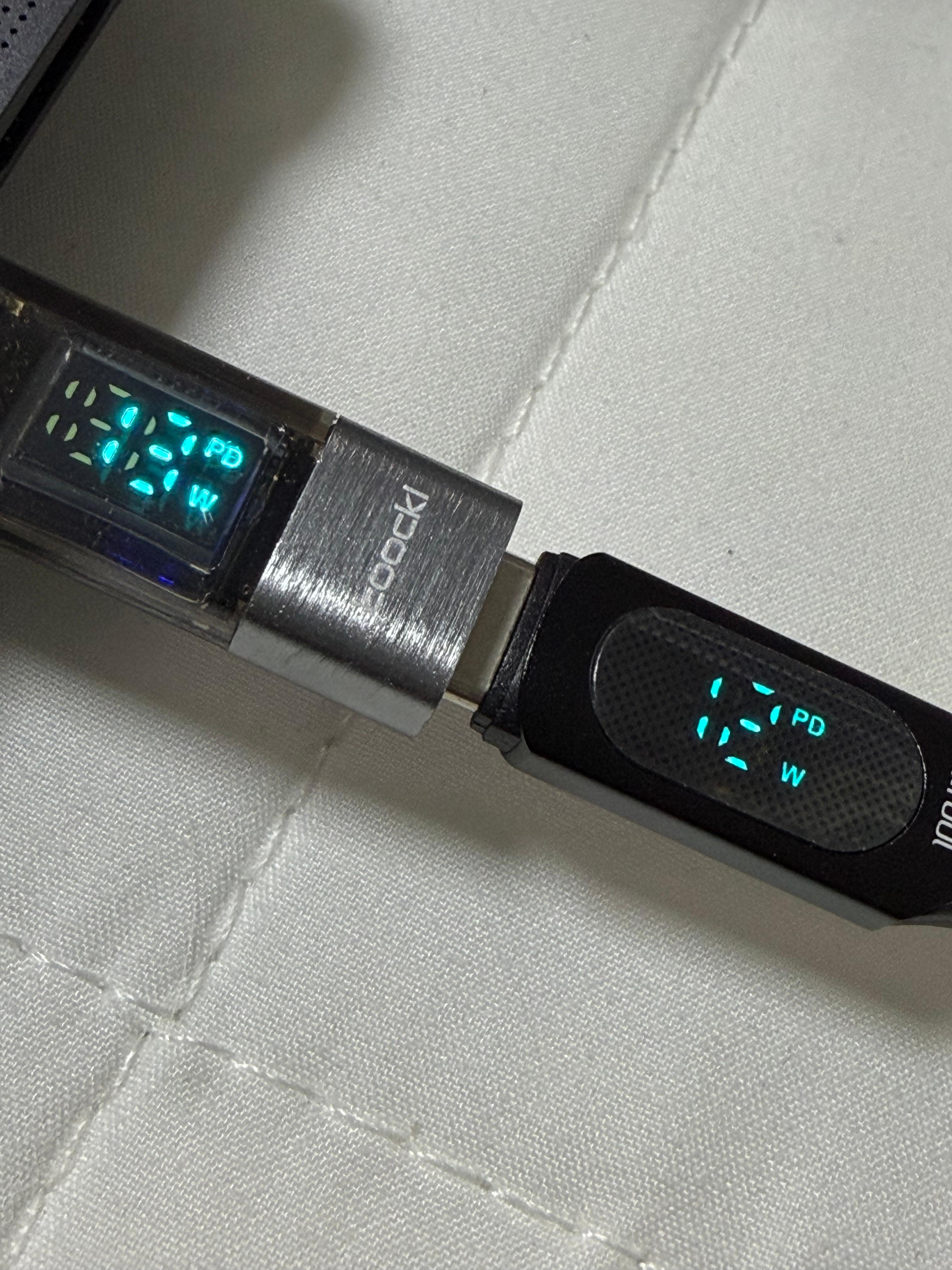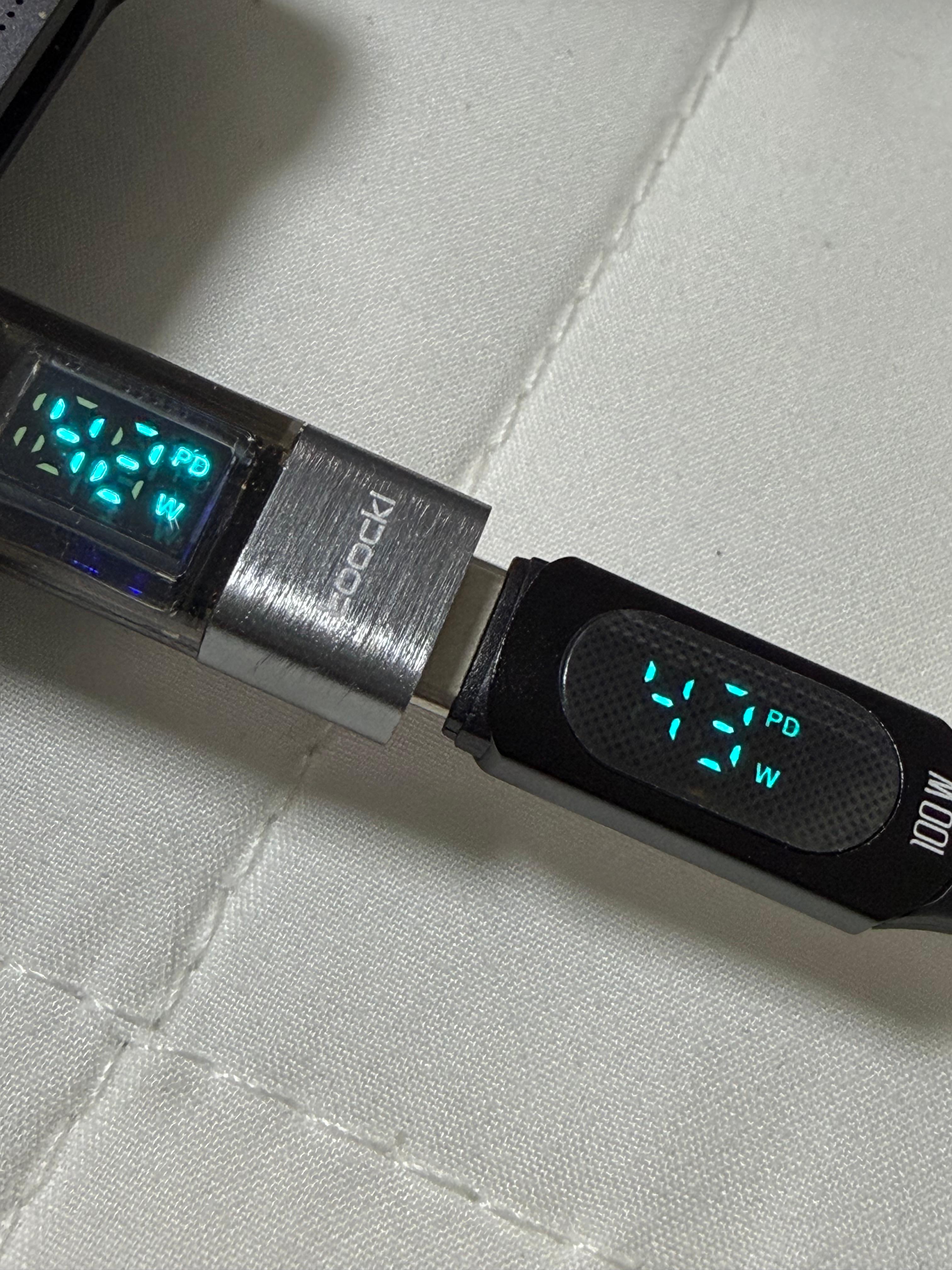 디스플레이가 내장된 어댑터와 케이블은 현재 전송되고 있는 전력량을 간단하게 확인하는 목적으로 사용할 수 있습니다. 스펙 상으로는 최대 100W까지 전송이 가능하고, 표기도 된다고 하고 있으나 실제 맥북에서 테스트했을 때는 44W를 넘지 못했습니다. 맥북의 충전량이 80%를 넘어서일 수도 있을 거라고 생각은 합니다. 데이터 전송 속도가 모두 USB 2.0 수준이어서 고속 데이터 전송에는 적합하지 않고, 데이터 오염 가능성도 있기 때문에 대용량의 데이터 전송 때는 다른 고급 케이블을 사용하는 것을 추천하고 싶습니다. 저처럼 두 가지 모두를 가지고 있을 필요는 없을 테니 그냥 필요에 의해서 하나 정도를 구입해서 충전기가 적정 출력이 되고 있는지, 제품마다 실제 입력 받는 충전 용량이 어느 정도인지 간단히 테스트하기에 요긴합니다. 호기심 많은 분들은 구입해 보세요~ 그렇지 않은 분들에겐 세상 쓸 모 없는 녀석들일 겁니다.