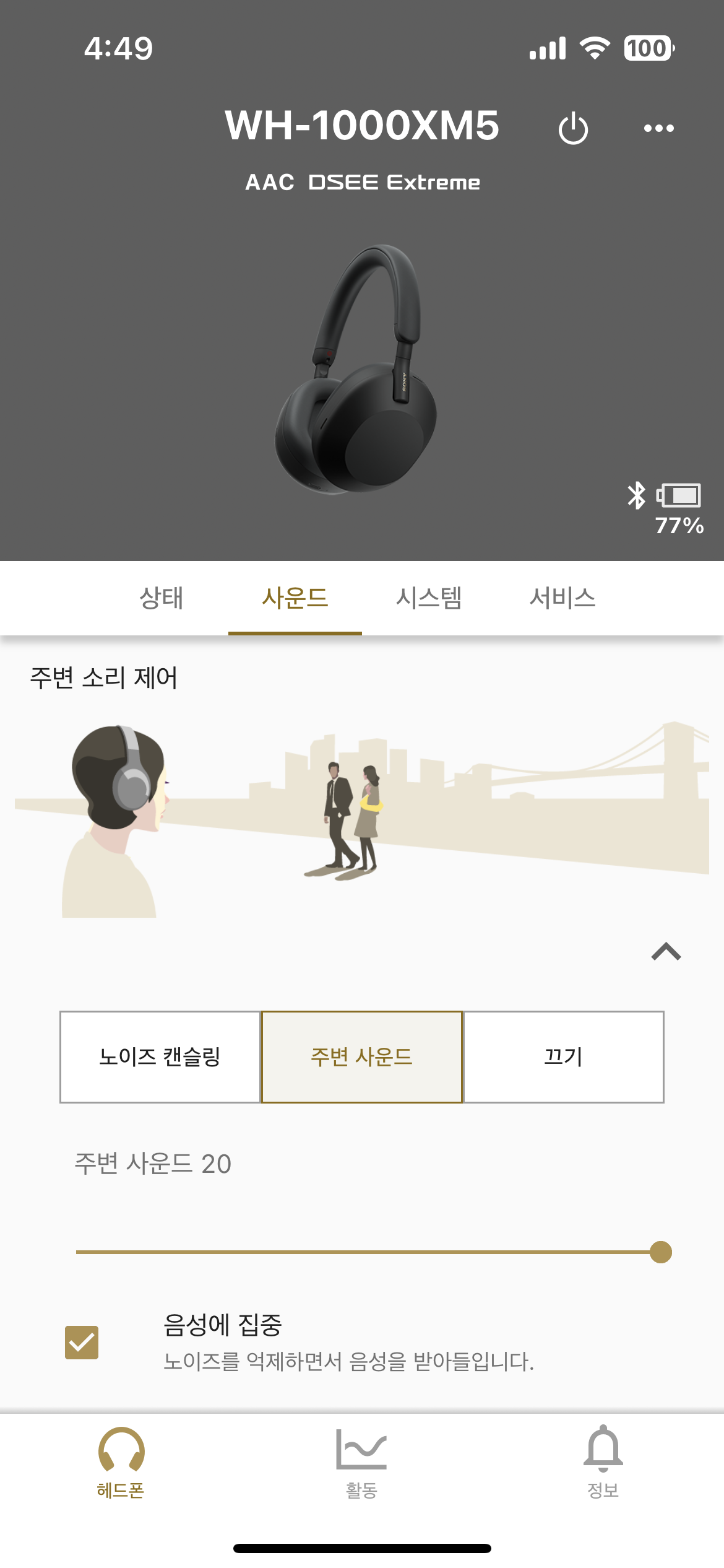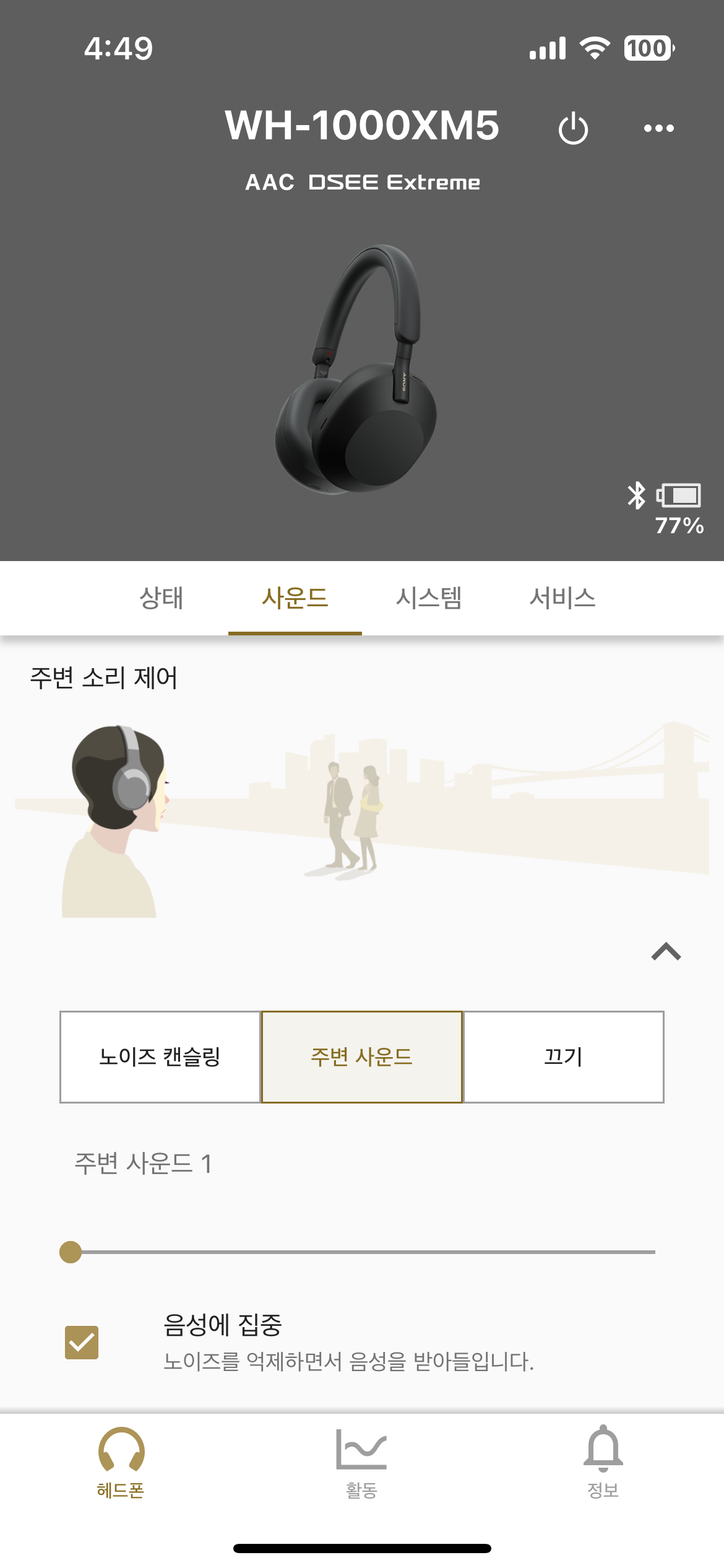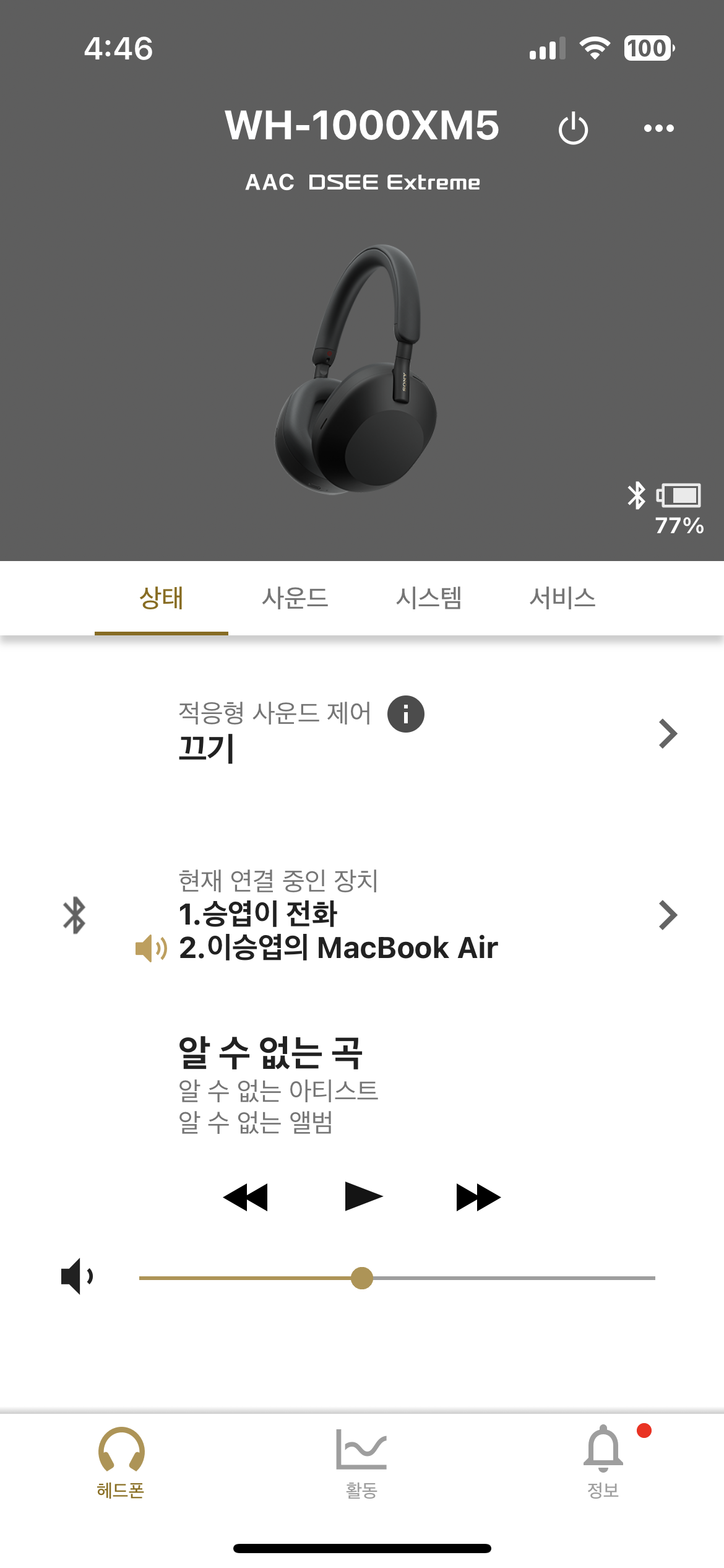 먼저 헤드폰 앱을 켜면 기본 상태 창을 볼 수 있습니다. 기본 창에서는 현재 헤드폰이 페어링 되어 있는 상태를 확인할 수가 있습니다. 저는 당연히 제 핸드폰과 노트북에 각각 멀티포인트 연결을 해 놨습니다. 그리고 그 아래에는 재생중인 노래(혹은 영상)에 대한 정보와 음량도 확인할 수 있습니다. 상태 창에서 가장 의아한 것은 "적응형 사운드 제어" 입니다. 이건 현재 내가 어떤 상태(앉아 있는지, 걸어다니는지, 운동 중인지 등등)인지에 따라 노이즈캔슬링을 조절한다는 건데 이게 저는 불편하더라고요. 왜냐면 걸어다니면 위험을 방지하기 위해 노이즈캔슬링을 낮추거나 외부소음 듣기로 자동 전환을 시켜 주는데, 지하철을 자주 이용하는 저로서는 외부의 위험보다 사람들의 소음 방지하는 게 더 좋거든요. 지하철역 특유의 백색 노이즈를 별로 좋아하지 않아서요. 그래서 저는 적응형 사운드 제어 기능은 꺼놓고 사용을 했습니다. 그래서 활동 탭도 사용을 하지 않았습니다. 애플 워치로 걷고 달리고, 하루의 활동량을 체크하고 있는 저로서는 굳이 헤드폰에까지 그런 기능을 맡기고 싶진 않았습니다. 활동 탭을 활성화시키면 적응형 사운드 제어와 연동되어 노이즈캔슬링이 제멋대로 동작하거든요.