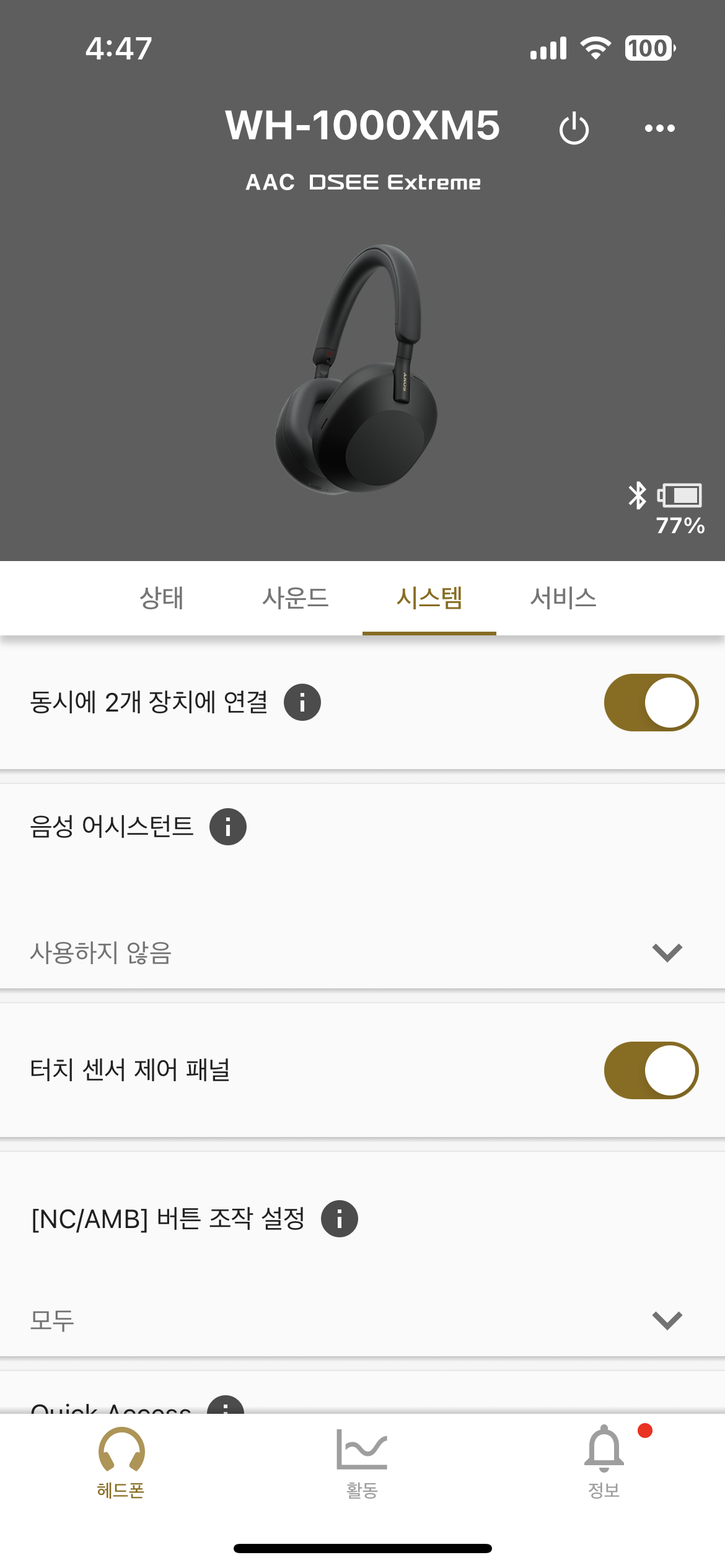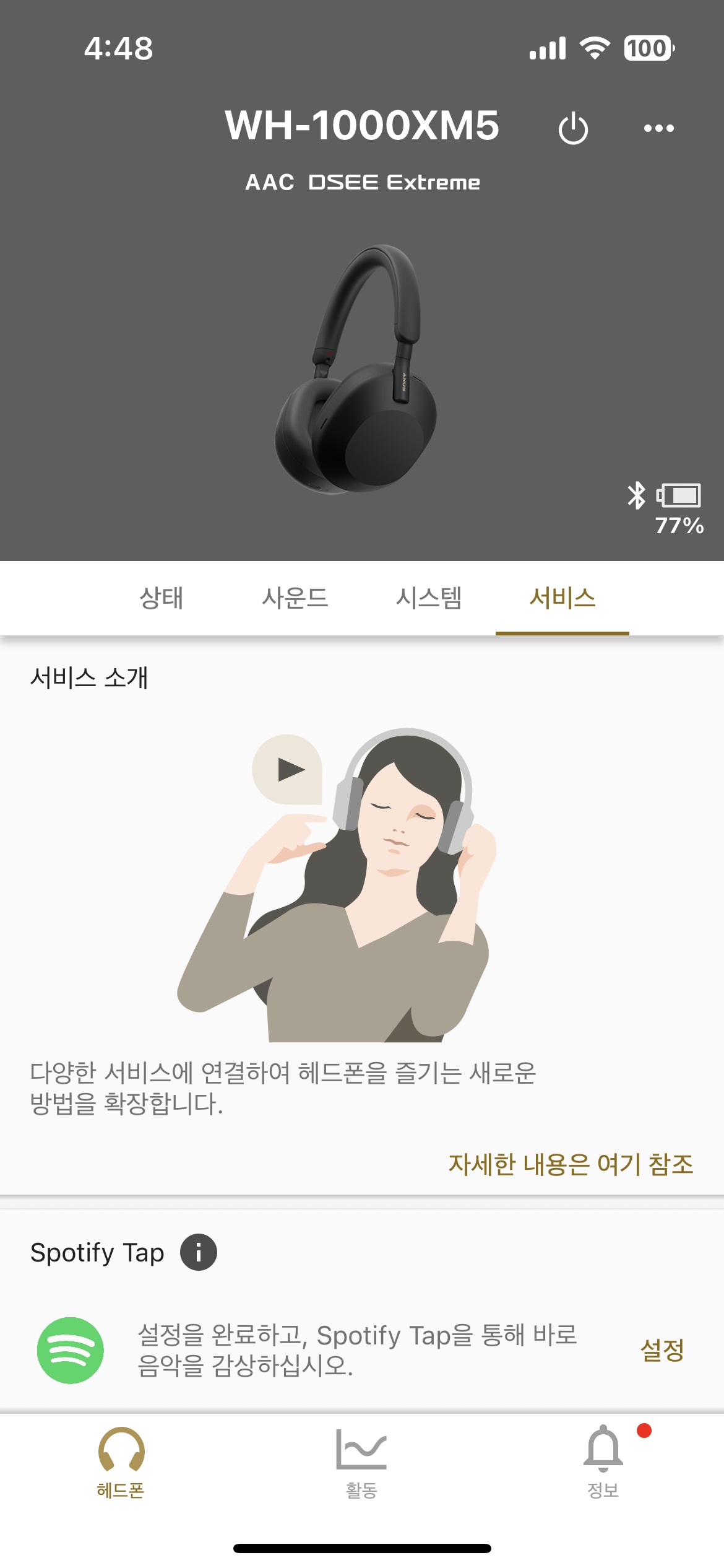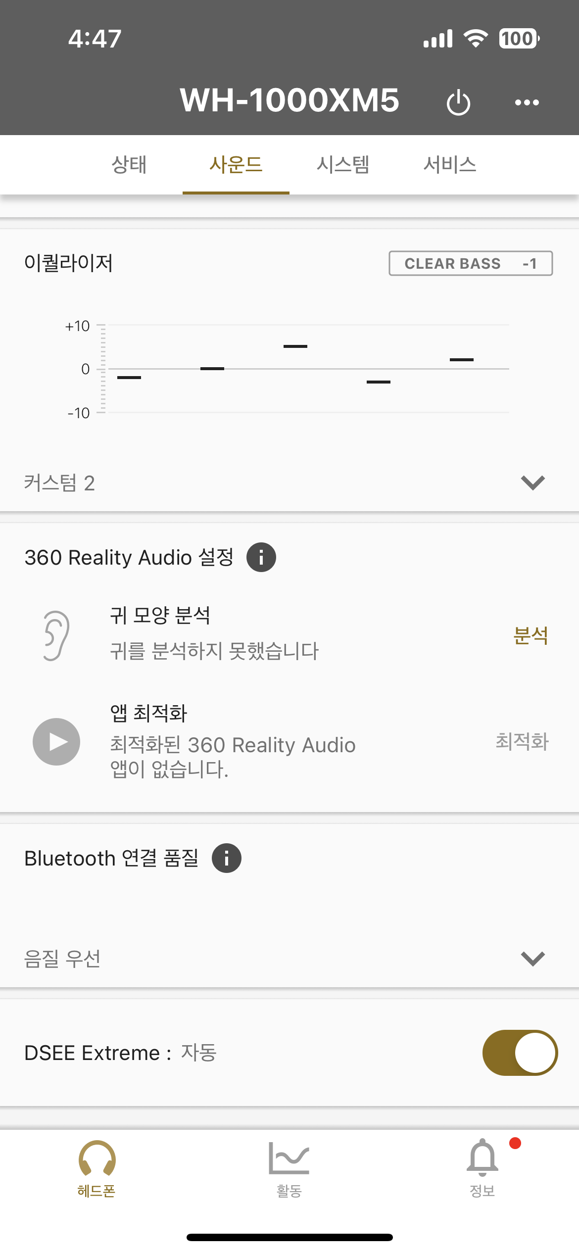 먼저 헤드폰 앱을 켜면 기본 상태 창을 볼 수 있습니다. 기본 창에서는 현재 헤드폰이 페어링 되어 있는 상태를 확인할 수가 있습니다. 저는 당연히 제 핸드폰과 노트북에 각각 멀티포인트 연결을 해 놨습니다. 그리고 그 아래에는 재생중인 노래(혹은 영상)에 대한 정보와 음량도 확인할 수 있습니다. 상태 창에서 가장 의아한 것은 "적응형 사운드 제어" 입니다. 이건 현재 내가 어떤 상태(앉아 있는지, 걸어다니는지, 운동 중인지 등등)인지에 따라 노이즈캔슬링을 조절한다는 건데 이게 저는 불편하더라고요. 왜냐면 걸어다니면 위험을 방지하기 위해 노이즈캔슬링을 낮추거나 외부소음 듣기로 자동 전환을 시켜 주는데, 지하철을 자주 이용하는 저로서는 외부의 위험보다 사람들의 소음 방지하는 게 더 좋거든요. 지하철역 특유의 백색 노이즈를 별로 좋아하지 않아서요. 그래서 저는 적응형 사운드 제어 기능은 꺼놓고 사용을 했습니다. 그래서 활동 탭도 사용을 하지 않았습니다. 애플 워치로 걷고 달리고, 하루의 활동량을 체크하고 있는 저로서는 굳이 헤드폰에까지 그런 기능을 맡기고 싶진 않았습니다. 활동 탭을 활성화시키면 적응형 사운드 제어와 연동되어 노이즈캔슬링이 제멋대로 동작하거든요.