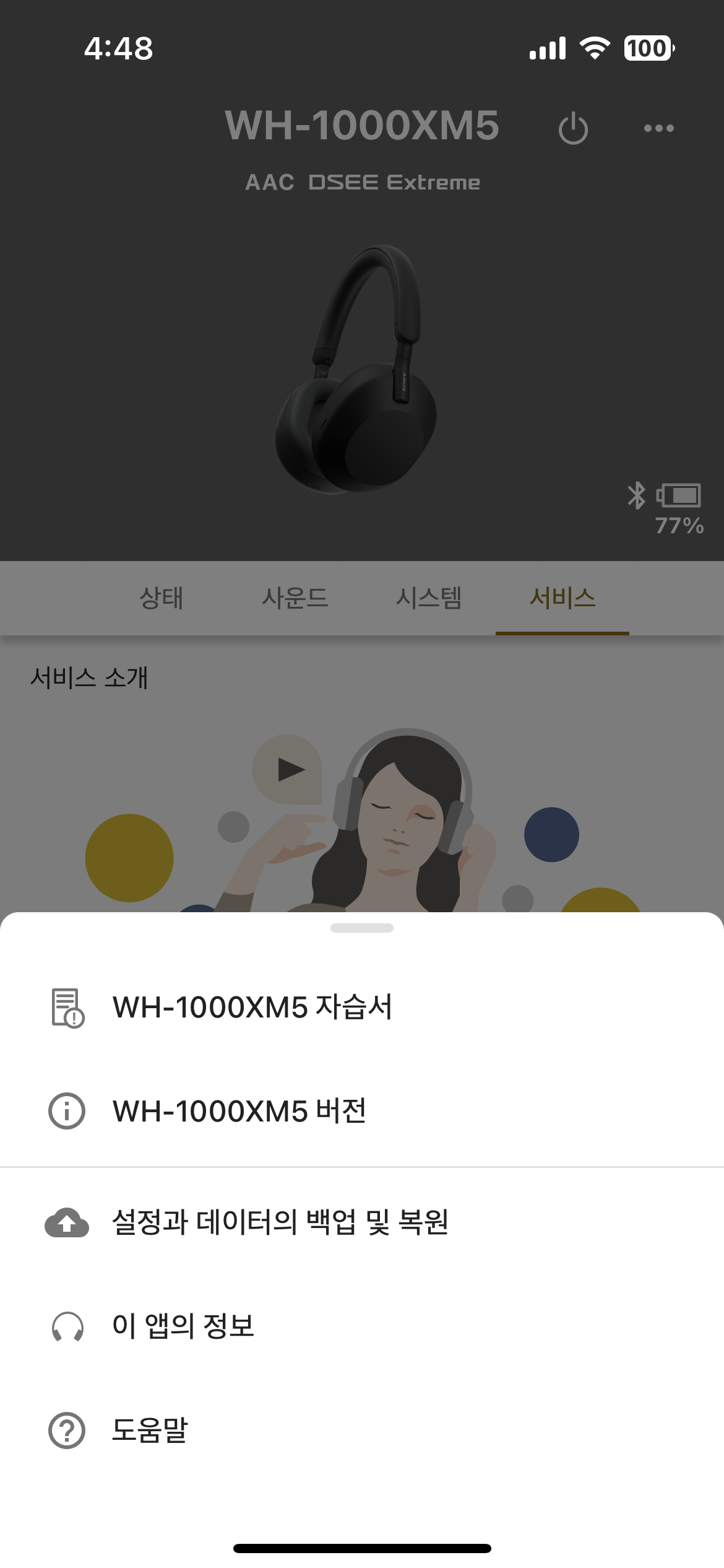 사운드 메뉴에서는 노이즈 캔슬링과 주변 사운드 듣기 끄기를 설정할 수 있습니다. 노이즈 캔슬링의 강도는 그냥 준수한 편입니다. 소니의 이전 제품들을 써 보지는 않았기 때문에 전작들과의 비교는 어렵지만 몇몇 유튜브 리뷰를 보면 더 좋아졌다, 더 안 좋아졌다 이런저런 말들이 많긴 합니다. 주로 측정치 리뷰 하시는 분들은 안 좋아졌다고 이야기를 하고, 그냥 귀로 듣기만 해서 리뷰하시는 분들은 좋아졌다고 합니다. 저는 이전 제품에 대한 기준이라는 게 없어서 이 제품 자체의 노이즈 캔슬링에 대해서 이야기하겠습니다.