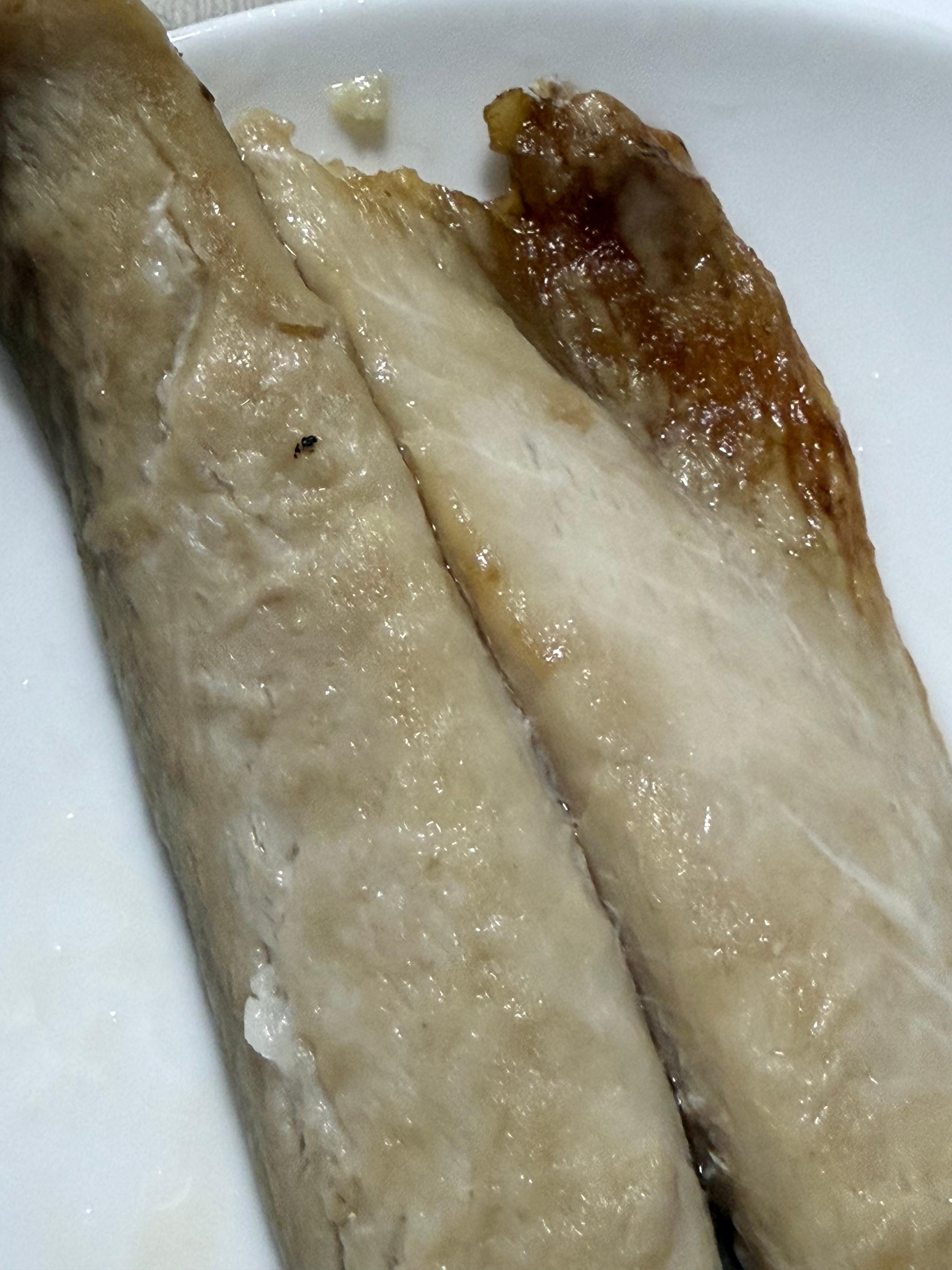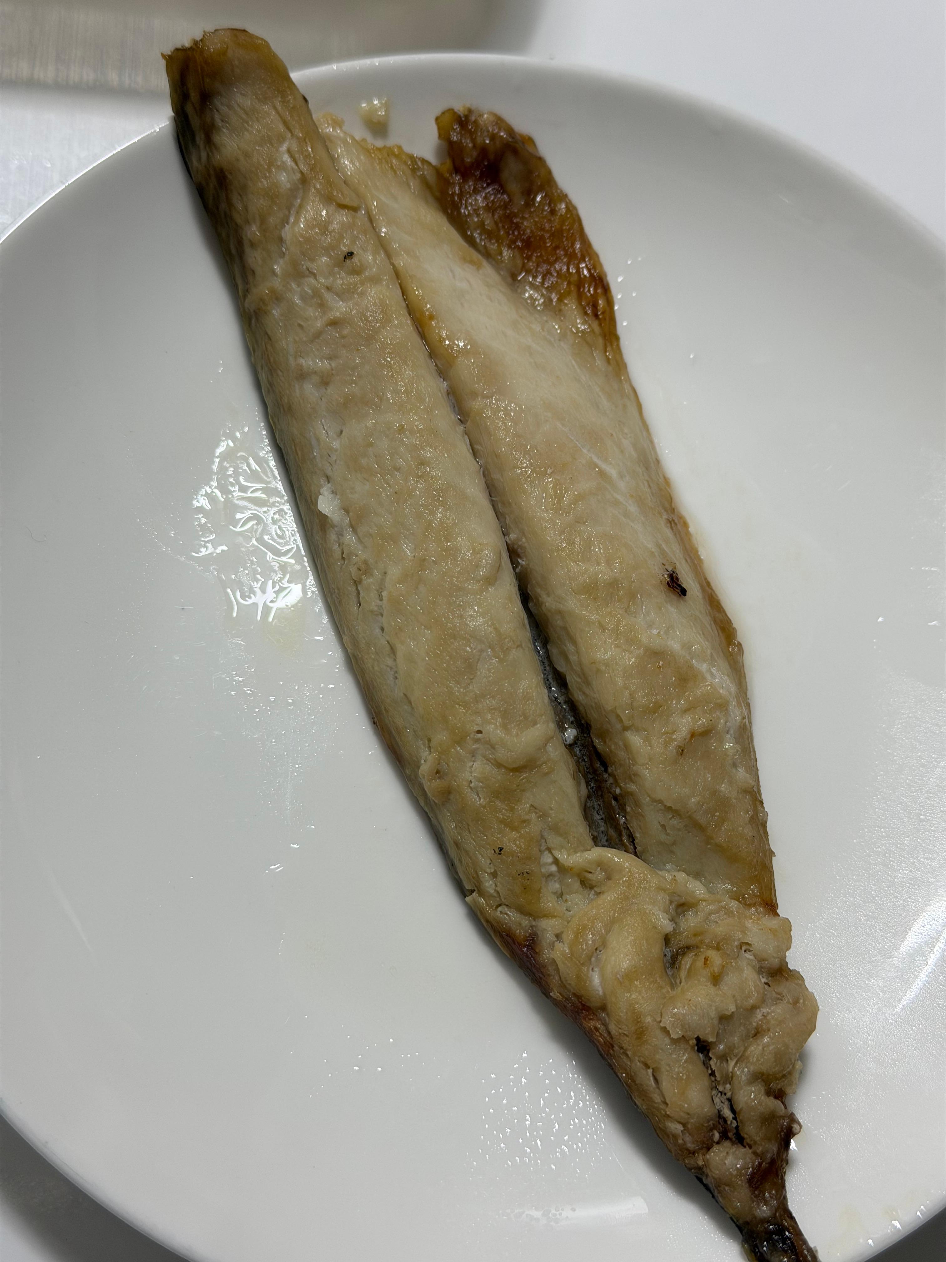 제품을 뜯어서 비닐 랩을 씌운 후 전자렌지에서 2분을 돌렸습니다. 돌리는 중에 전자렌지에서는 냄새가 거의 나지 않았고, 그 덕에 전자렌지에도 냄새가 배지 않았습니다. 전자렌지에서 꺼내 비닐랩을 벗기니 살코기 위에 살짝 기름이 올라와서 고등어 구이 특유의 겉모습을 볼 수 있습니다.
