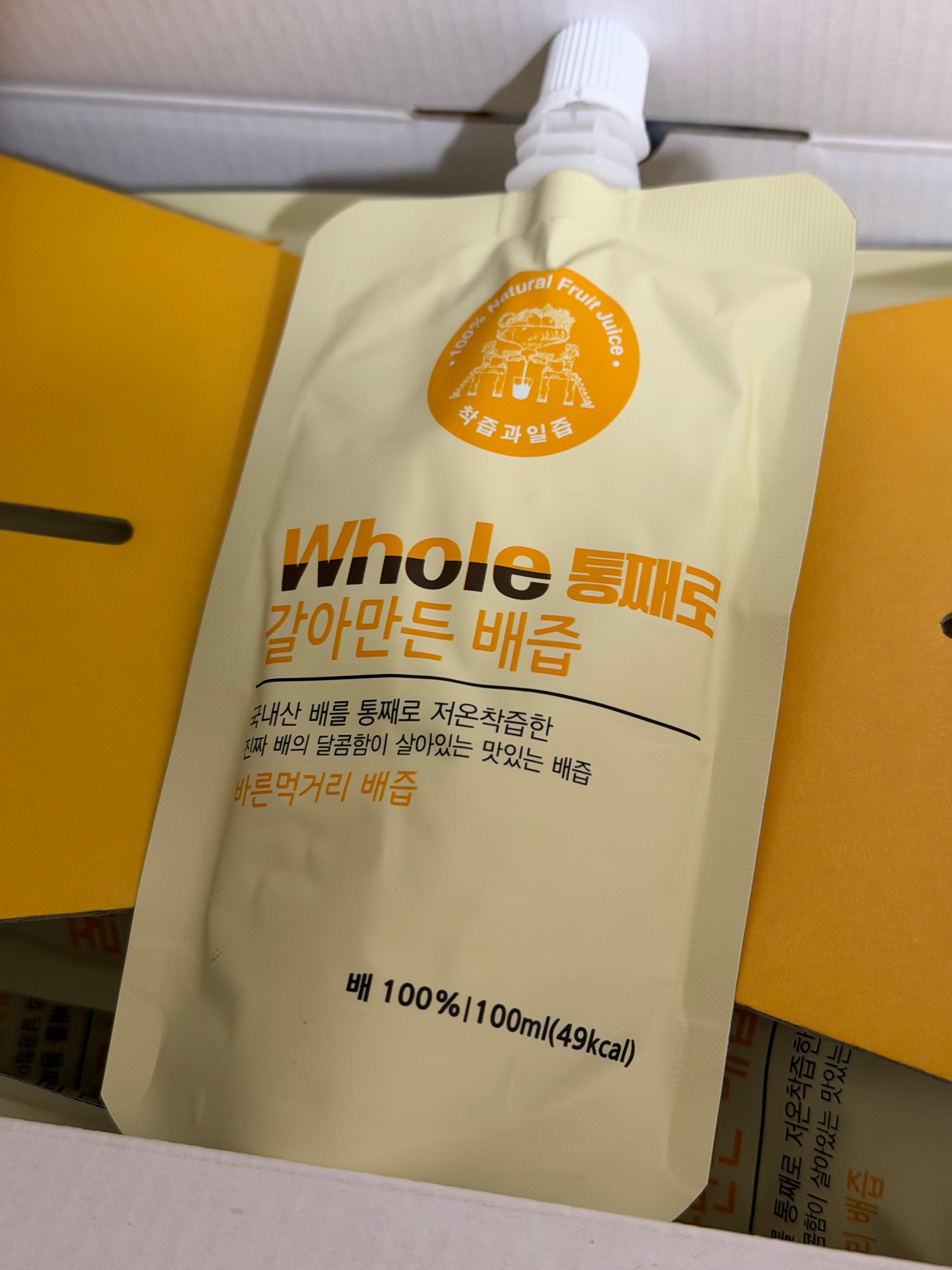 그러다가 제가 감기 때문에 고생하는 모습을 보던 여자친구가 100% 과즙으로 된 배 음료를 사서 보내 줬습니다. 배가 기본적으로 수분이 많은 과일이긴 하지만 그래도 100% 과즙의 배음료라니. 기관지 건강을 위해 마시는 음료이긴 해도 너무 싱겁지는 않을까 하는 염려를 여자친구도 많이 하긴 했습니다만 저는 오히려 배 달인 물 특유의 닝닝한 비린 단맛이 나진 않을까를 더 걱정했습니다.