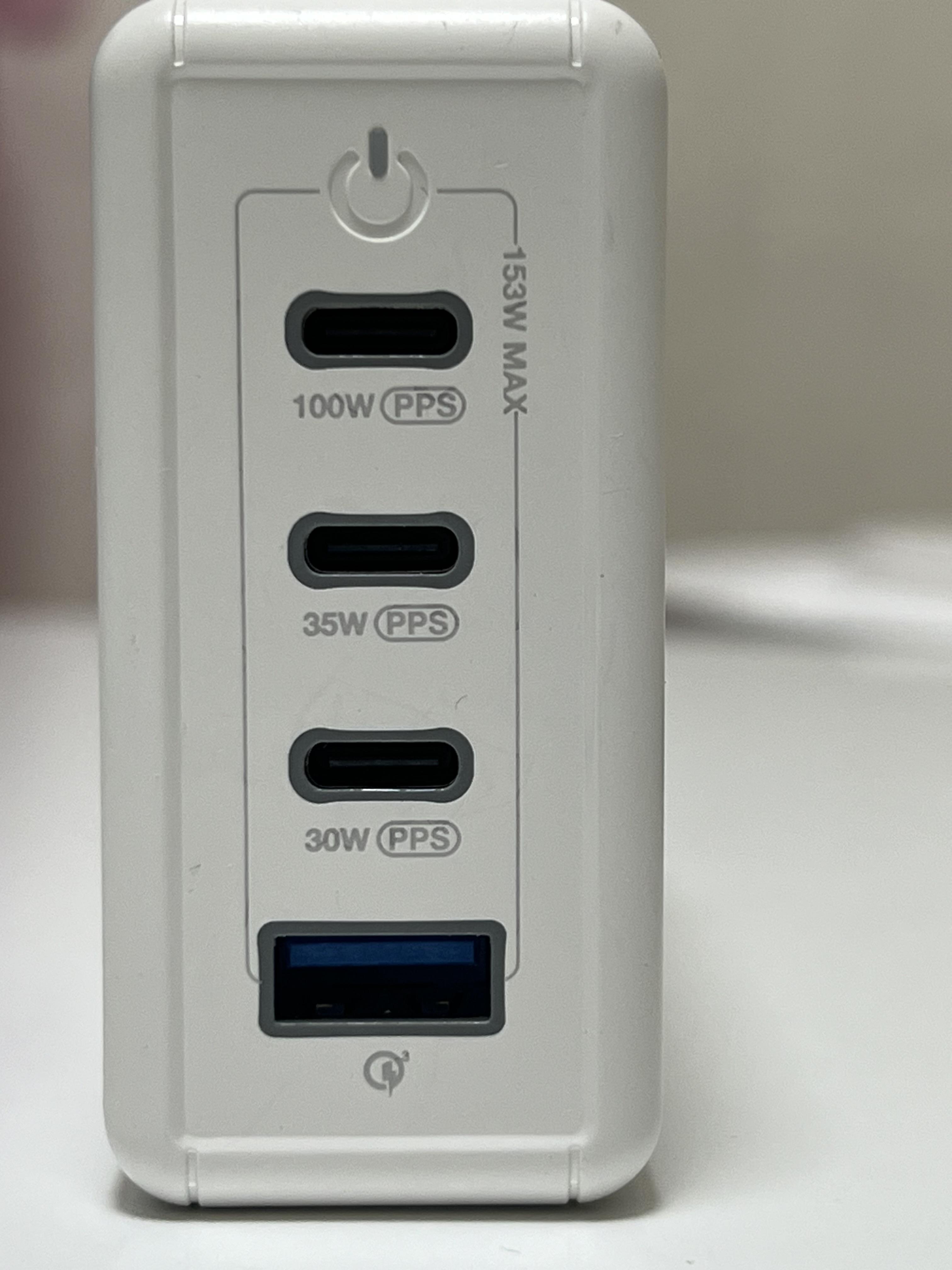 왼쪽 사진에도 크게 나와 있지만 아트뮤 GS110의 길고 긴 제품명에도 나와있듯이 153W의 최대 동시 출력을 자랑하는 고용량 제품입니다. 포트 하나만 사용할 때는 가장 위 포트부터 별도 입력 시 각각 100W, 35W, 30W, 18W의 출력을 지원하며 , 동시 입력 시에는 65W+35W+30W+18W=148W의 출력을 지원합니다. 물론 2개 포트 사용 시, 3개 포트 사용 시, 또 위치에 따라서도 각각의 포트에 따라 출력되는 전력량은 약간씩 차이가 있긴 하지만 기본적으로 첫 번째 포트부터 마지막 포트 순으로 출력 전력량이 달라진다는 것 정도만 기억하고 있은면 될 것 같습니다.