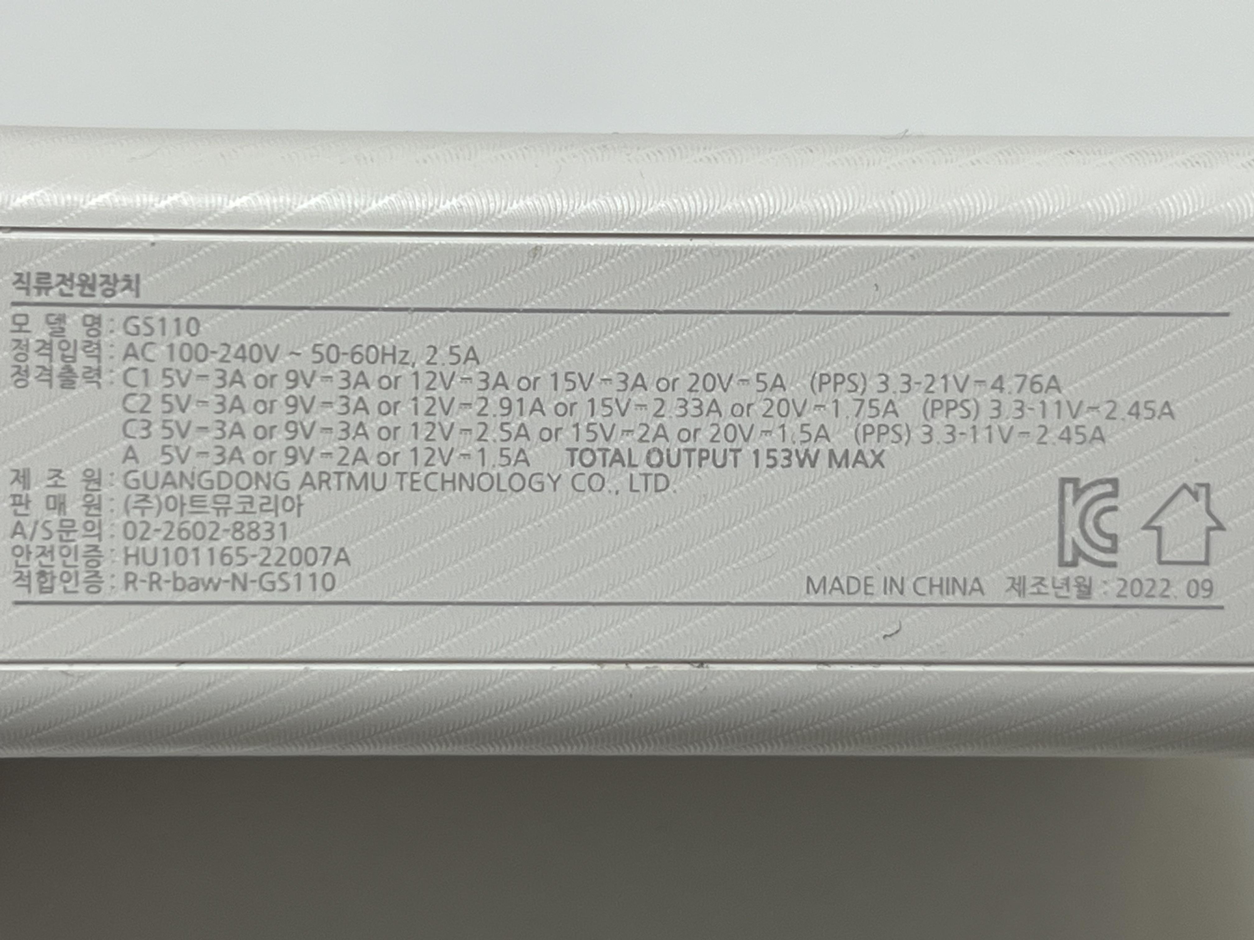 그런 이유로 오른쪽 사진에 보면 USB C1~C3, A 단자의 정격 출력이 다양하게 표기가 되어 있습니다. PPS 기능이 없는 제품은 5V~3A 이런 식으로 단일 출력으로 표기가 되는데 반해 아트뮤의 GS110은 읽기도 어렵고, 계산하기도 어려울 만큼 다양한 정격출력을 보여주고 있습니다. 일일이 계산할 필요 없이 그냥 내 제품 잘 보호해 주고 있구나~ 하고 맘 편히 있으면 될 것 같습니다.
