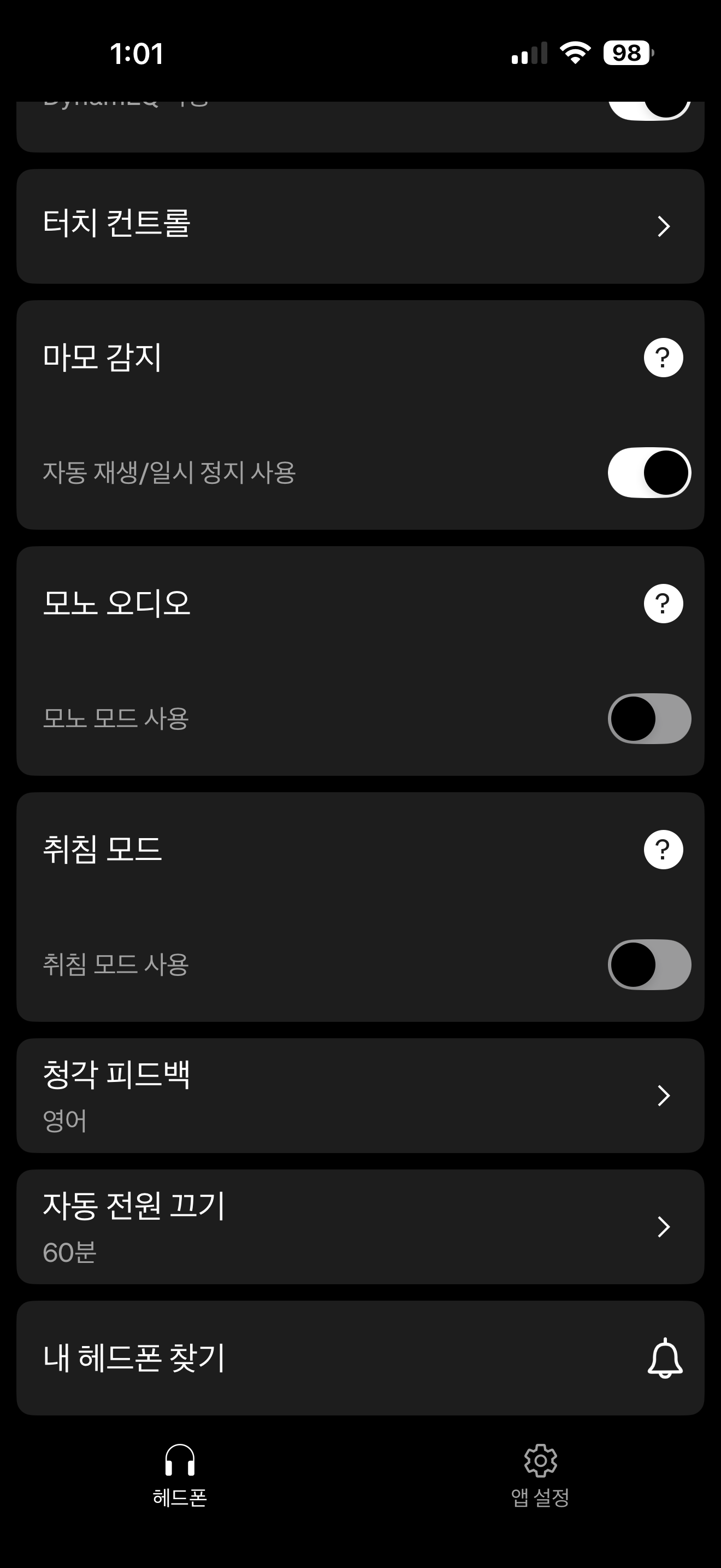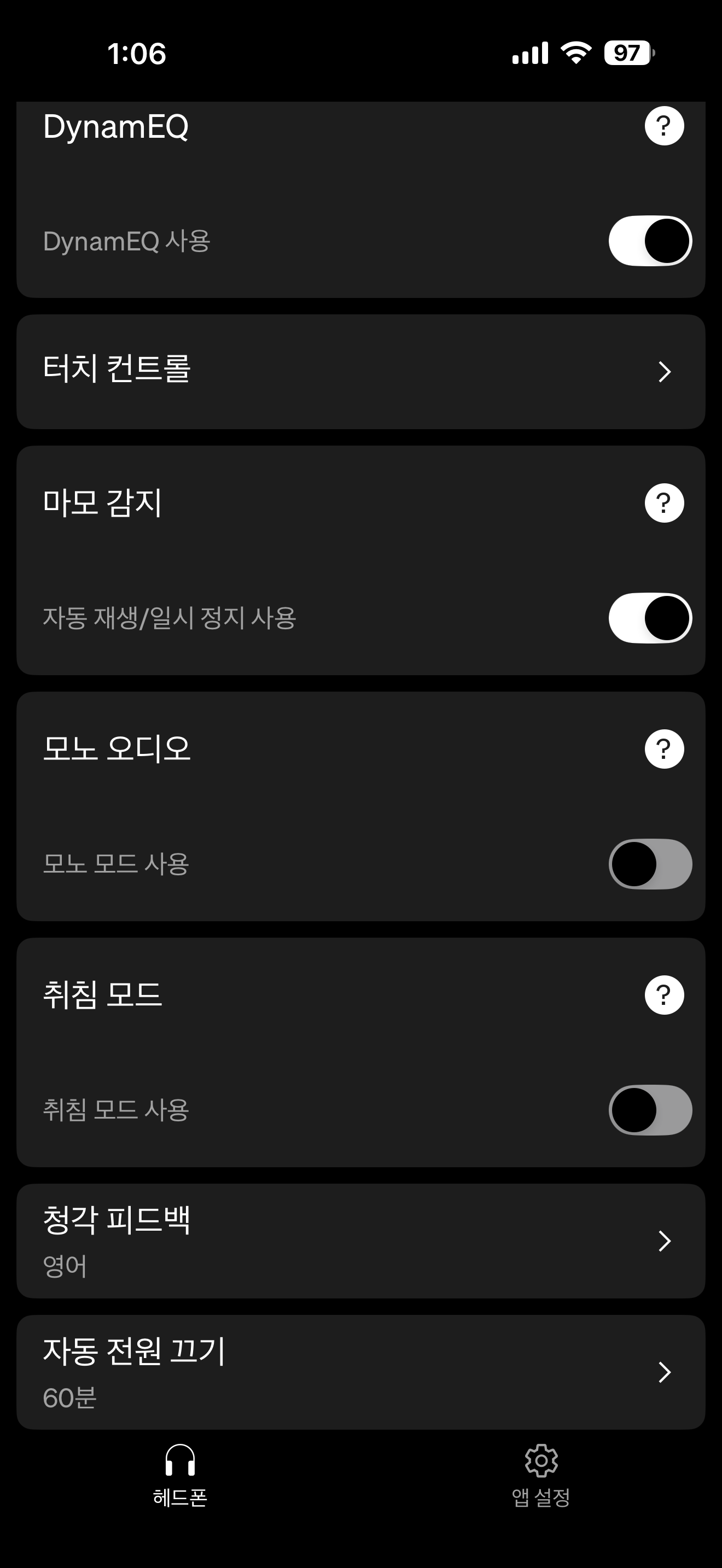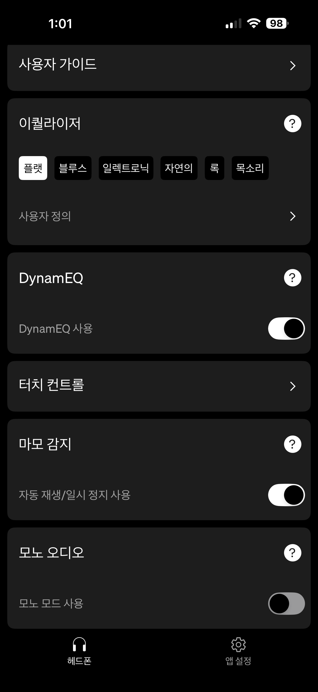 펌웨어 업데이트를 하고 앱을 이리저리 살펴 보니 기능은 P100SE와 동일합니다. 딱히 달라지는 것은 없네요. EQ 프리셋도 동일하게 제공이 됩니다. 하지만 플랫 사운드가 저에게는 가장 잘 맞았습니다. 특이한 기능으로는 DynamEQ가 있습니다. 이는 소리의 볼룸을 낮췄을 때도 사운드 밸런스가 흐트러지지 않게 저음역을 강조해 주는 기능입니다. 대부분의 기기에서 소리의 크기를 줄이면 저음이 가장 눈에 띄게 감소하기 마련입니다. 그래서 저음이 없는 맥빠진 소리를 듣게 되곤 하는데 DynamEQ를 켜면 볼룸을 낮춰도 저음이 많이 줄어들진 않습니다(아예 안 줄어드는 건 아닙니다).
