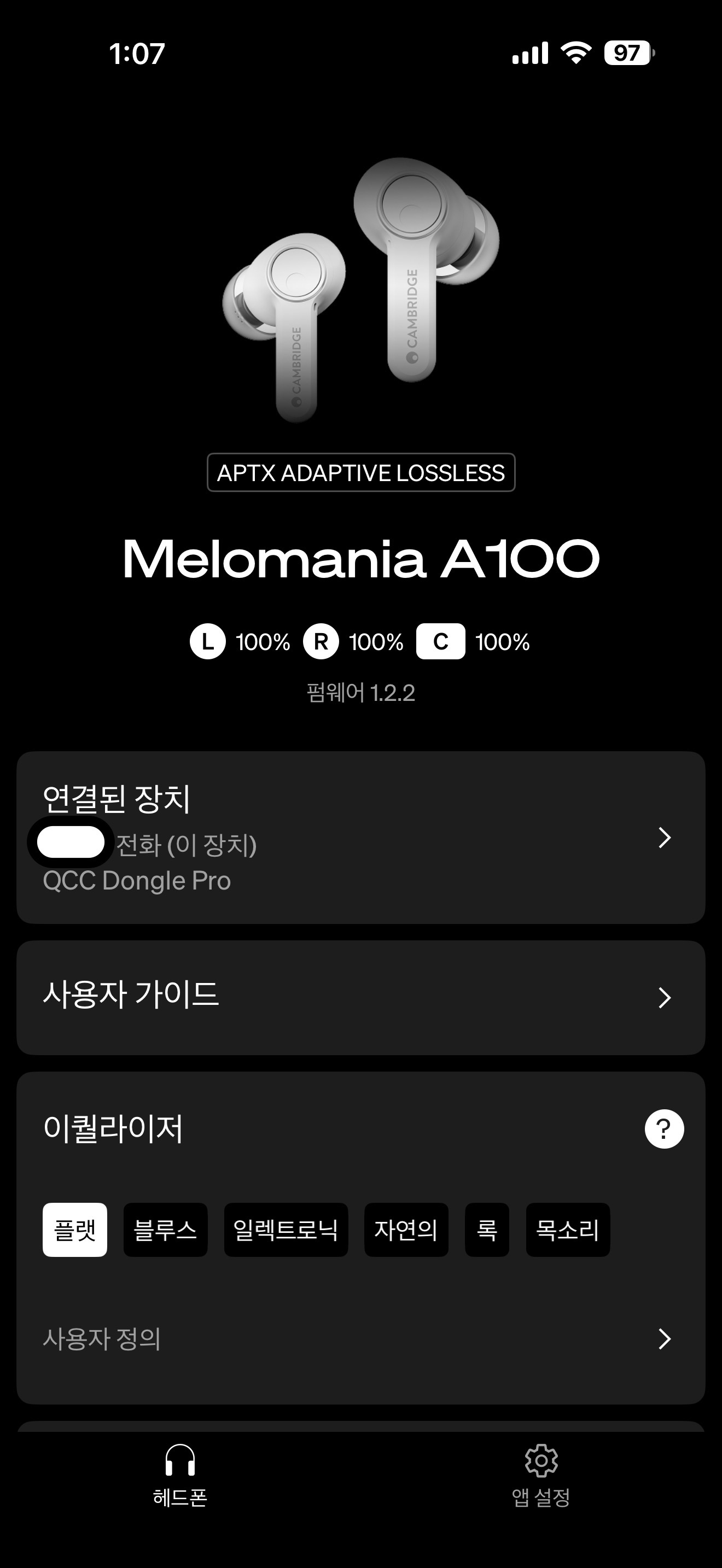 P100SE와 마찬가지로 A100역시도 QCC PRO 동글을 이용해서 연결을 하면 AptX Adaptive, AptX Lossless 로 음악을 들을 수가 있습니다. 동글에서 AptX Lossless로 전송을 시작해서 음악을 들으면 앱에도 상단에 'AptX Adaptive Lossless' 라고 표기가 됩니다. AptX Lossless의 대역폭이 LDAC보다 높기 때문에 저는 AptX Lossless가 지원되는 AptX Adaptive로 연결해서 들었습니다.