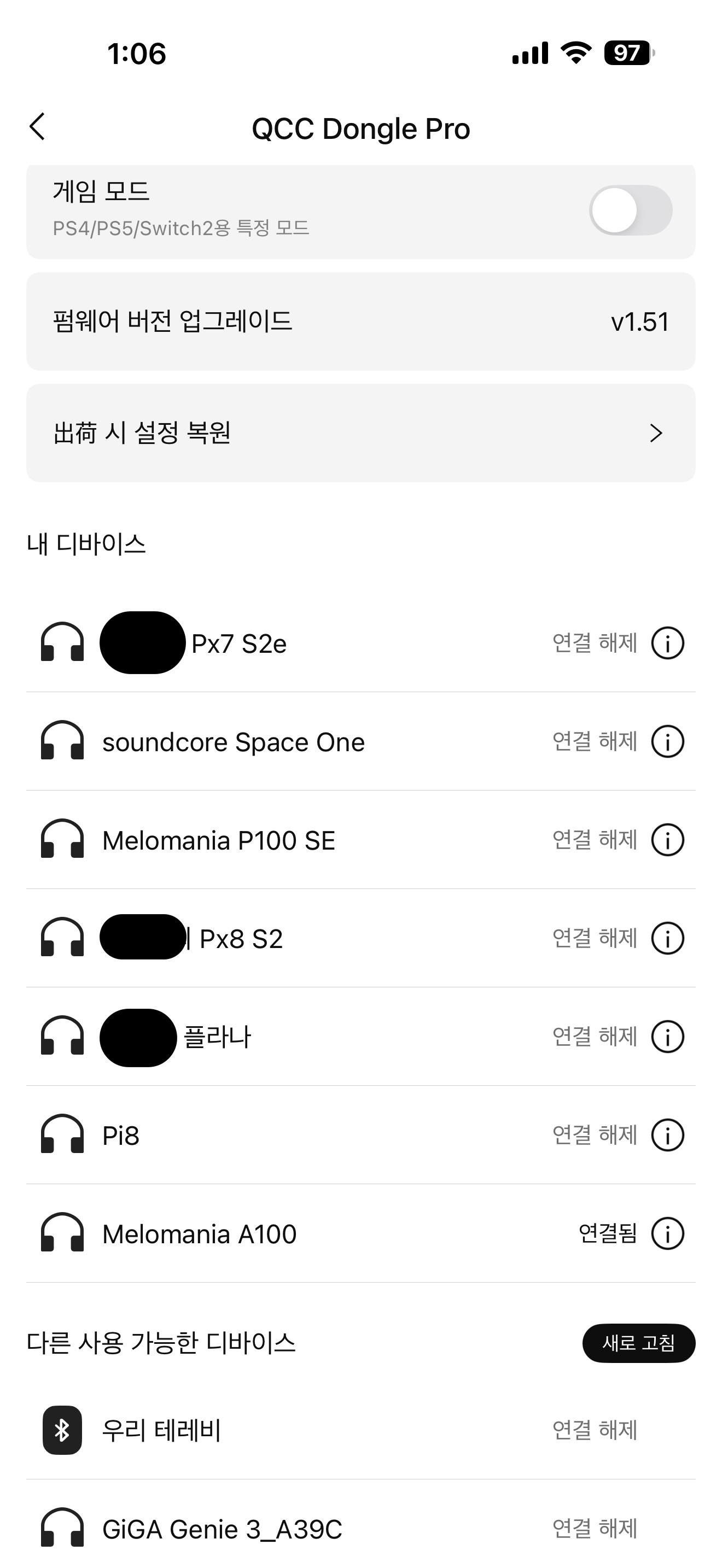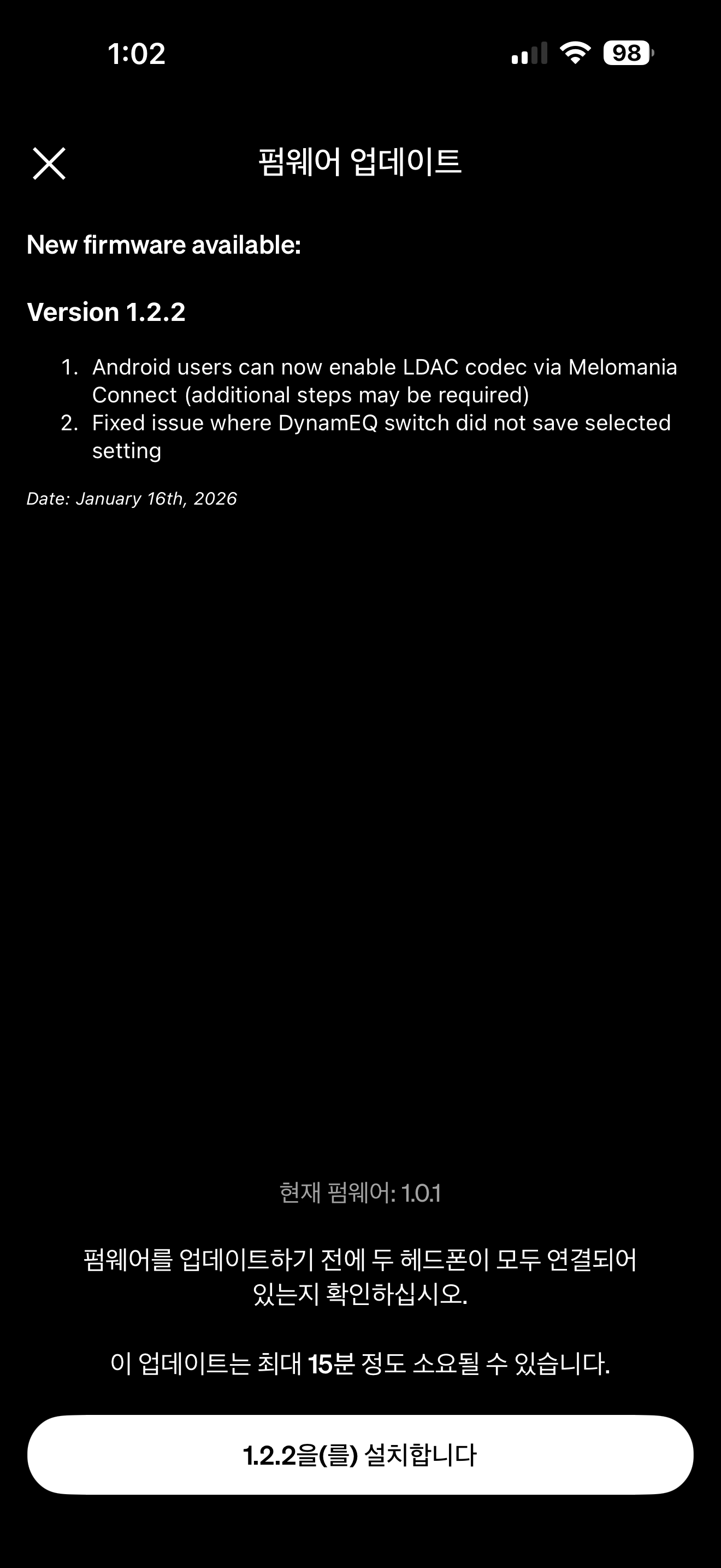 어째서인지 제품을 처음 설치하고나면 SBC 코덱으로 연결이 됩니다. 최근에는 거의 사용하지 않는 코덱이긴 합니다. 거의 블루투스 스피커에서나 쓰는 코덱인데 이어폰으로 연결된 것은 처음 봅니다. 어차피 SBC 코덱으로 쓸 일은 없으니 신경 쓰이는 부분은 아닙니다. 펌웨어 업데이트 내용이 있어서 확인해 보니 안드로이드 폰에서 LDAC이 사용 가능해졌다는 것과 다이나믹 EQ에서 설정한 것이 저장되지 않는 문제를 고쳤다는군요. 저에게는 둘 다 해당되지 않는 내용이네요. 저는 아이폰과 QUESTYLE QCC PRO 동글을 쓰고 있으며, 어지간하면 기본 설정으로 들으려고 하거든요. 그래도 안 되면 제조사에서 제공하는 프리셋을 먼저 들어 보고, 그래도 안 되겠다 싶으면 EQ질을 하는데 기본적으로 보급형 제품이 아닌 다음에는 EQ질까지 해 가면서 듣느니 그냥 다른 제품을 선택하는 편입니다. 그래도 펌웨어는 최신이 좋으니 바로 업데이트 해 봤습니다.