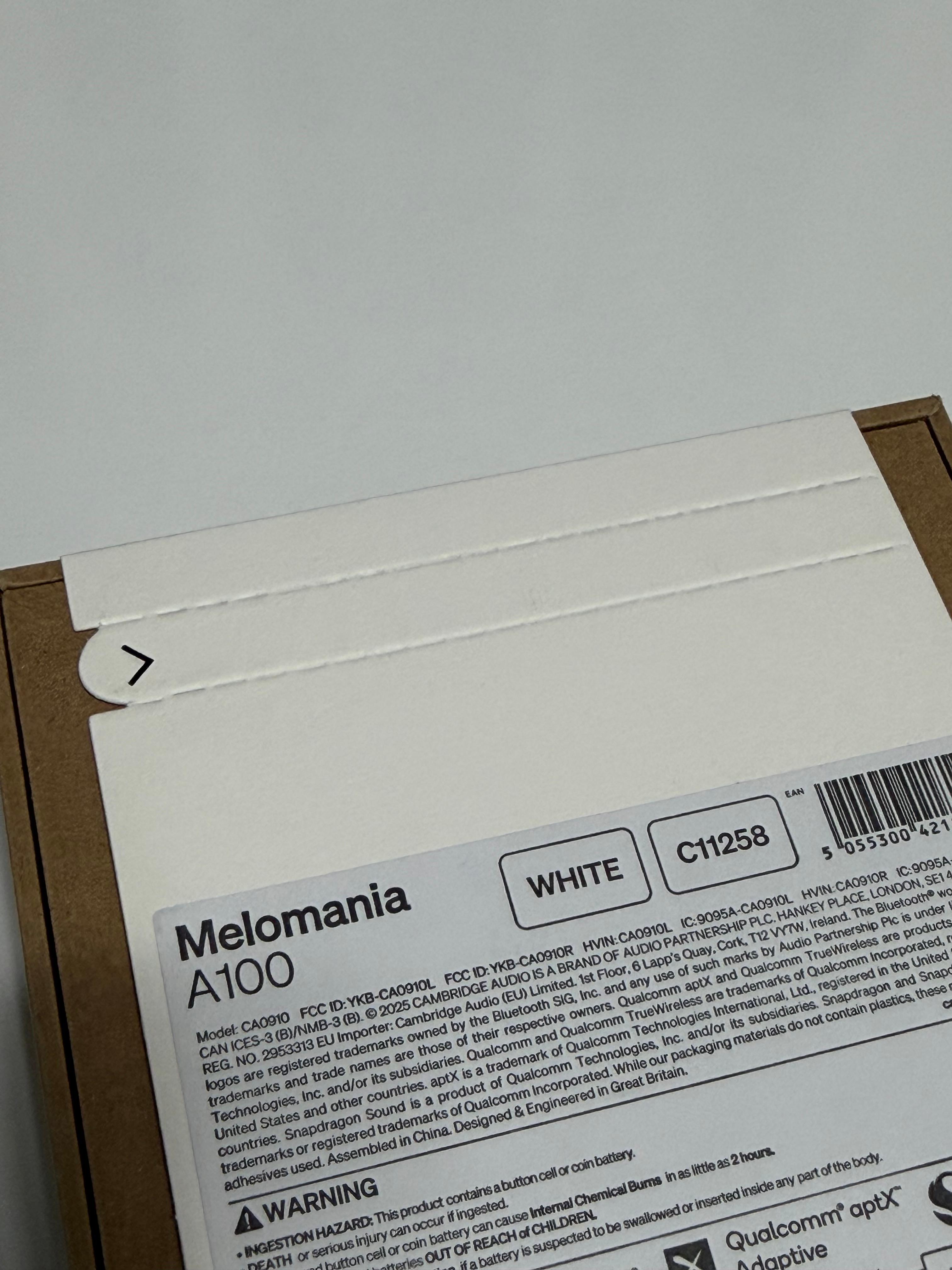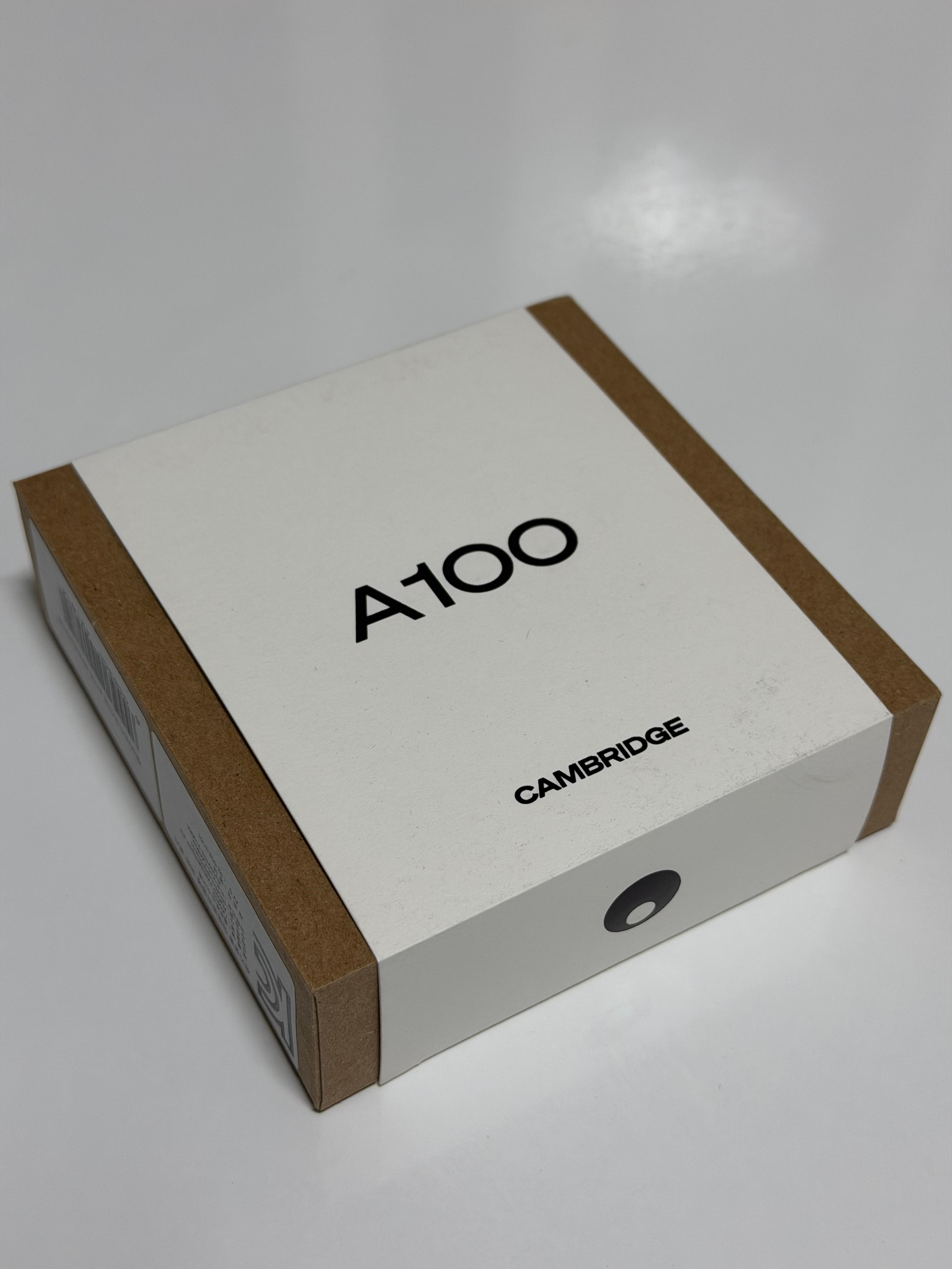 제품 상자에는 띠지가 둘러져 있습니다. 띠지를 뜯지 않으면 상자를 열어 볼 수가 없는 구조네요. 제품의 풀네임은 캠브리지오디오 멜로매니아 A100입니다. 너무 깁니다. 캠브리지오디오라는 회사명도 익숙하지 않은 사람이 많을 텐데 멜로매니아라는 무선 제품군 브랜드명까지 있으니 처음 제품을 접하는 사람들에게는 떄론 통곡의 벽이 될 수도 있겠다 싶습니다.