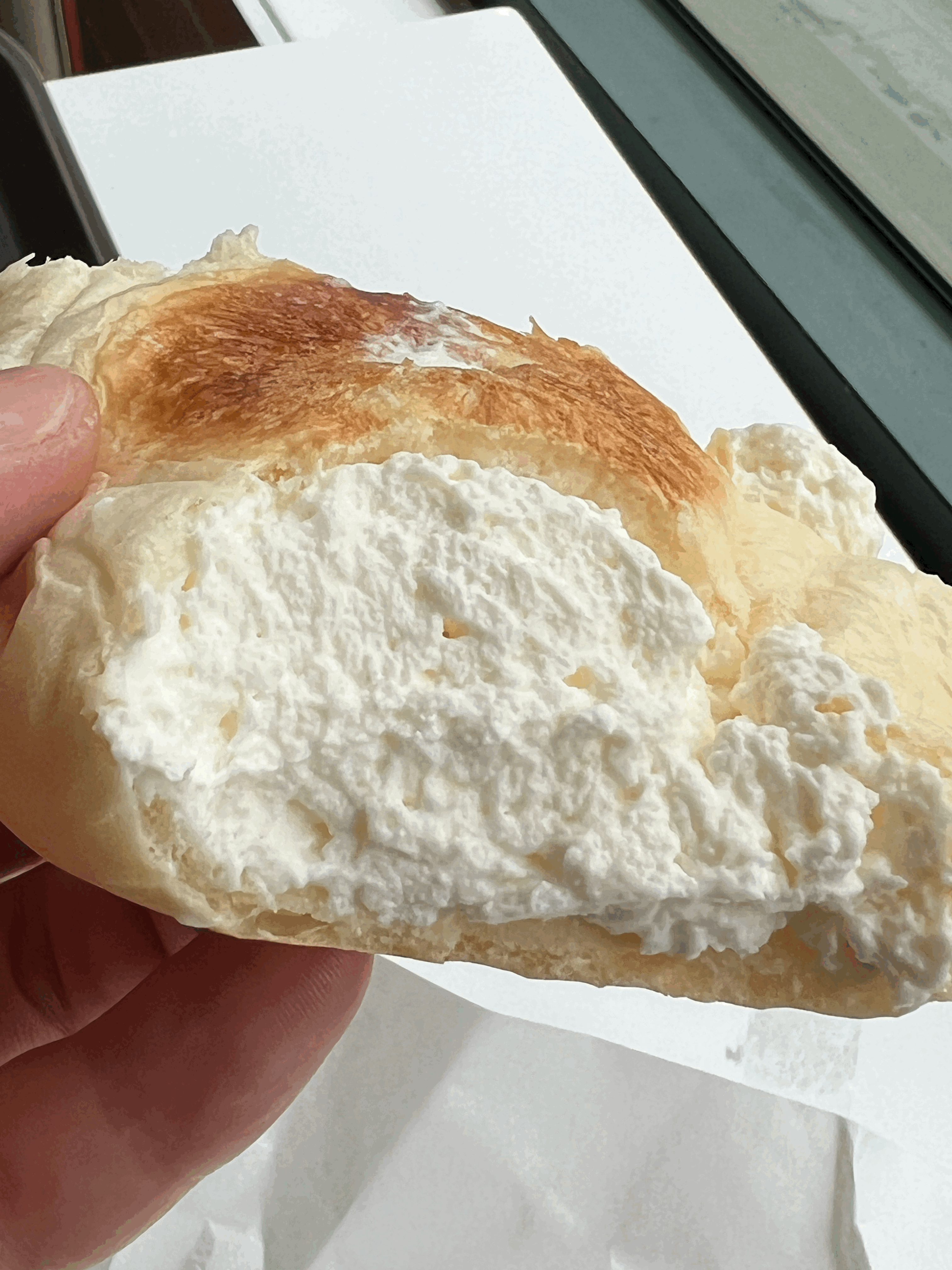 빵은 부드럽지만 약간 질긴, 쫄깃한 식감을 가지고 있습니다. 조그만 슈크림빵 같은 식감을 가지고 있습니다. 슈크림빵을 열 배쯤 덩치를 키워 만들면 이런 느낌이지 않을까 하는 생각이 들 만큼 먹는 식감 자체는 유사했습니다. 쫄깃한 식감과 부드러운 크림이 더해져서 꽤 조화롭다는 생각이 들었습니다.