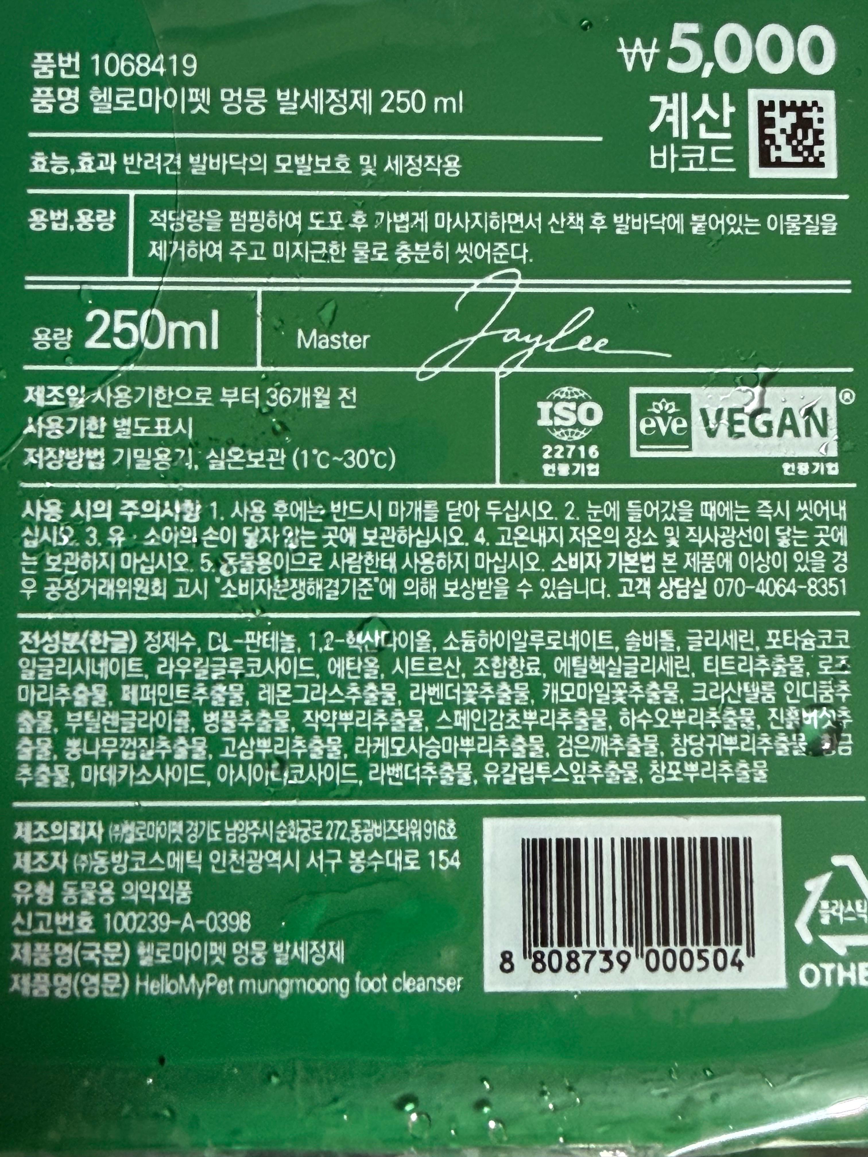 다이소 멍뭉 발세정제는 전국 방방곡곡 읍단위까지 퍼져 있는 1600개가 넘는 다이소를 통해 구입할 수 있는 반려동물용 발세정제입니다. 5천 원이라는 저렴한 가격만 내세우는 제품은 아니고, 저도 사용하고 있는 병풍추출물을 함유하고 있는 데다가 EVE VEGAN 인증까지 받은 제품이라는 특징이 있습니다. 저렴한 가격 때문에 계면활성제만 잔뜩 들어가 있는 것은 아닌가 하는 걱정을 제품 겉면에 다양한 방식으로 표기를 해 놓아 안심하고 사용할 수 있는 제품이기도 합니다.