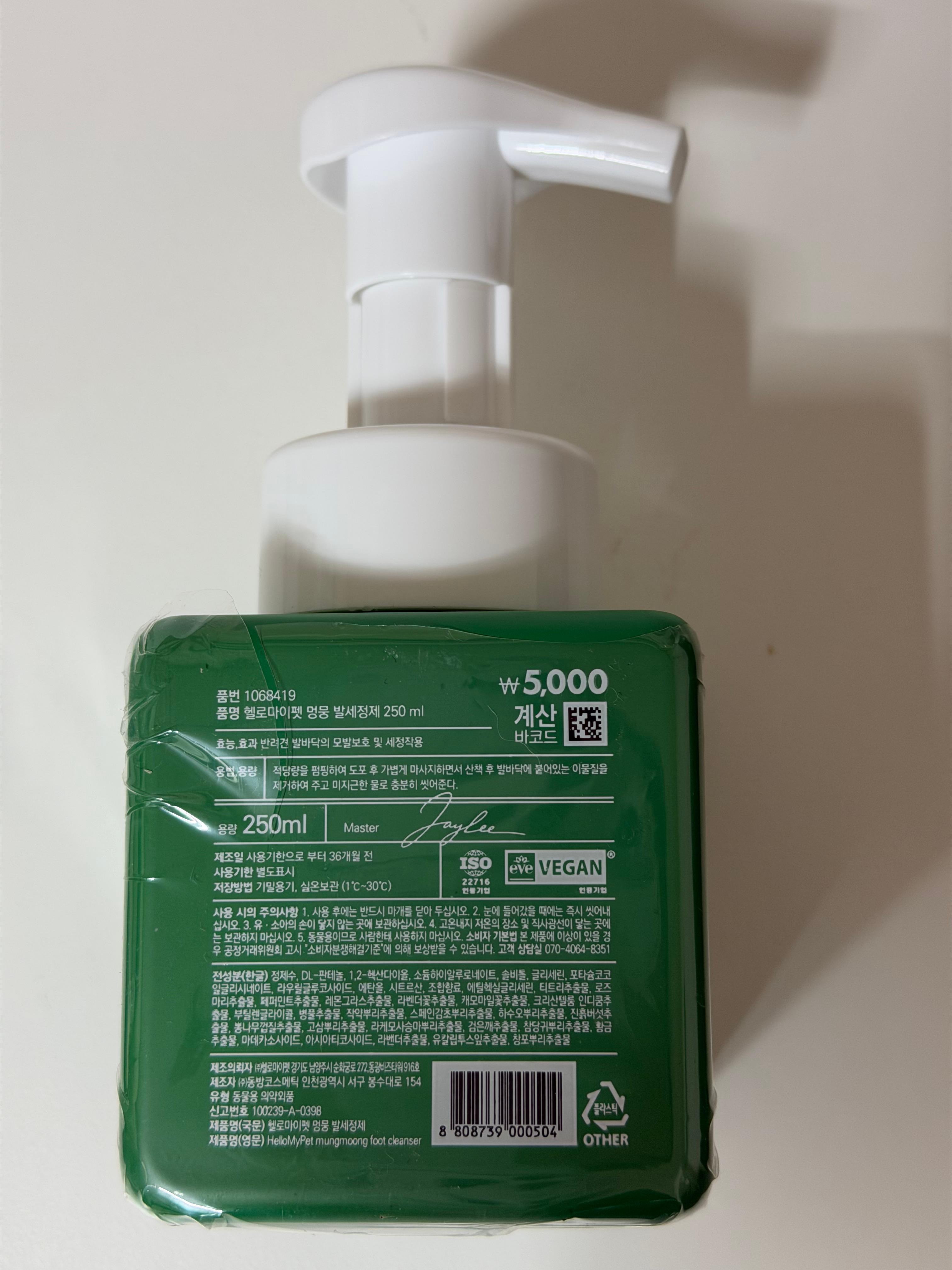 폼 자체는 발에 물을 묻히지 않아도 바로 세정할 수 있어서 워터리스 제품이라고 표기는 했지만, 결국은 세정 후에 미온수로 발의 이물질과 거품을 닦아내 줘야 하기 때문에 온전한 워터리스라고 보긴 어렵습니다. 그래도 물 묻히는 것을 최소화할 수 있어서 강아지나 고양이를 안아 들어 한손으로 닦아 줘야 하는 상항에서 한 번이라도 물 묻히는 것을 줄일 수 있다면 그 자체로는 의미가 있습니다.