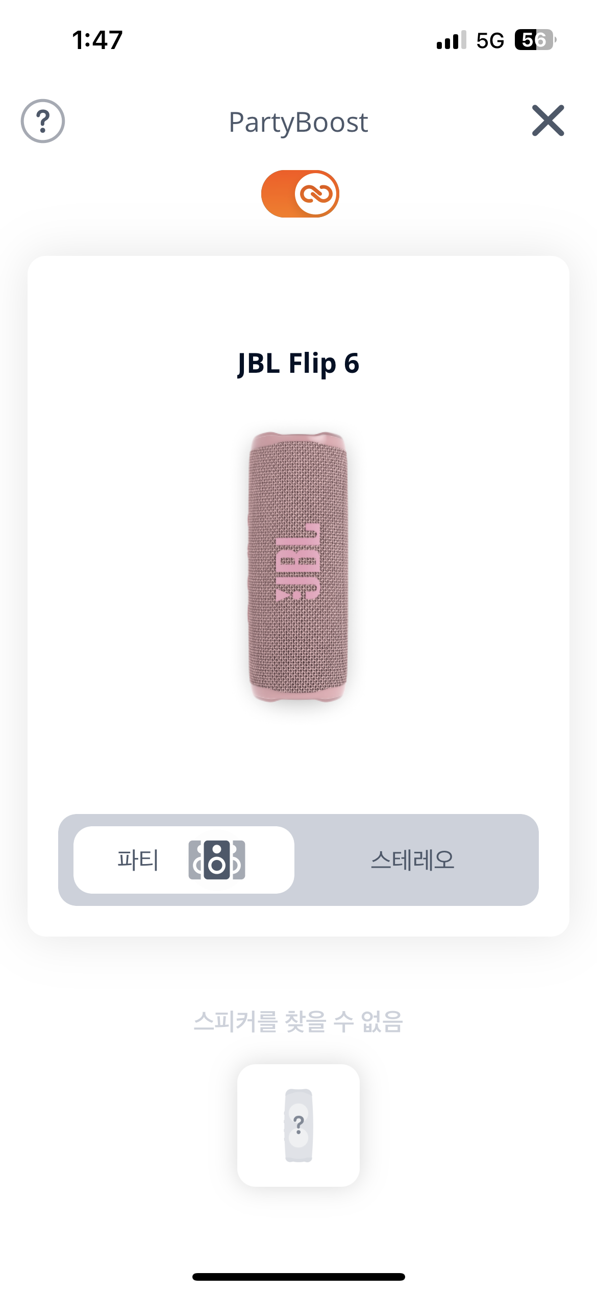 FLIP6 하나를 먼저 전원 버튼과 블루투스 버튼을 눌러서 페어링을 합니다. 물론 스테레오 구성하기 전부터 페어링은 되어 있기 때문에 전원만 넣어 주면 그 다음부터는 따로 블루투스 버튼을 누르지 않아도 됩니다. 그리고 가장 위에 있는 파티부스트 메뉴를 탭합니다.