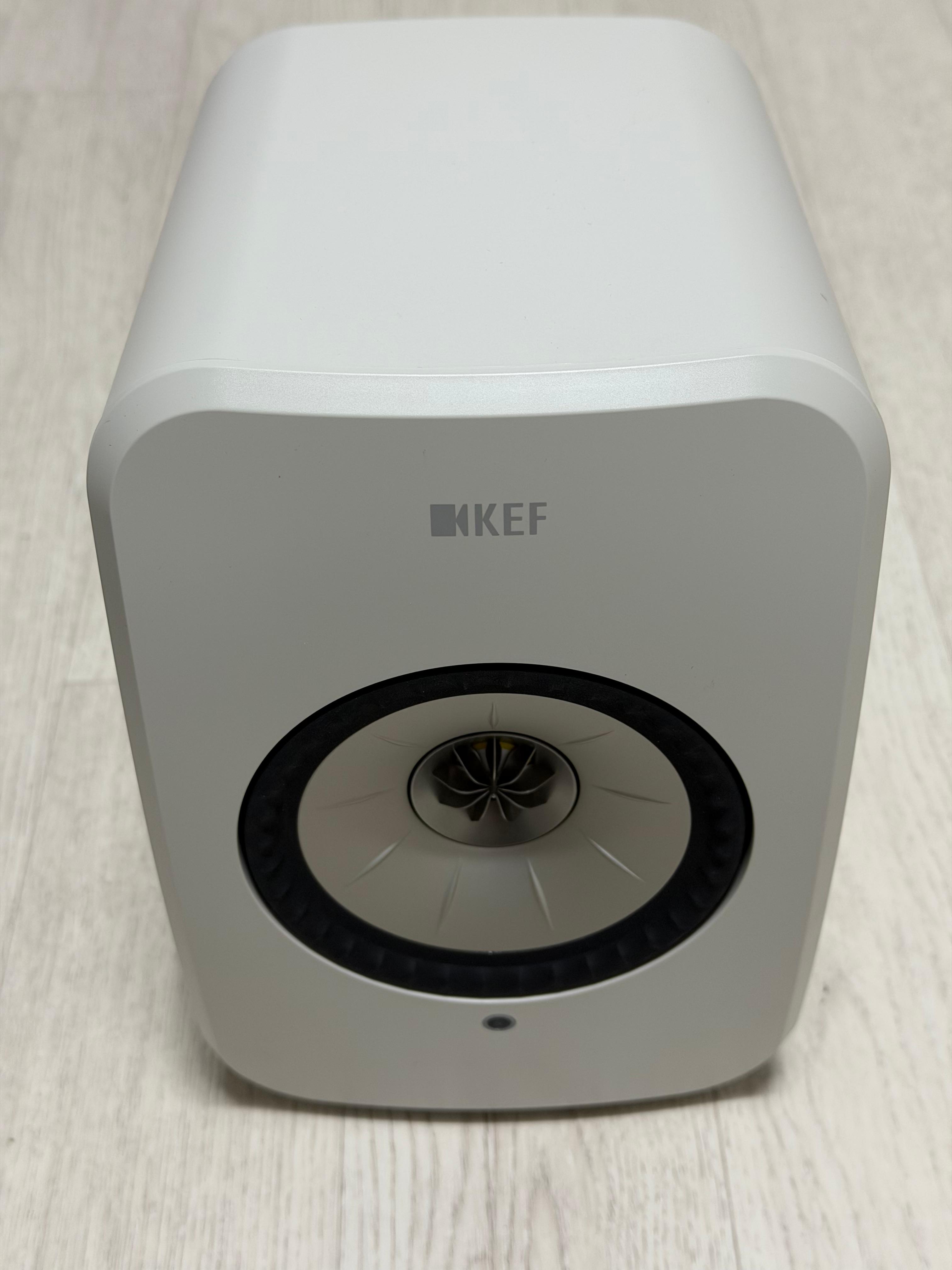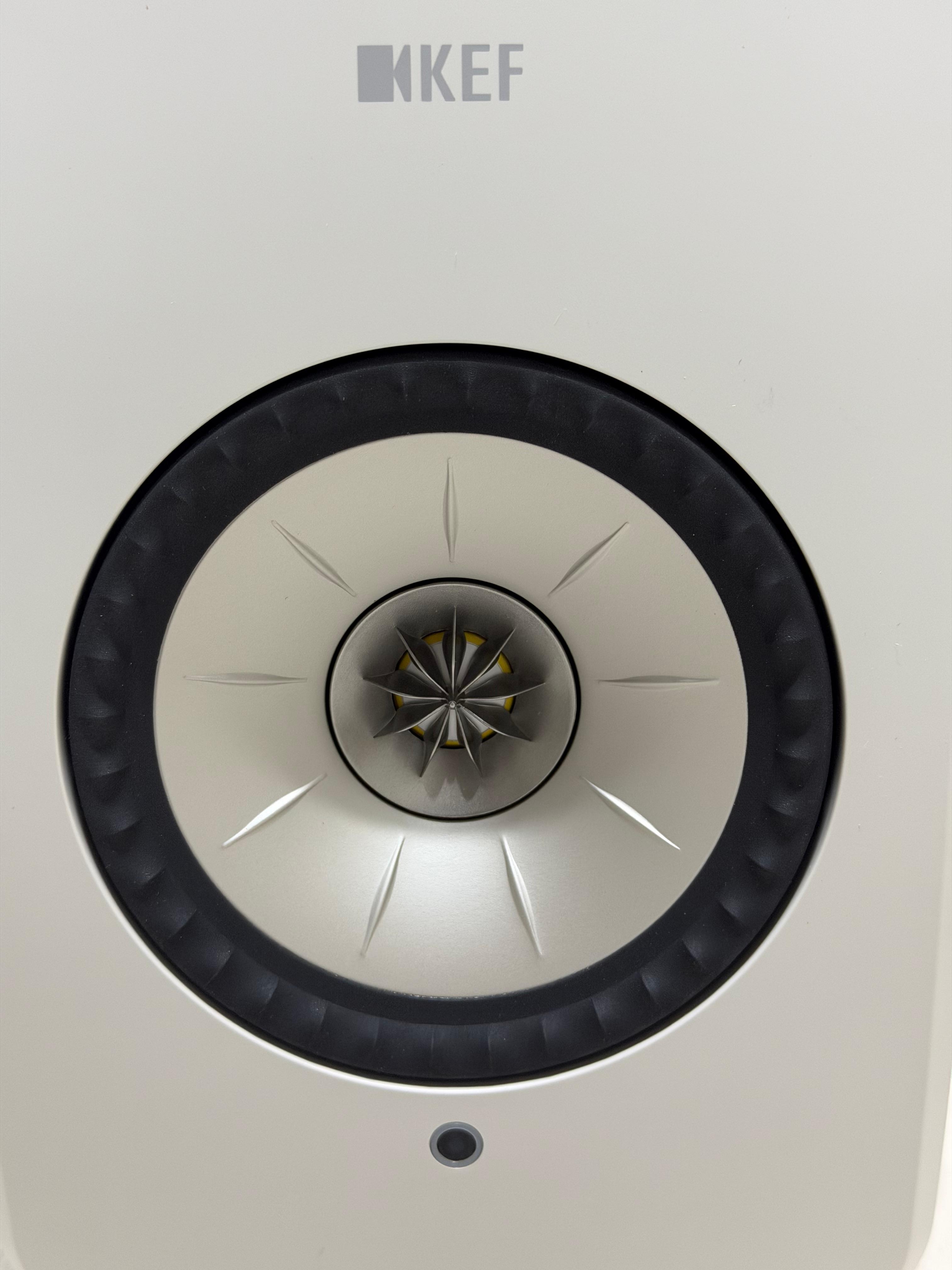 KEF의 LSX 2 LT는 하나의 미드우퍼 유닛만 있는 것처럼 거의 정가운데에 위치하고 있습니다. 그래서인지 상당히 단단하고, 강렬해 보입니다. 전면 상단에는 KEF의 로고가 인쇄되어 있습니다. 미드우퍼 안에 있는 트위터 유닛에는 수리검 모양의 날개가 보입니다. 음향과 어떤 관계가 있는지는 지식과 실력이 미천한 저의 머리에선 선뜻 떠오르지 않지만 음향에 진심인 KEF에서 단지 디자인 때문만은 아닐 거라고 추측해 봅니다.