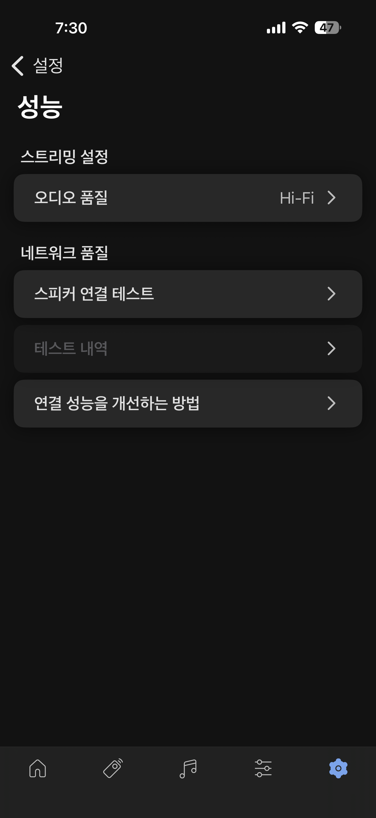 앱에는 여러 설정할 것들이 있는데 기본 상태로 써도 상관은 없습니다. 어지간한 것들은 기본 세팅이 잘 되어 있는 데다가 오디오 품질도 좋은 편이긴 한데 딱 하나 설정을 반드시 해 줘야 하는 부분이 있는데 그건 바로 '스피커 음량 간격' 입니다. 이건 꼭 1로 해 주세요. 10으로 하면 소리 한 칸 올리면 10단계가 높아져서 이웃에 민폐 캐릭터가 됩니다. 네트워크 스피커인 것을 확인할 수 있는 핑 테스트도 있는 건 재밌네요.