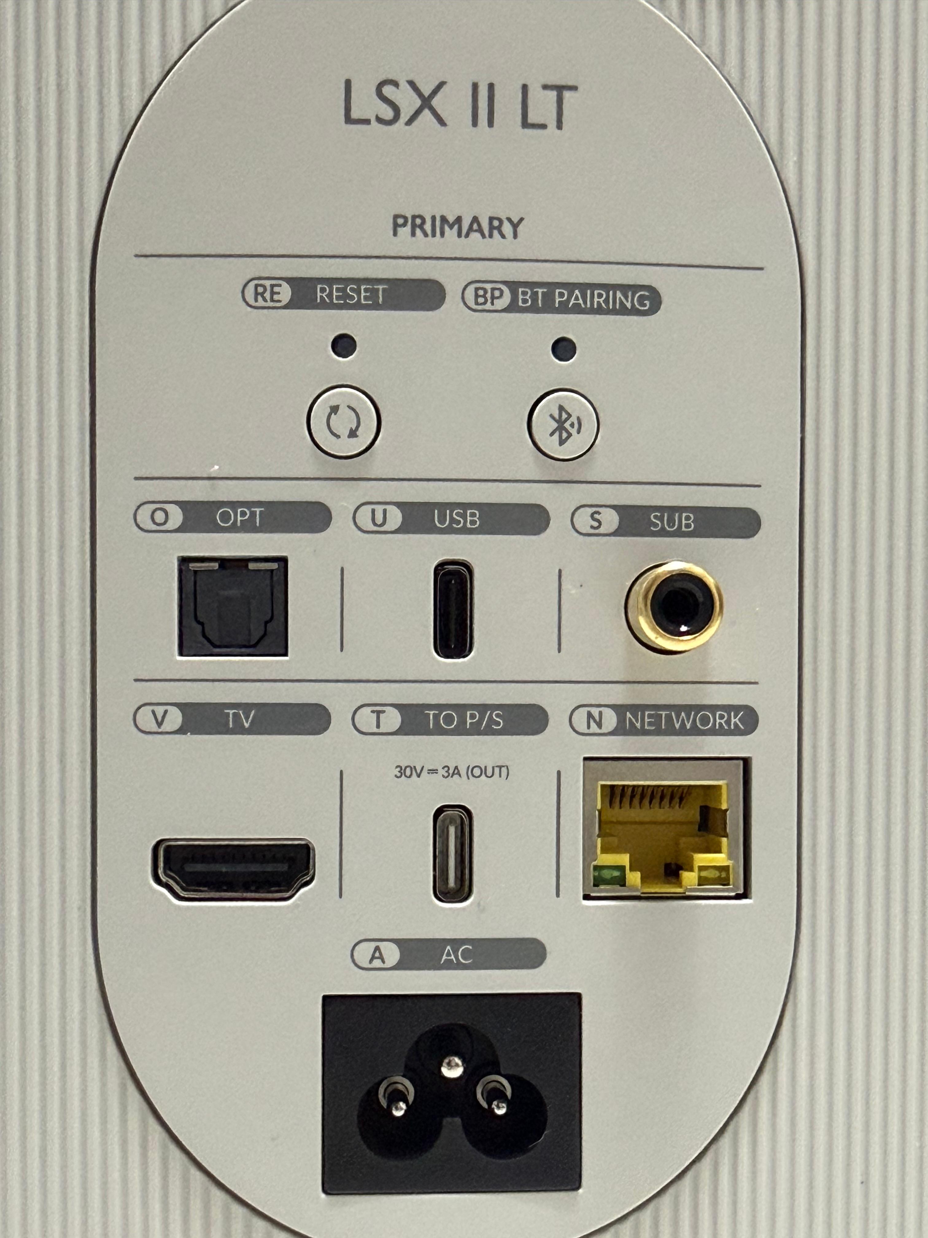 오른쪽 유닛에는 상단에 리셋 버튼과 블루투스 페어링 버튼이 있고, 그 아래에 Optical, USB C, HDMI, Ethernet 입력 단자가 있습니다. 그리고 순서에 상관없이 출력단자로 서브우퍼 출력, 왼쪽 스피커로 가는 USB C 출력 단자도 있습니다. 왼쪽 스피커는 USB C 입력 단자 하나만 있어서 깔끔합니다. 30V, 3A의 입력으로 총 90W의 전원 입력을 받는데 이 제품의 출력 스펙이 100W+100W 인데 90W를 입력 받아서 어떻게 100W를 출력한다는 건지 역시 문과생인 저로서는 당최 알 수가 없습니다. 음향에 진심인 KEF가 스펙 가지고 장난칠 리가 없으니 그냥 제 상식이 잘못된 걸로 하겠습니다.