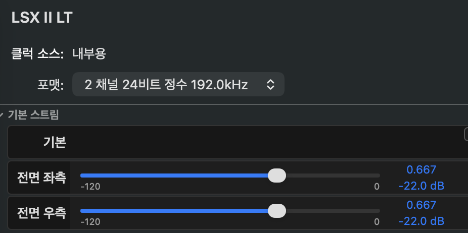 맥북에서 확인한 스피커 내용입니다. LSX 2 LT는 USB 연결 모드와 네트워크 연결 모드가 아이콘 모양과 이름이 다르기 때문에 헷갈리지는 않습니다. 위에 있는 것이 USB 연결, 아래에 스피커 모양으로 생긴 게 네트워크 모드입니다.