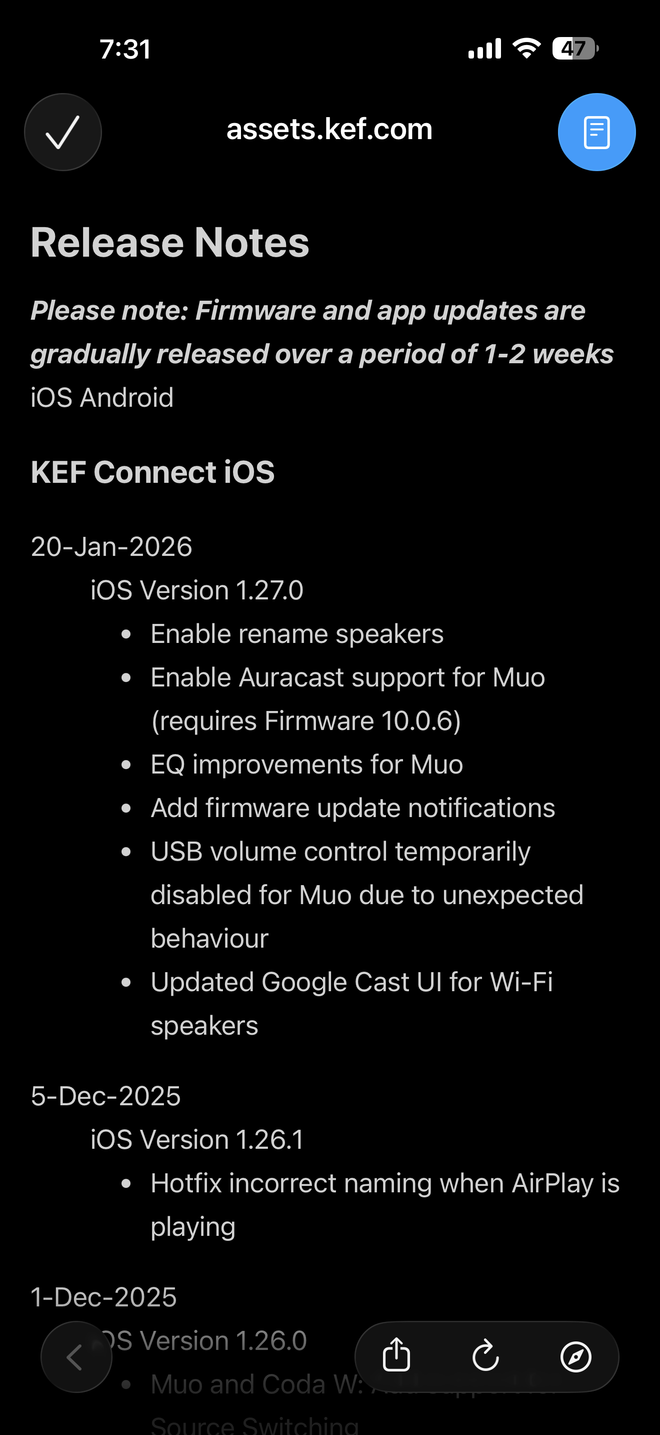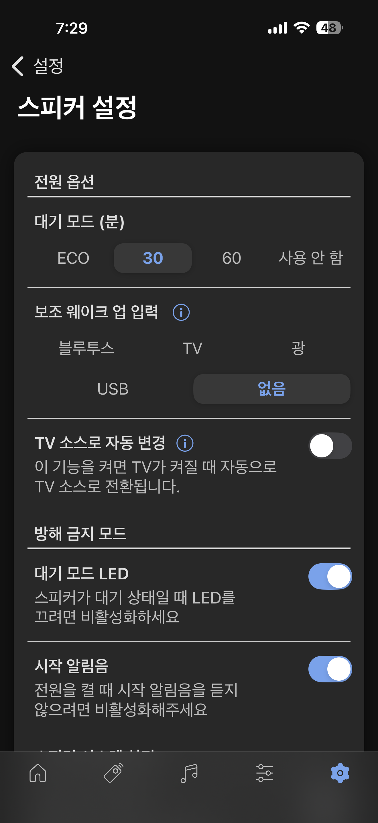 역시나 LSX 2 LT도 앱에서 연동이 되자마자 업데이트 메시지가 뜨네요. 이번에는 MUO의 전철을 밟지 않겠다는 생각 때문에 업데이트를 일단 보류하고 음악을 실컷 들었습니다. 그리고나서 결국 업데이트를 하기는 했습니다. 다행히 MUO와는 달리 업데이트하면서 문제는 발생하지 않았습니다.
