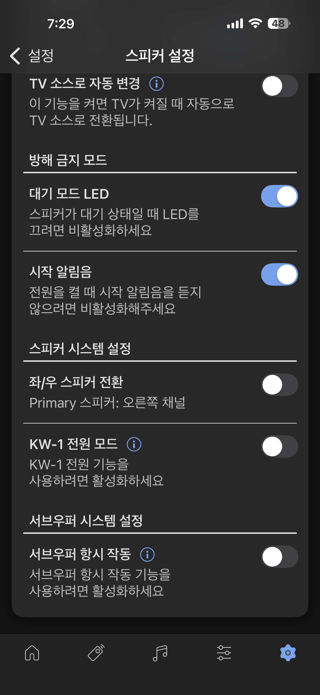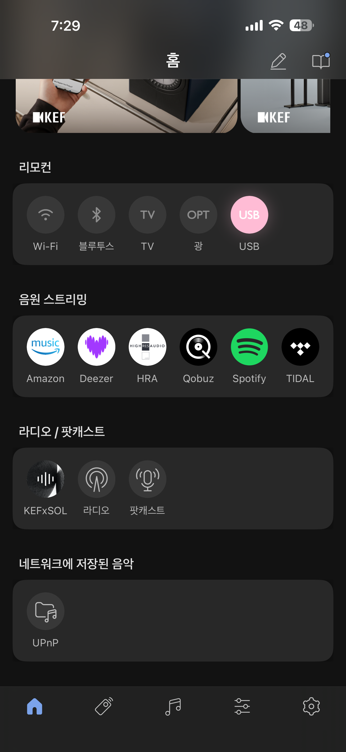 LSX 2 LT의 앱은 얼마 전에 구입했다가 업데이트 오류로 반품했던 MUO와 같은 것을 사용합니다. 앱의 문제인지 처음 스피커를 꽂고 네트워크 연결이 되지 않아 한참을 헤맸는데 일단 스마트폰에 연결된 와이파이를 2.4GHz로 변경을 해야 하더군요. 지난 번 강아지 자동 급식기에서도 겪었던 문제인데 KEF도 같은 문제가 있으니 참 거시기 했습니다. 다른 기기들은 2.4GHz, 5GHz 대역폭 모두를 사용하고 있어서 어느쪽에 연결되어 있어도 상관없이 자동으로 붙는데 KEF는 2.4GHz 대역폭만 사용하는군요.