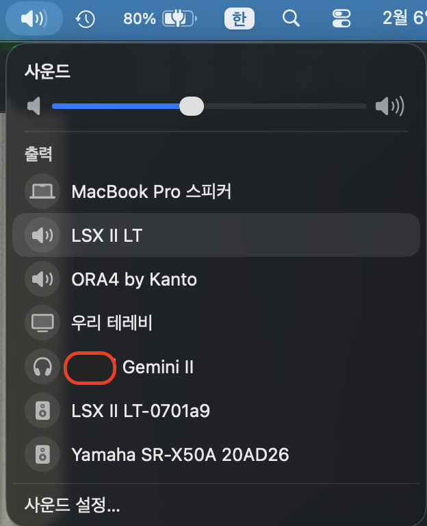 맥북에서 확인한 스피커 내용입니다. LSX 2 LT는 USB 연결 모드와 네트워크 연결 모드가 아이콘 모양과 이름이 다르기 때문에 헷갈리지는 않습니다. 위에 있는 것이 USB 연결, 아래에 스피커 모양으로 생긴 게 네트워크 모드입니다.