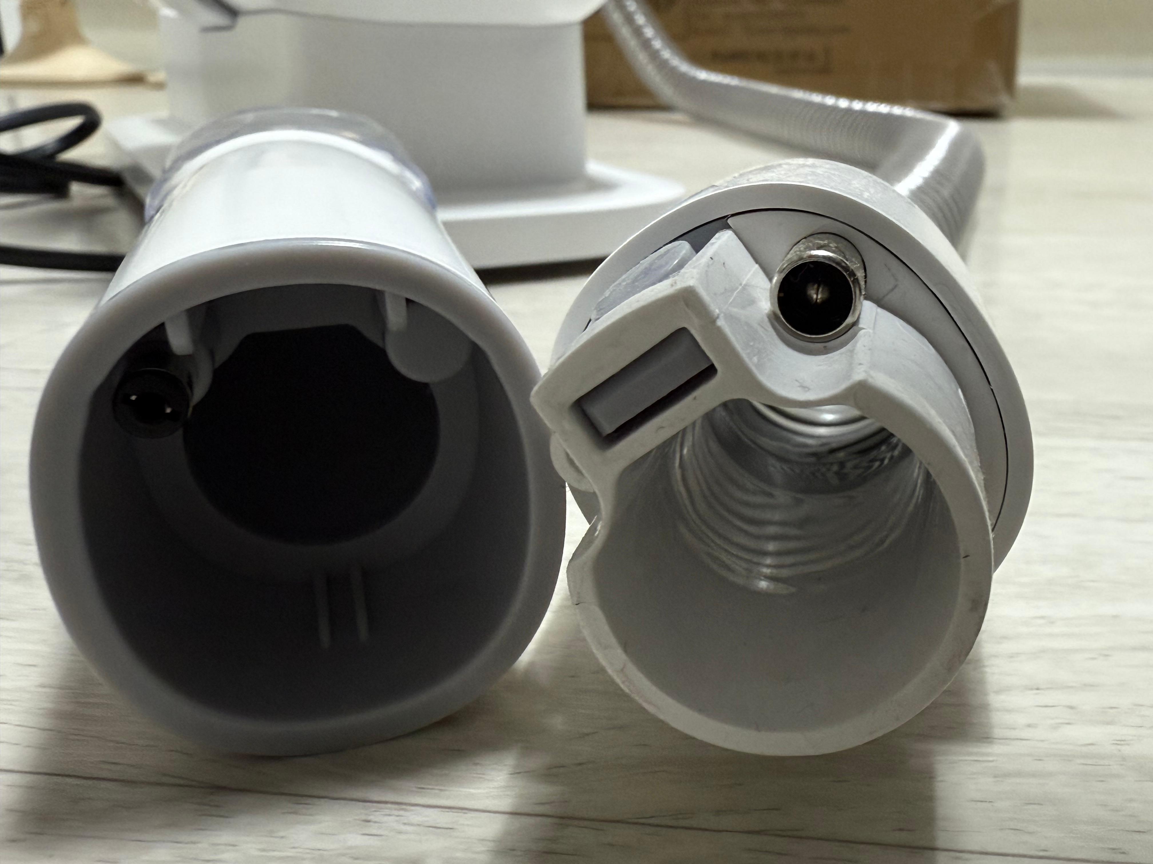 미용기구 부분은 다른 미용기와 거의 차이가 없습니다만 바로 아래에 공기와 함께 털을 빨아들이는 공간이 존재합니다. 기본은 미용기이고, 원하는 털의 길이를 조절할 수 있는 가이드가 4종류 들어 있어서 원하는 수준에서 미용을 할 수 있습니다. 저는 가장 짧은 길이로 선택을 했습니다. 가이드 없이 '삭발'을 하게 되면 강아지 이중모가 사라져서 털이 상당히 안 예쁘게 나게 되어 강아지도 스트레스를 받으니 적당한 길이로 잘라 주는 게 매우 중요합니다.