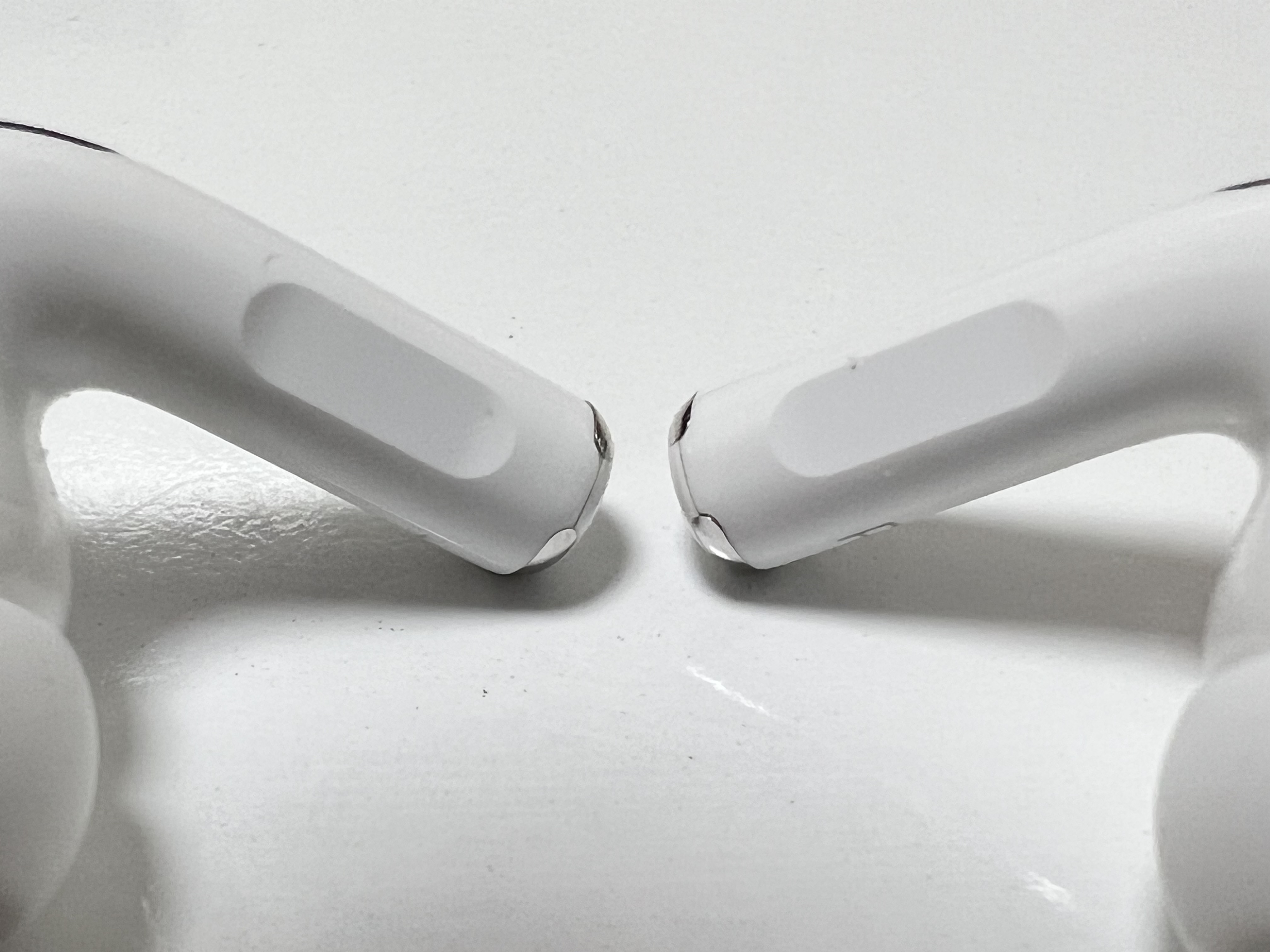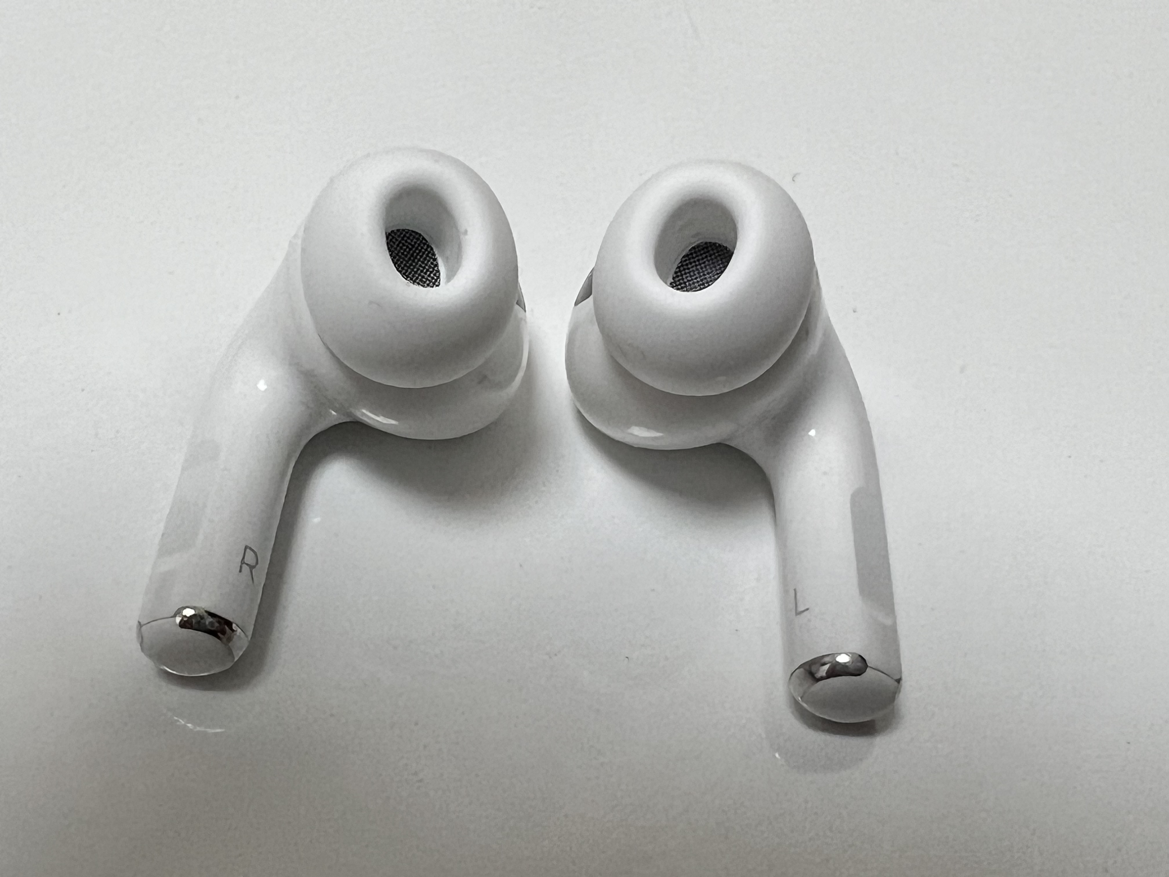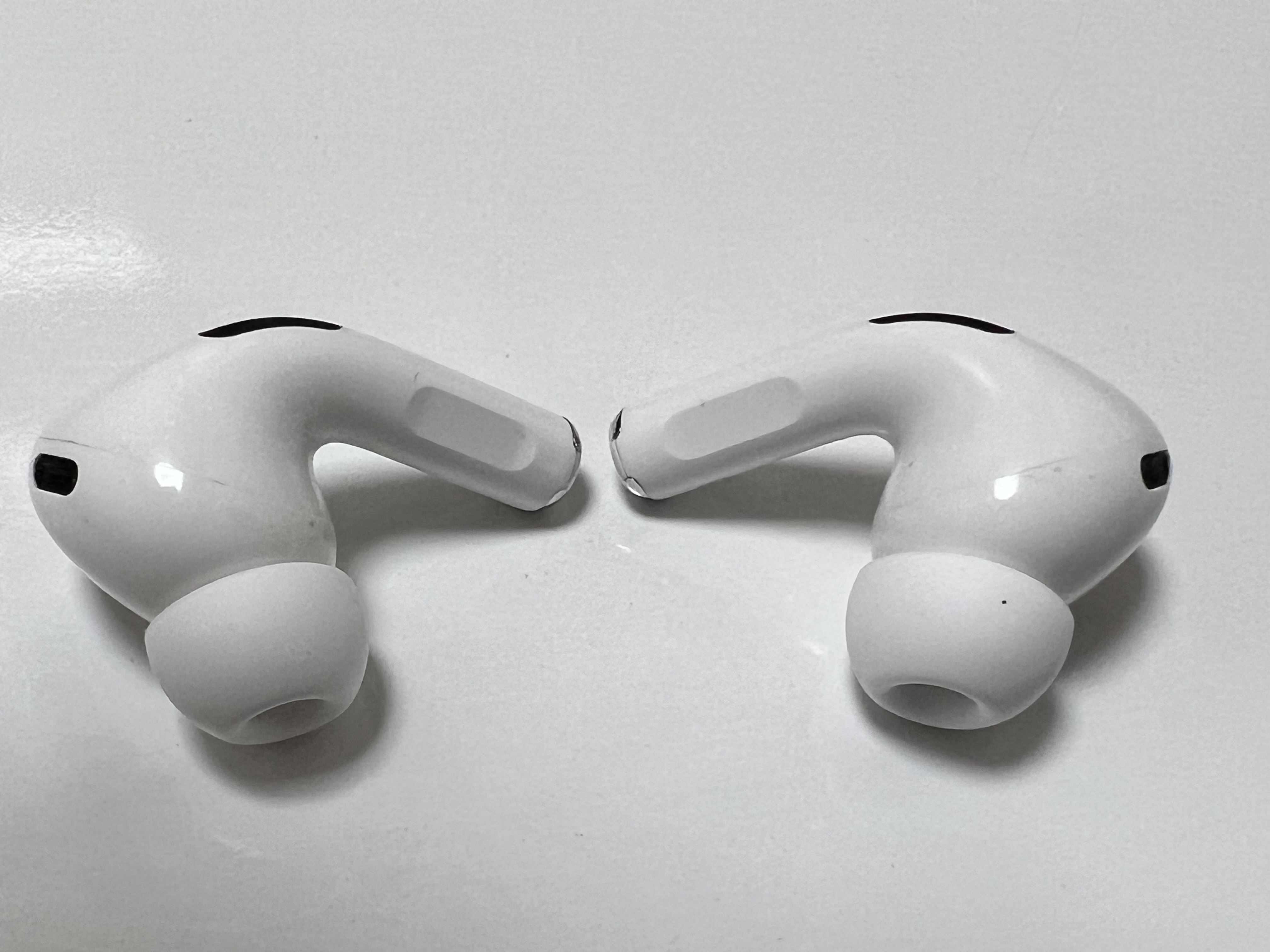 이어폰 자체는 기존 에어팟 프로와 거의 차이가 나지 않습니다. 나란히 놓고 비교하지 않으면 어떤 게 1세대고 어떤 게 2세대인지 알아채기 쉽지 않을 것 같습니다. 이어팁은 타원형이고 그 안에 플라스틱 결합부가 내장되어 있기 때문에 원래 꽂아야 하는 방향에서 10도 이상만 틀어지면 귓구멍이 많이 아픕니다. 착용에 주의가 필요합니다.