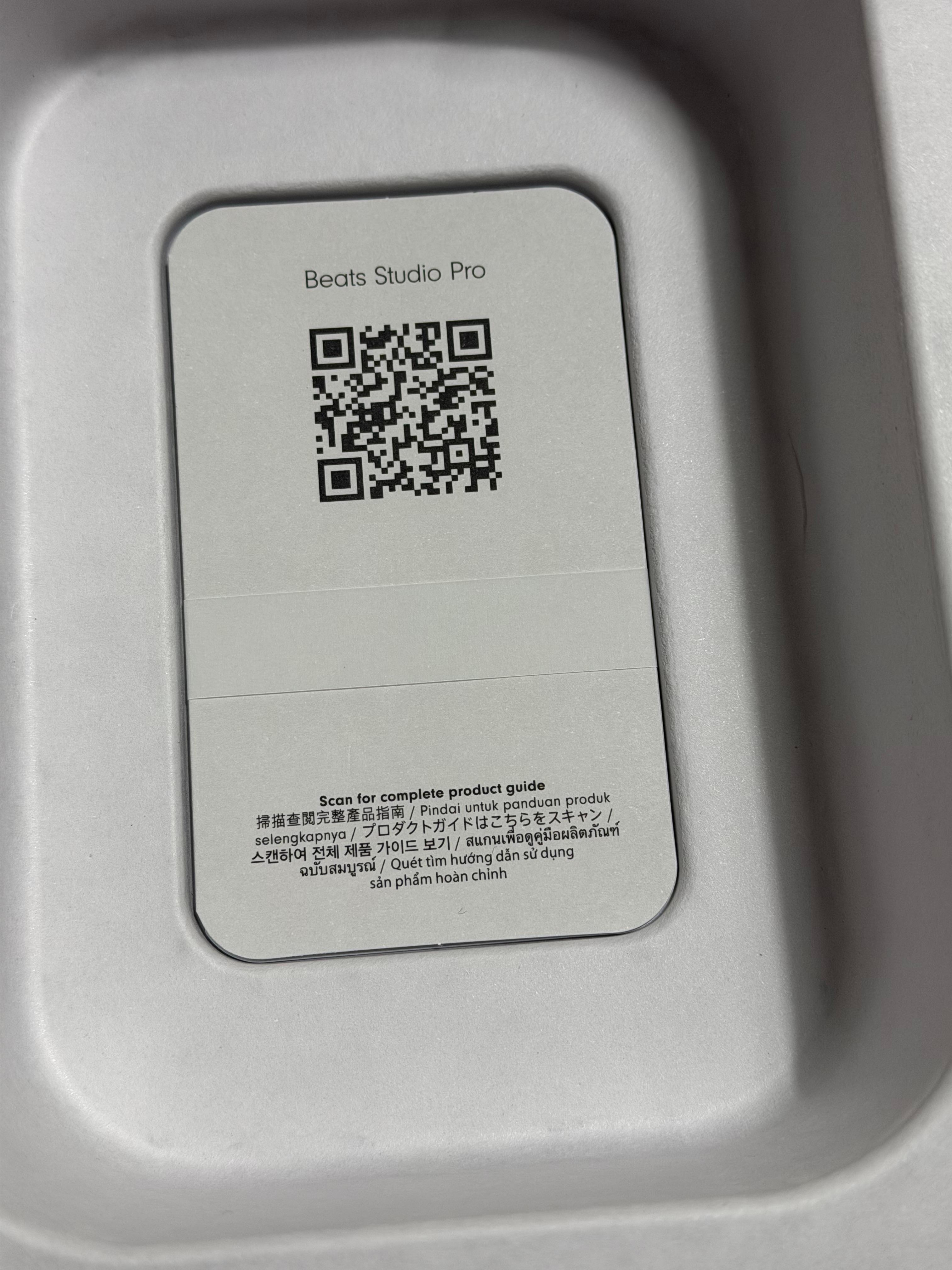 애플 비츠 스튜디오 프로는 종이로 된 상자 위에 음각으로 디자인을 새기고 그 위에 반투명 트레이싱지를 둘러서 포장을 했습니다. 트레이싱지에는 제품의 디자인이 색상까지 인쇄되어 있어서 깔끔한 느낌을 줍니다. 트레이싱지를 벗기면 종이 상자 뚜껑을 열 수가 있고, 그 안에 소프트 캐링 케이스가 들어 있습니다. 케링 케이스를 꺼내고 나면 그 안 깊숙하게 문서가 들어 있네요.