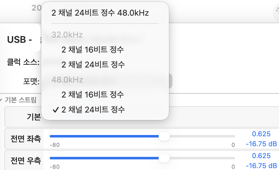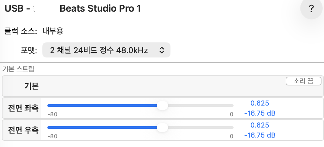 맥에서 USB C 연결을 해 보았습니다. 24비트 48KHz로 동작합니다. 무손실 음악을 듣기 위해서는 이 정도로도 충분하기는 하지만 최근 애플뮤직의 음원이 24/96, 24/192 라는 높은 비트레이트를 지원하고 있는데 헤드폰에서 24/48밖에 안 되는 건 다소 아쉽게 느껴집니다.