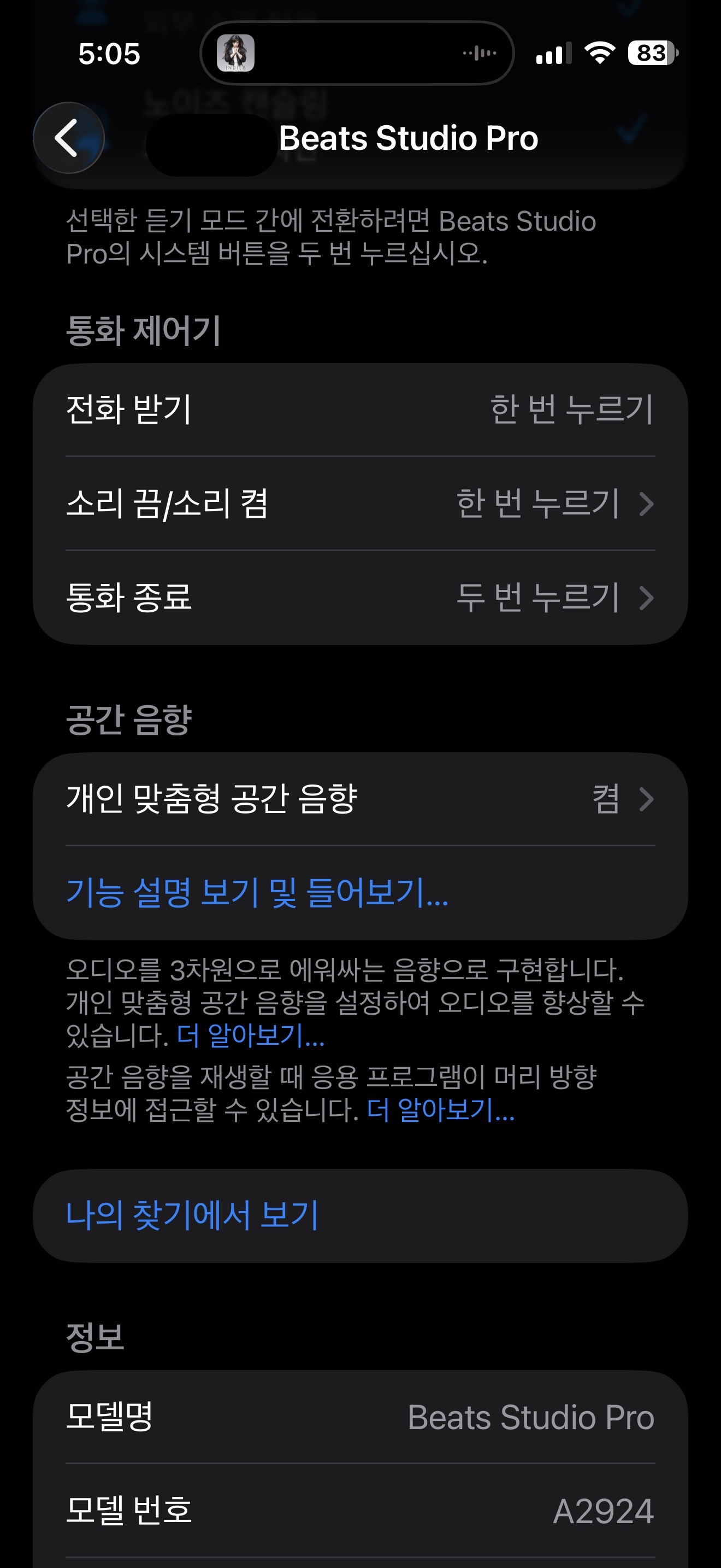 공간음향은 반드시 켜야 합니다. 공간음향을 끄면 소리의 공간감이 말도 안 되게 확 좁아집니다. 애플 제품은 역시나 공간음향을 켜는 게 기본값이 분명합니다.