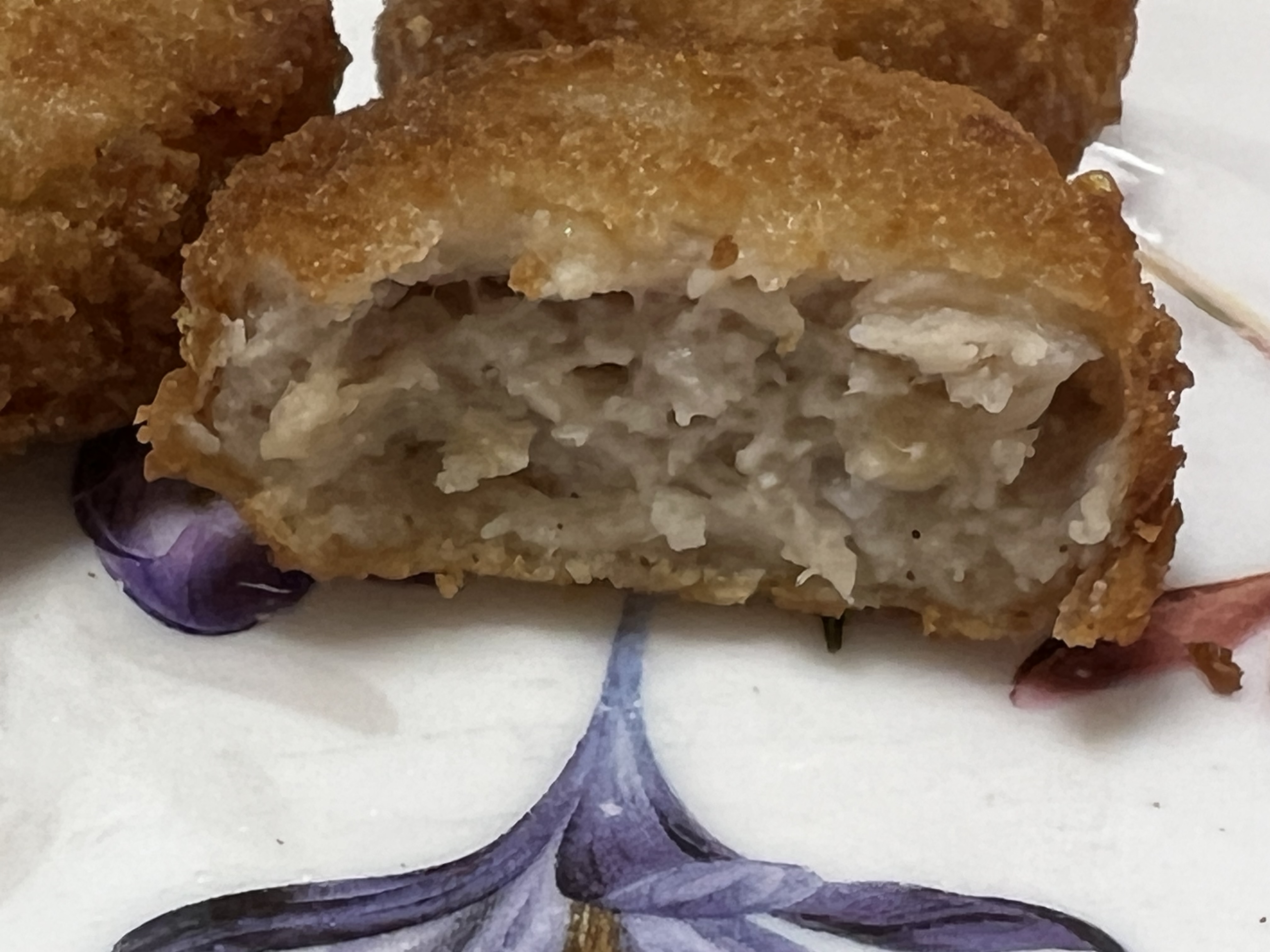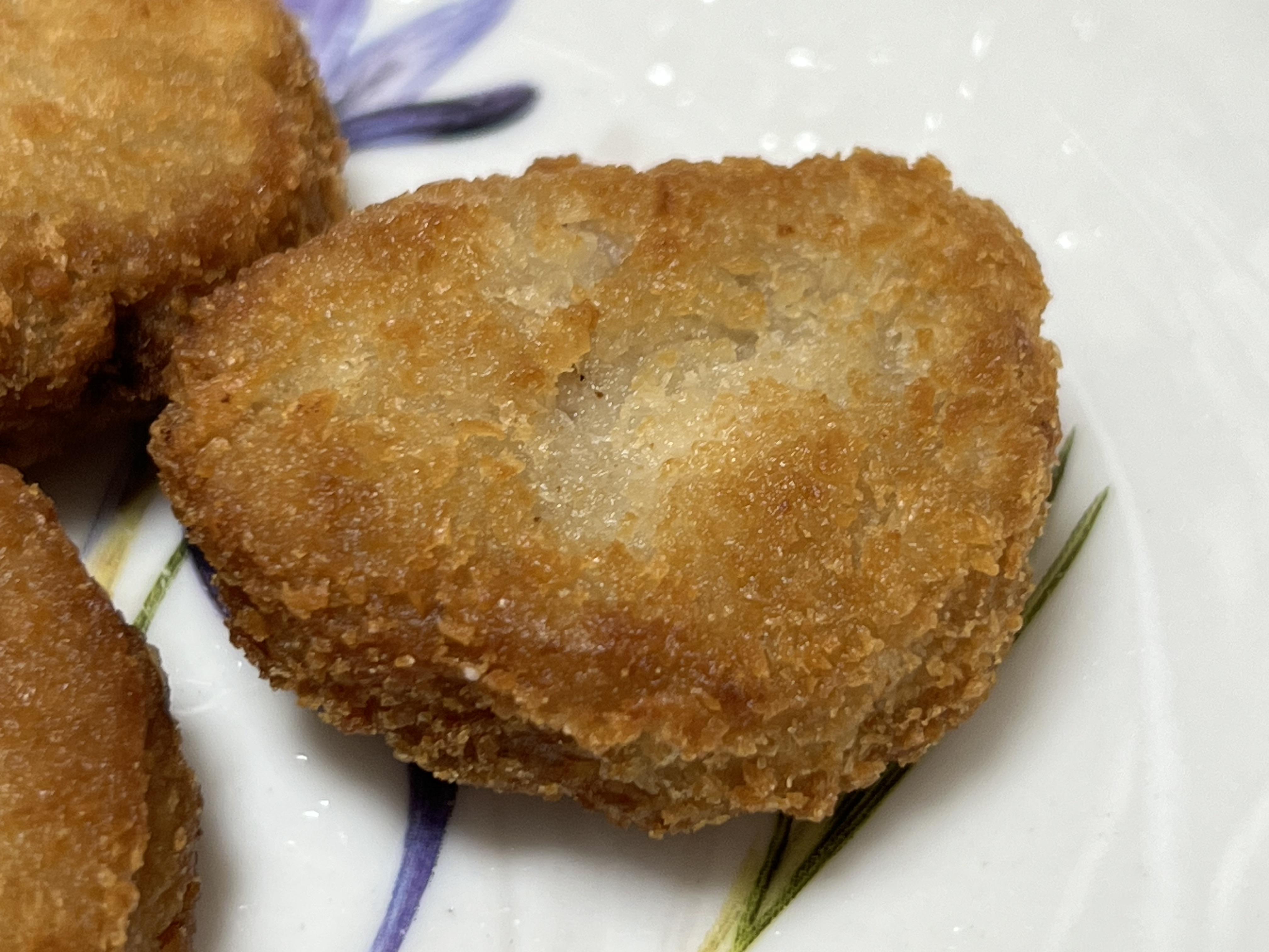 곰곰 한입 돈까스의 내부는 다진 고기가 들어 있네요. 검은 점은 후춧가루인 걸로 보입니다. 작은 한입 크기라고 해서 통고기일 거라곤 생각하진 않았지만 너무 다져놔서 고기의 씹는 맛은 전혀 느껴지지가 않네요. 고기맛은 나지만 진짜 돈까스처럼 진짜 고기는 아닌 만큼 구입에 참고하시는 게 좋겠네요.