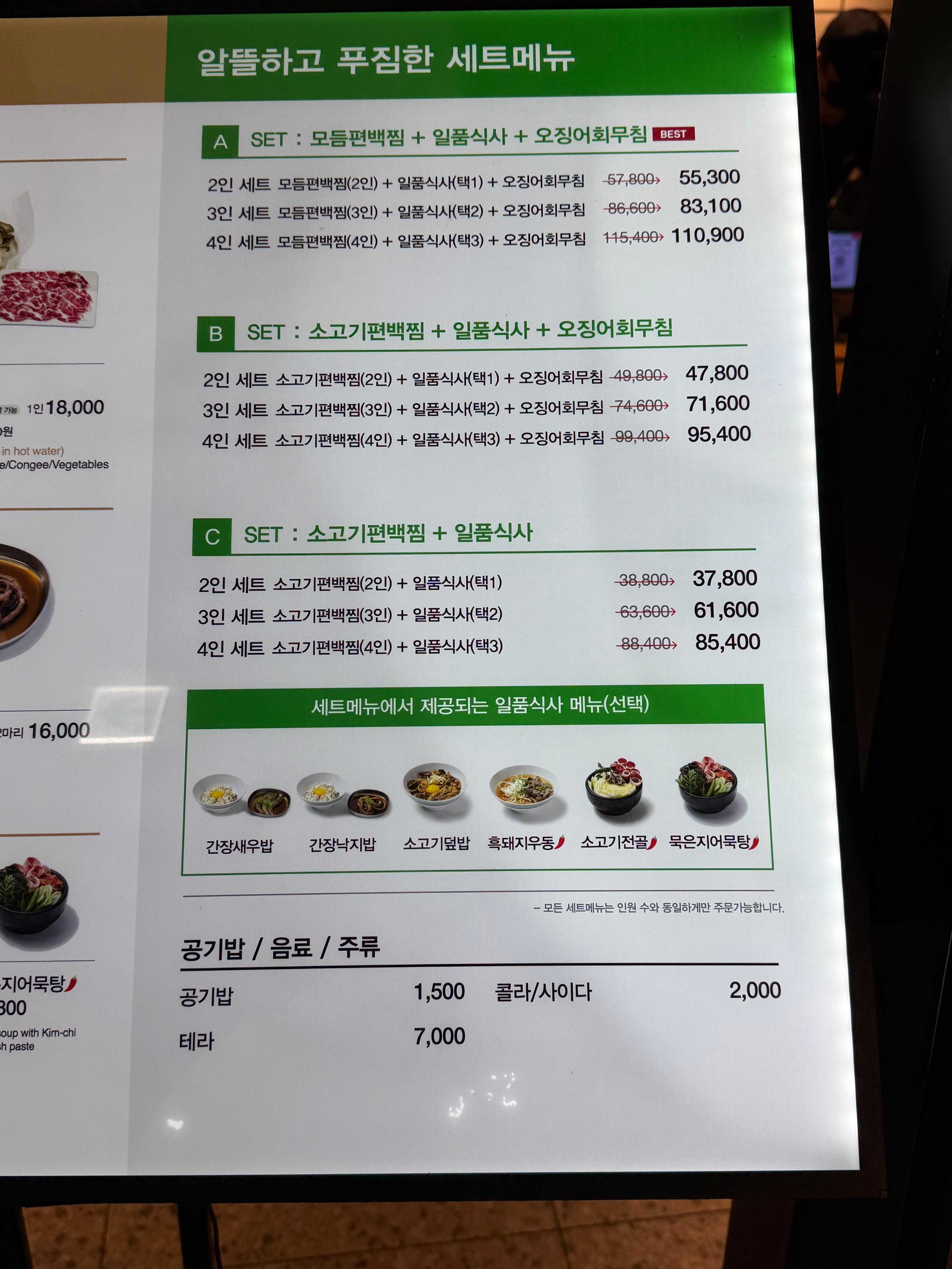 단품메뉴의 가격은 그다지 비싸지 않았습니다만, 양 자체가 많지 않다 보니 시선은 자연스레 세트메뉴로 가더군요. 저와 여자친구는 오징어회무침이 필요 없었기 때문에 C 세트에 간장새우밥을 옵션으로 선택했습니다. 가격은 37,800원입니다. 비싸다고 할 수도 있겠으나, 간장새우장이 나오고 소고기찜도 있었기 때문에 충분히 납득 가능한 수준의 가격이었습니다. 여기는 '집값도 드럽게 비싼' 용산이기 때문입니다.