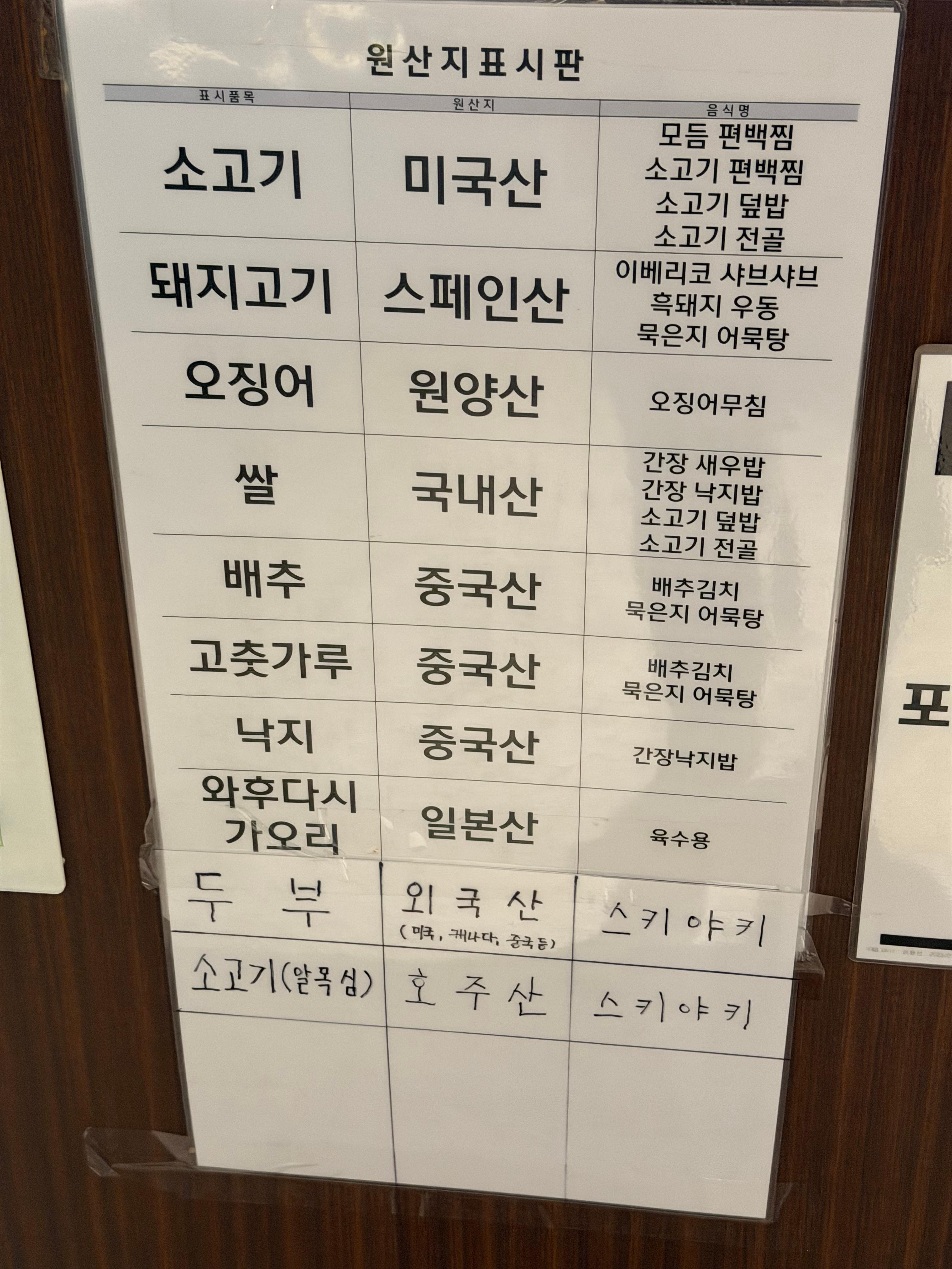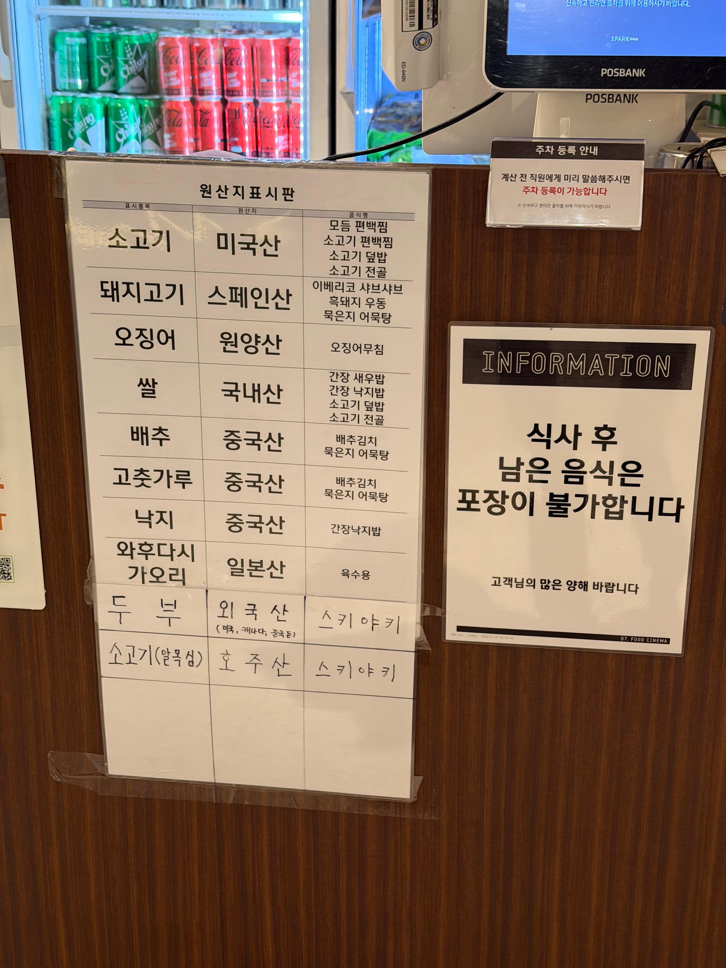 식당 내부에는 카운터에 원산지표시판이 있었습니다. 소고기는 미국산이군요. 수입산을 쓰는 거는 이해하지만, 호주산이었으면 더 좋았을 것 같습니다. 배추, 고춧가루를 중국산을 쓰네요. 어지간하면 국산김치 쓰시라고 하고 싶지만 아무래도 가격이 있으니 그냥 이해해야겠습니다.