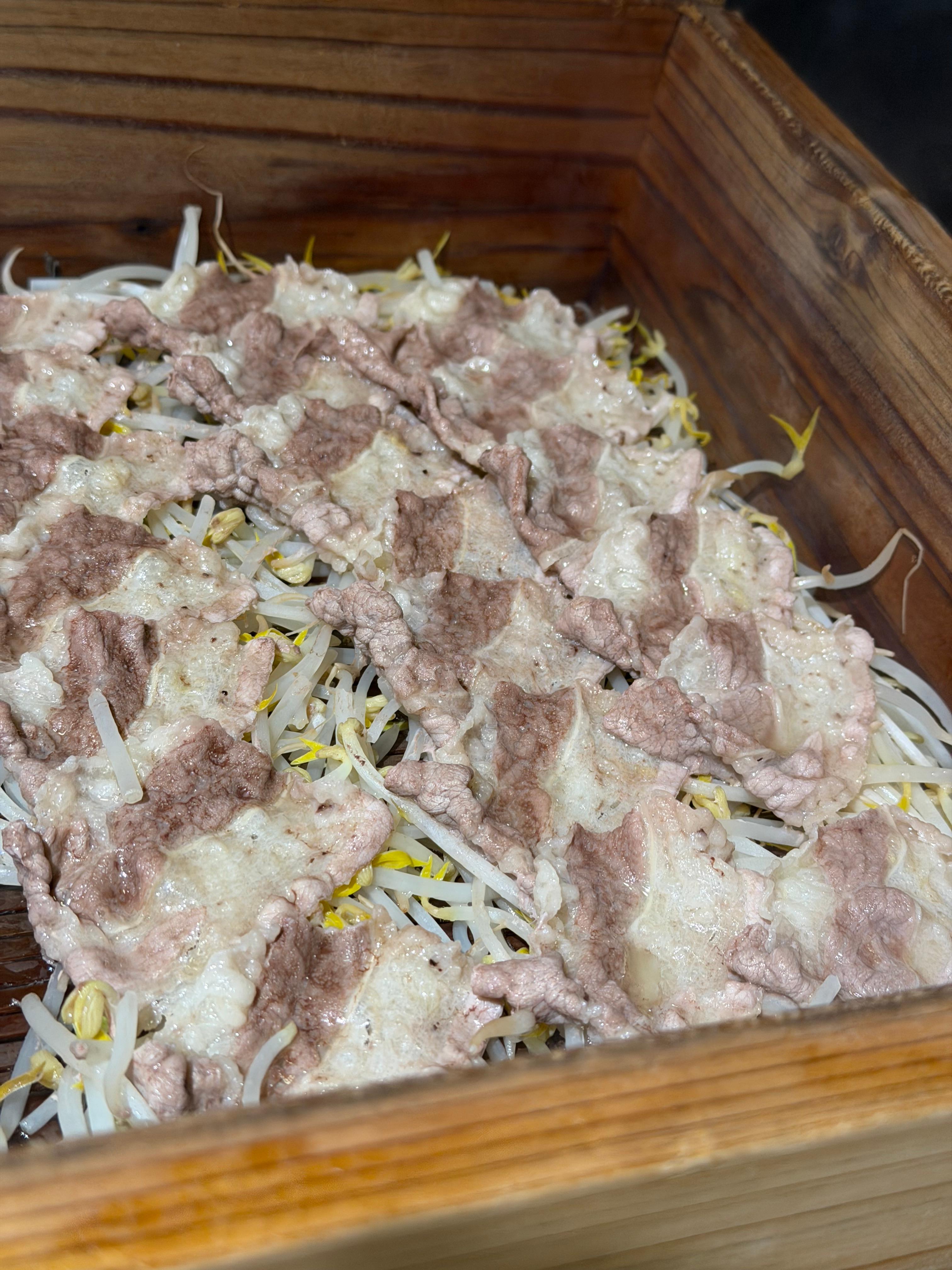 편백찜은 약 7분 동안 테이블에서 익어갑니다. 익는 시간 동안 간장새우밥을 먹거나 멍때리고 있으면 됩니다. 편백찜의 그릇은 다소 크지만 고기와 숙주의 양이 그다지 많다고 할 수는 없었습니다. 2인분에 고기가 7개씩 4줄로 약 28개 정도 있었습니다. 숙주는 아주 얇게 있었고요. 양이 많지는 않았지만 함께 제공되는 소스가 꽤 맛이 좋고, 고기에 잡내가 나지 않아서 먹기에 아주 좋았습니다.