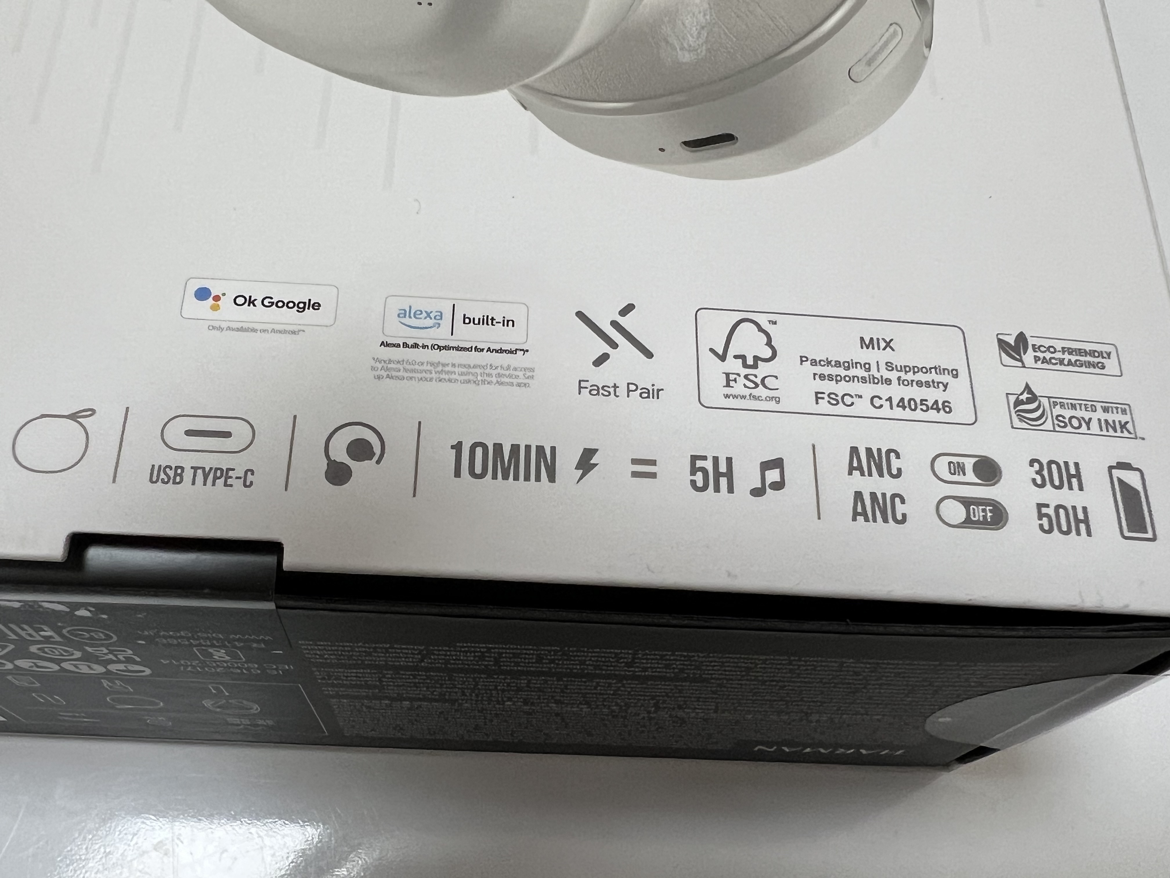 박스 뒷면에는 정말 다양한 내용이 적혀 있습니다. 캐링 케이스가 제공된다는 것, USB C 타입, 헤드폰이 접힌다는 것까지는 그림으로 알려 주네요. 콩기름 잉크 썼다는 것도 보이고요. 그런 것보다도 저는 10분 충전에 5시간 재생이 가능하다는 것이 가장 눈에 들어오네요. ANC를 끄면 50시간, 켜면 30시간이라는 재생시간은 다소 아쉬운 부분입니다. 물론 이어폰과 비교하면 연속 30시간 재생도 절대 짧은 건 아니죠. 여전히 ANC를 켜면 5~6시간이라는 한계를 벗어나지 못하고, 케이스로 충전을 하더라도 24~30시간 내외가 이어폰의 한계이니까요. 하지만 다른 헤드폰과 비교를 하자면 길지 않은 것이 사실입니다. 심지어 10만원대 중반에 판매되는 Anker Q45는 ANC 켜고 50시간, 끄고 65시간인 것을 감안한다면 아쉽습니다.