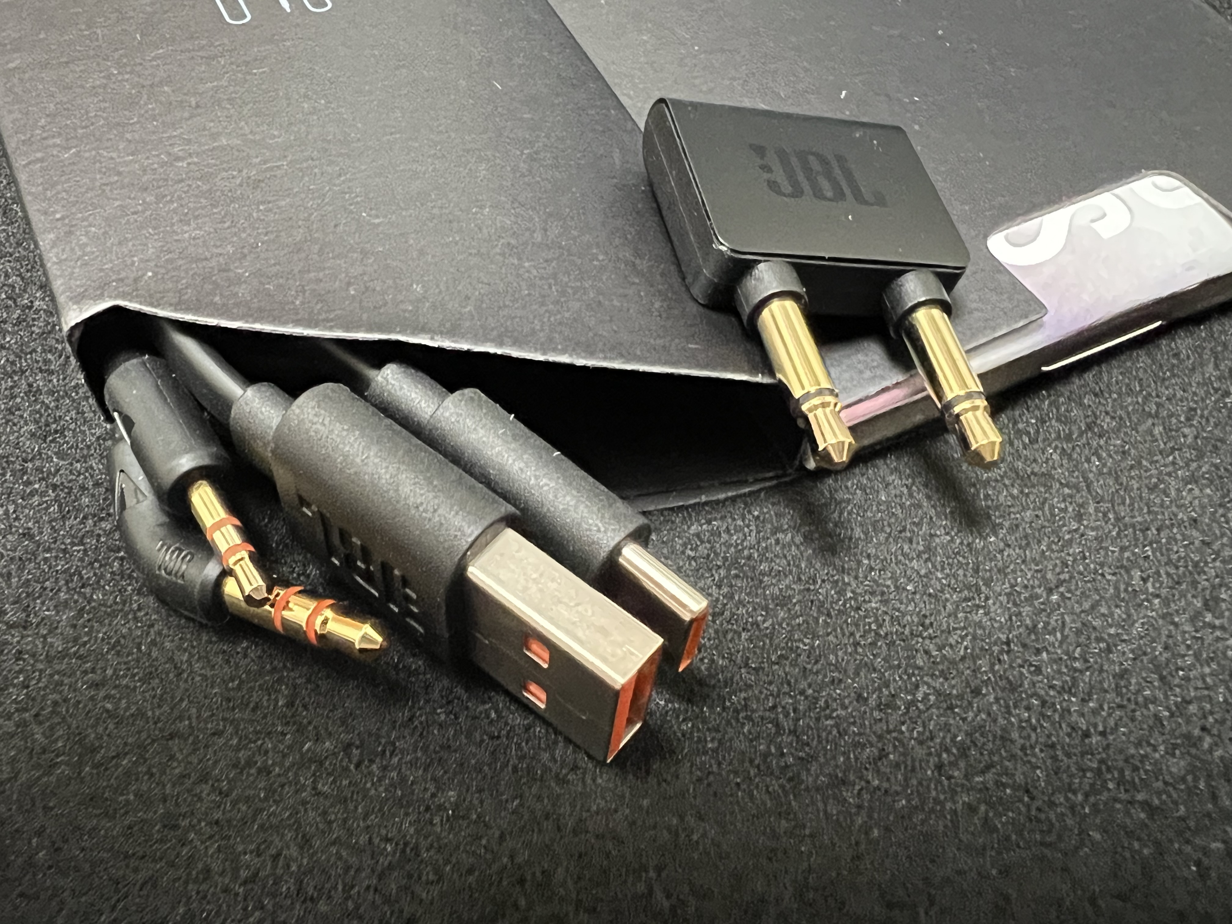 수납된 것들을 꺼내면 나란히 붙은 두 개의 종이 상자에 3.5mm to 2.5mm 케이블, USB A to C 케이블, 항공기 변환 젠더가 왼쪽 공간에, 퀵가이드, 안전 주의 매뉴얼 등이 오른쪽 공간에 각각 수납되어 있습니다. 케이블 류의 잭은 JBL 고유 색상인 주황색으로 되어 있네요.