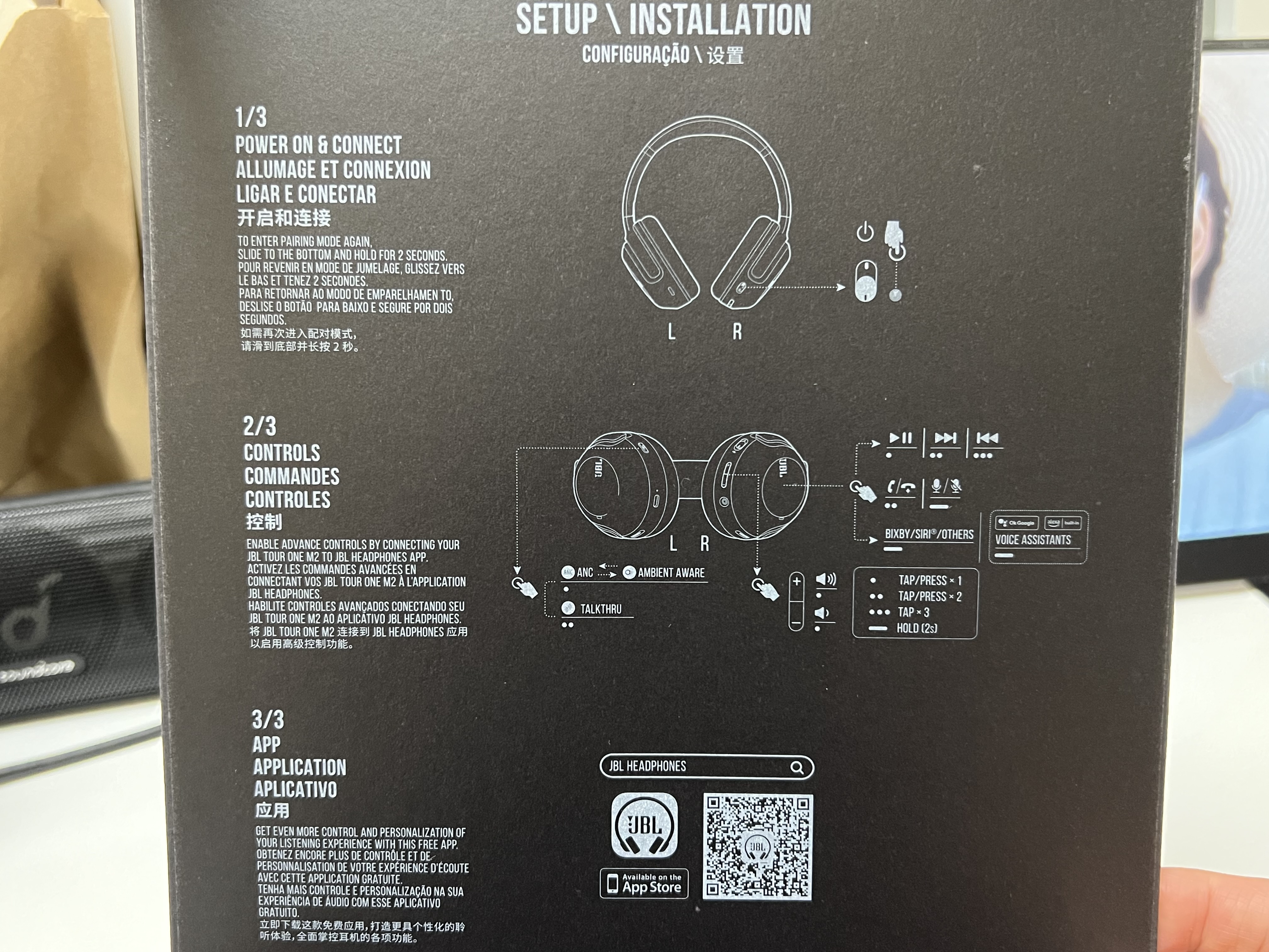 박스를 열면 헤드폰의 기능설명이 보입니다. 전원을 켜서 페어링할 것. 컨트롤 버튼 명령어를 익힐 것. 그리고 앱을 다운로드 받을 것. 이렇게 안내하고 있습니다. 사실 여기까지만 해도 JBL FLIP6의 앱이 워낙 별로 할 게 없었기 때문에 앱을 깐다고 뭐 달라질 게 있겠어? 할 게 있겠어? 하는 의심을 갖고 있었습니다. 같은 계열사인 보스도 QC45에서 겨우 3밴드 EQ를 겨우 나중에 업데이트 해서 넣어 주고, FLIP6 역시도 3밴드 EQ에 별다른 기능이 없었기 때문입니다. 하지만 Tour One M2는 다릅니다. 앱은 필수예요. 앱 기능은 따로 Part 2나 Part 3로 나눠서 소개해야 할 만큼 엄청납니다.
