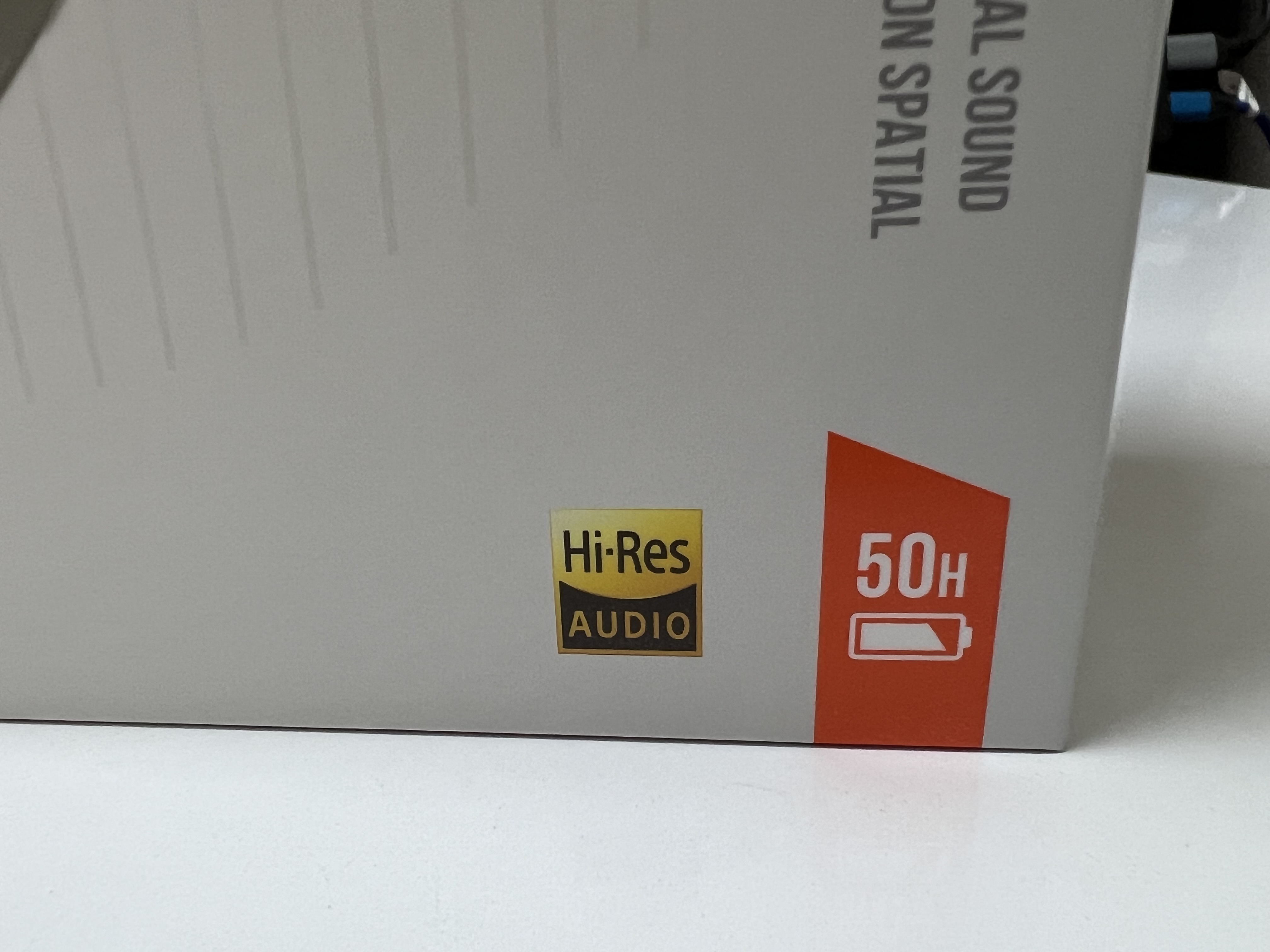 박스 하단에는 Hi-Res Audio 인증 로고와 50시간 재생 가능하다는 문구가 있네요. Hi-Res 인증은 재생 가능한 주파수 범위가 최대 40KHz까지인데, 블루투스 대역폭의 한계상 무선으로는 20KHz까지만 전송이 가능할 뿐입니다. 40KHz까지 재생을 하기 위해서는 유선 연결을 해야 합니다. 사실 20KHz 영역도 듣기가 힘든 대역인데, 40KHz가 의미가 있는지는 잘 모르겠습니다.