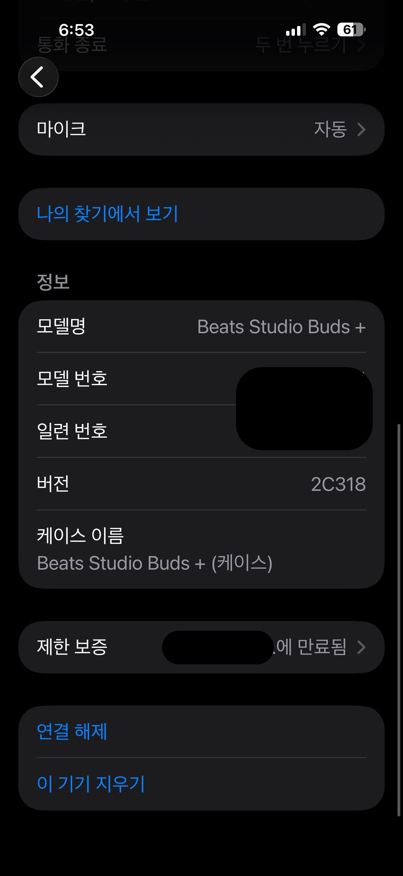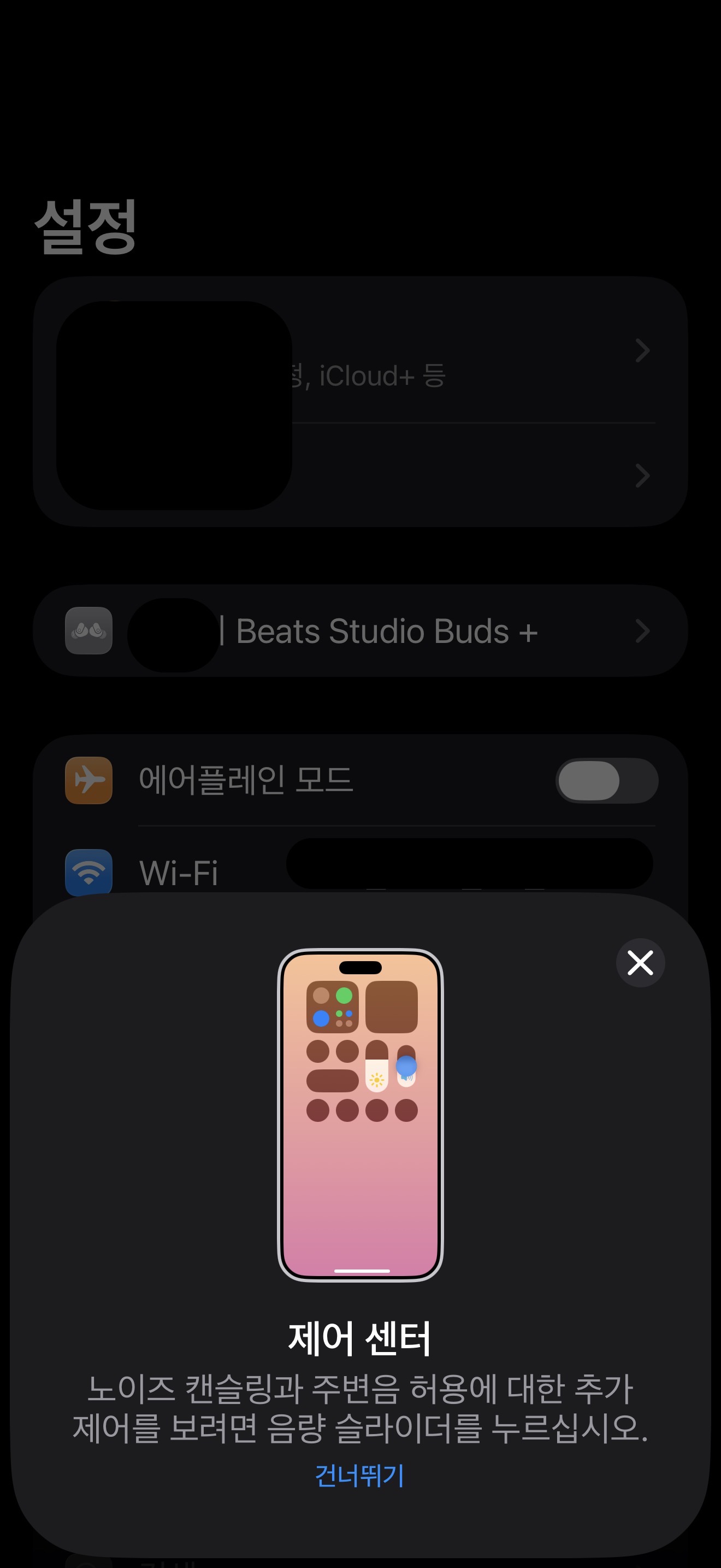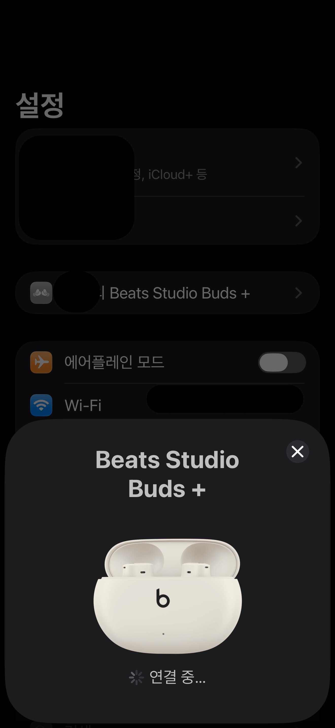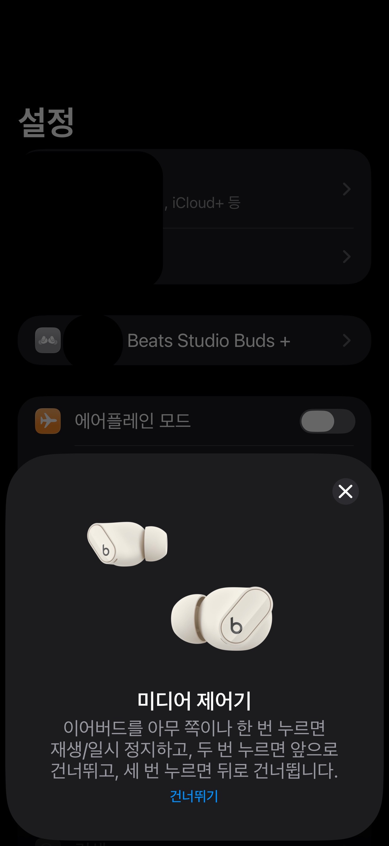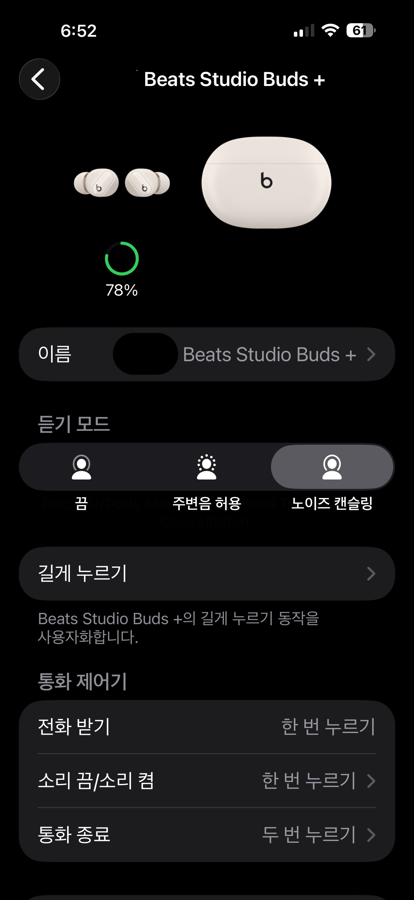 설정 항목을 탭하면 버튼 설정과 노이즈캔슬링 작동 여부 등을 설정할 수 있습니다. 애플뮤직 앱에서는 아래에 제품 이미지와 이름이 다른 애플 기기와 마찬가지로 표시가 됩니다. 애플 기기끼리는 이런 깨알 디테일이 있는 게 참 변태같습니다.