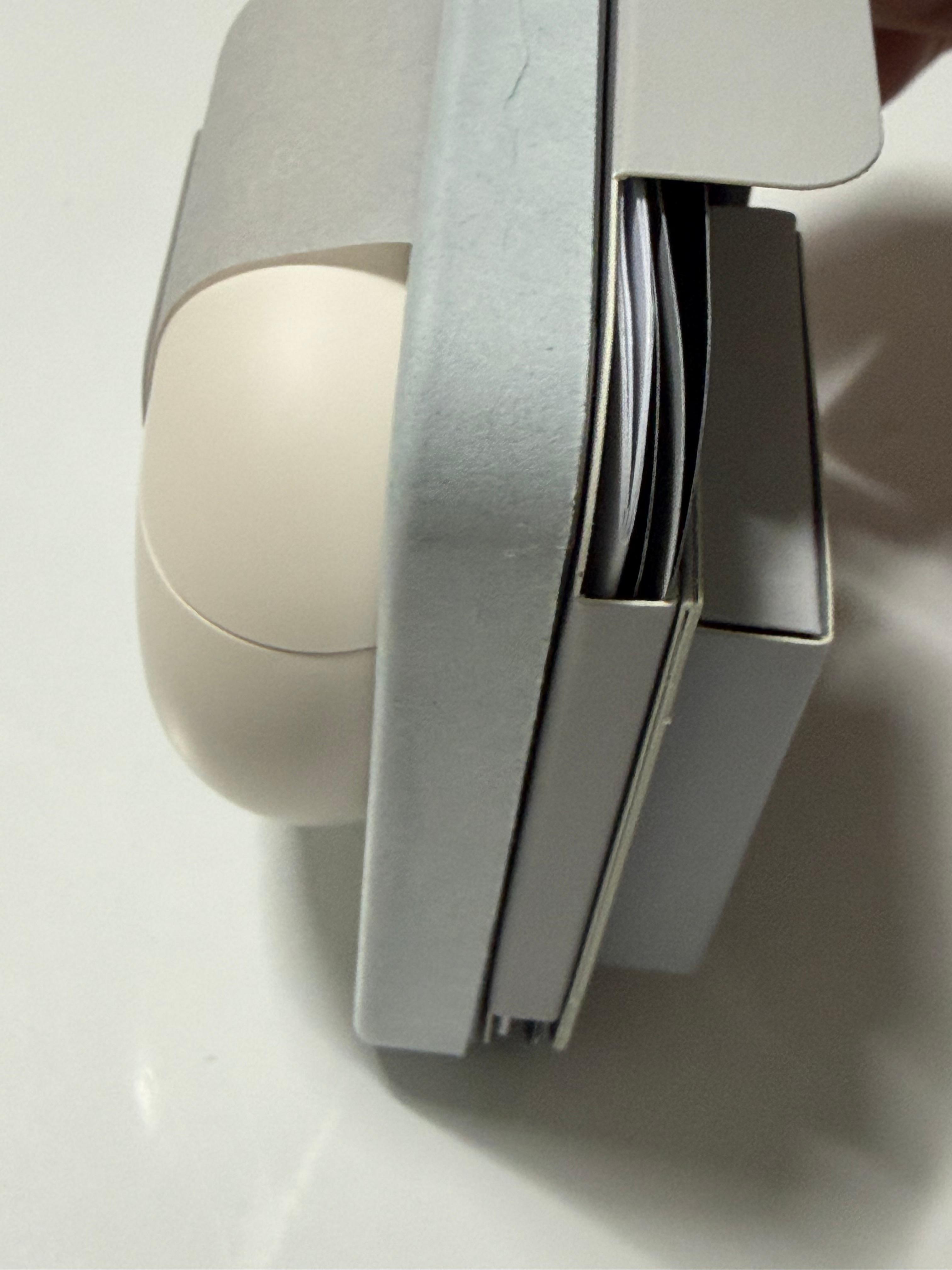 이어폰 케이스를 열면 에어팟 콩나물 디자인에서 나물 부분만 똑 떼어낸 모양의 이어폰을 꺼낼 수 있습니다. 당연하게도 자석으로 착착 달라 붙고, 꺼낼 때도 다소 손가락에 힘을 줘야 합니다. 에어팟 시리즈보다 잡는 부분의 면적이 좁고 얄팍해서 잘 안 꺼내집니다. 그리고 끼울 때마다 어느 게 맞는 방향인지 이리저리 돌려가며 맞추게 됩니다. 비츠 스튜디오 버즈 플러스만 쓰면 금방 익숙해지겠지만 에어팟 시리즈와 함께 사용하게 되면 확실히 헷갈리고, 적응이 안 됩니다.