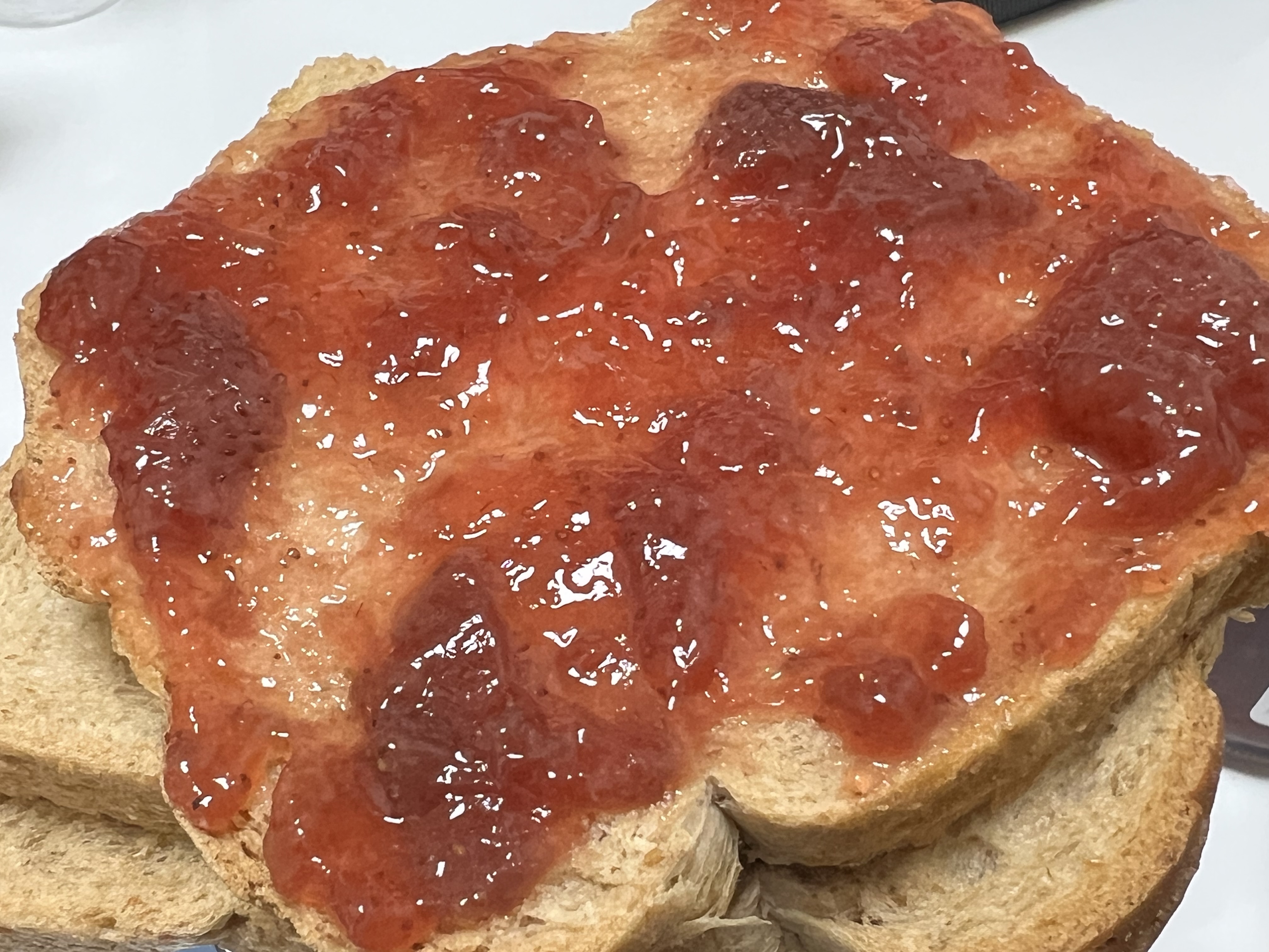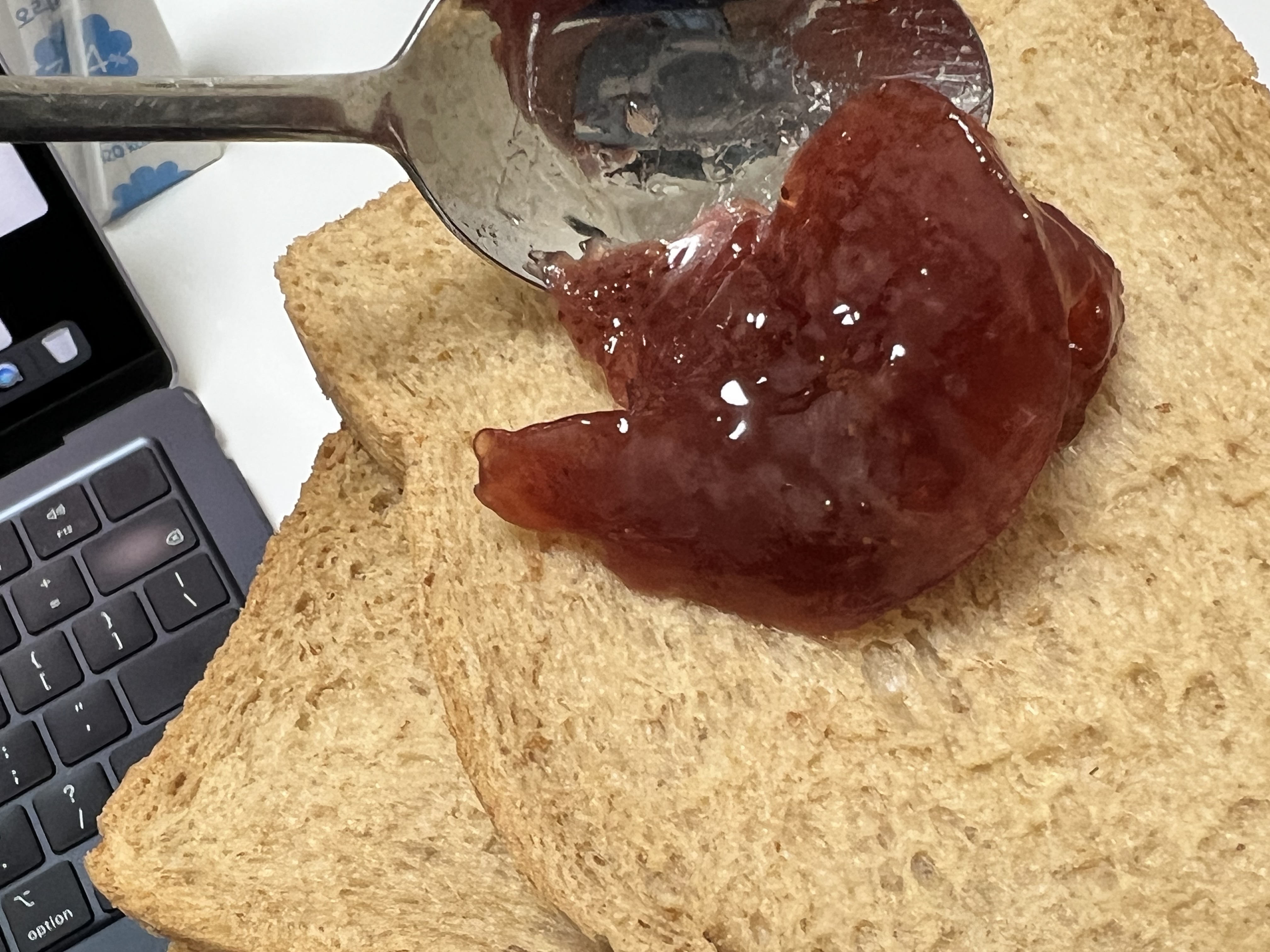 복음자리 45도 과일잼 Strawberry 딸기를 식빵에 바르면 이런 모습입니다. 딸기가 덩어리져서 온 식빵에 전체적으로 딸기 덩어리가 자리하게 됩니다. 그래서 딸기잼을 생각보다 많이 발라야 합니다. 물처럼 묽은 잼의 경우는 빵에 아주 얇게 발라질 수 있지만 복음자리 45도 과일잼 Strawberry 딸기의 경우는 딸기가 덩어리째 들어 있기 때문에 예상보다 잼을 많이 발라야 합니다. 안 그러면 딸기를 숟가락으로 짓눌러 펴야 하기 때문에 빵의 식감 자체가 질겨지고 나빠지기 때문입니다.