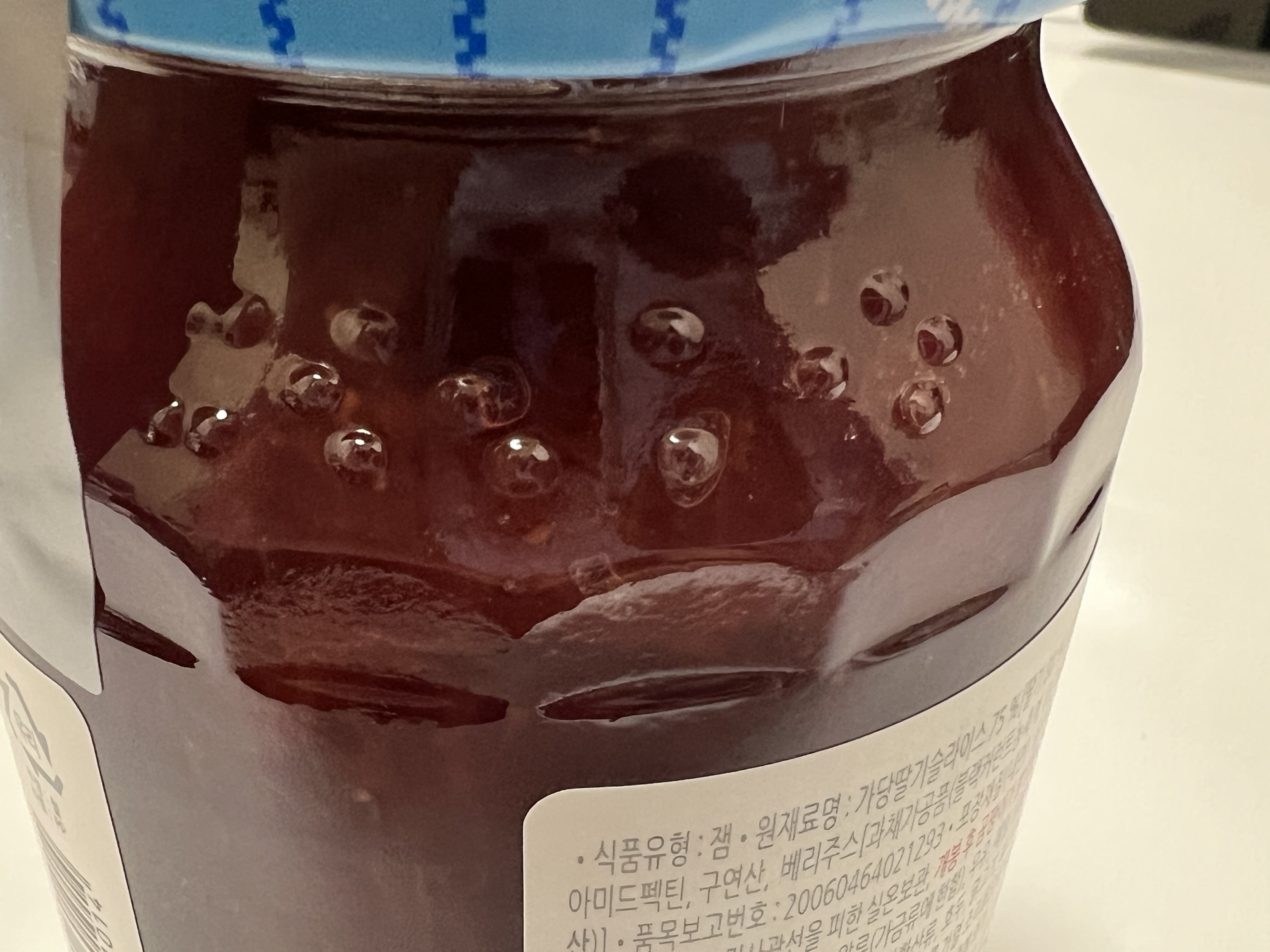 저는 이 제품에서 가장 인상 깊었던 부분이 바로 유리병에 점자 표시를 넣어 놓은 것이었습니다. 기존 제품에는 딸기잼, 포도잼 할 것 없이 모두 점자 표시가 없었는데 복음자리 45도 과일잼 Strawberry 딸기에는 꽤 큰 크기로 점자 표시를 해 두었습니다. 사회적 약자에 대한 복음자리의 시선을 확인할 수 있는 부분일 겁니다.
