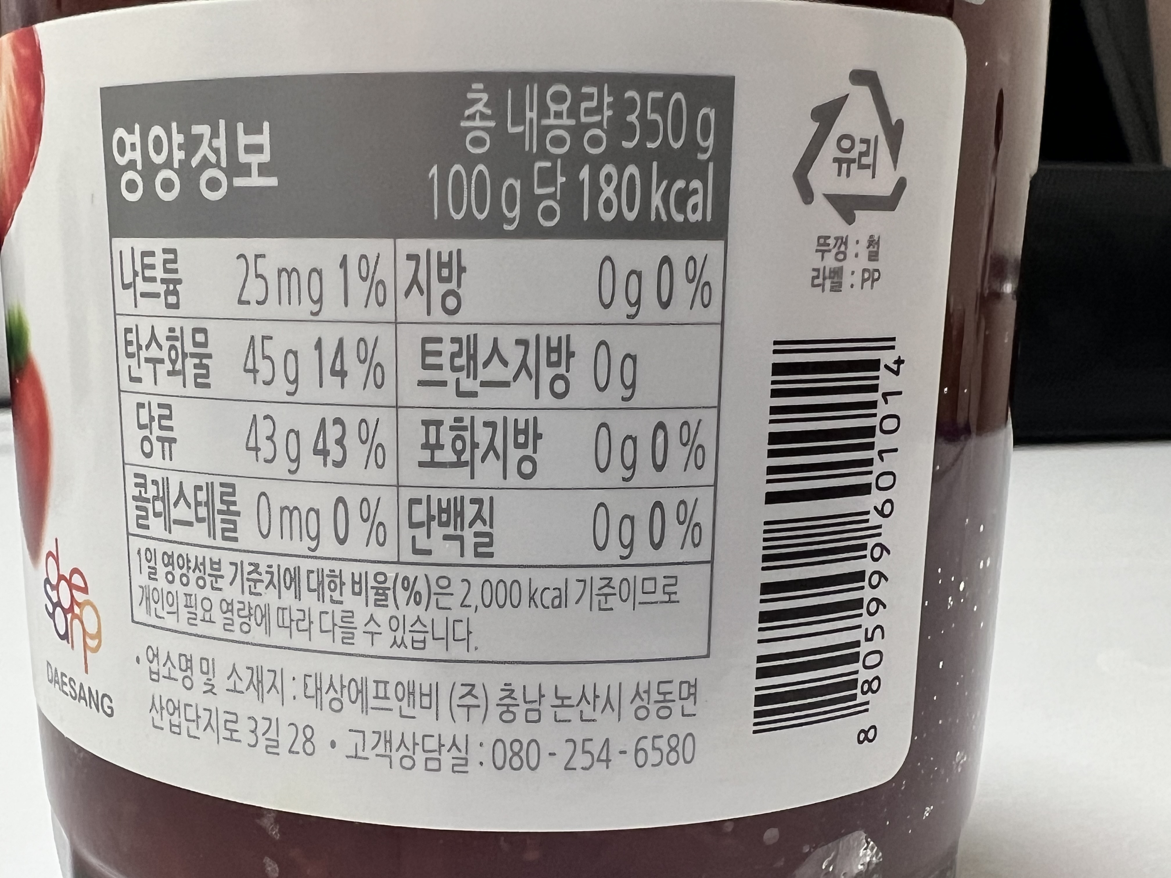 당류의 함량이 낮아지면서 칼로리도 꽤 낮아졌습니다. 기존 제품의 칼로리가 100그램당 275킬로칼로리인 데 반해 복음자리 45도 과일잼 Strawberry 딸기의 칼로리는 100그램당 180킬로칼로리입니다. 거의 100킬로칼로리나 낮은 열량으로 인해 다이어트 하시는 분들에게도 좋겠네요.