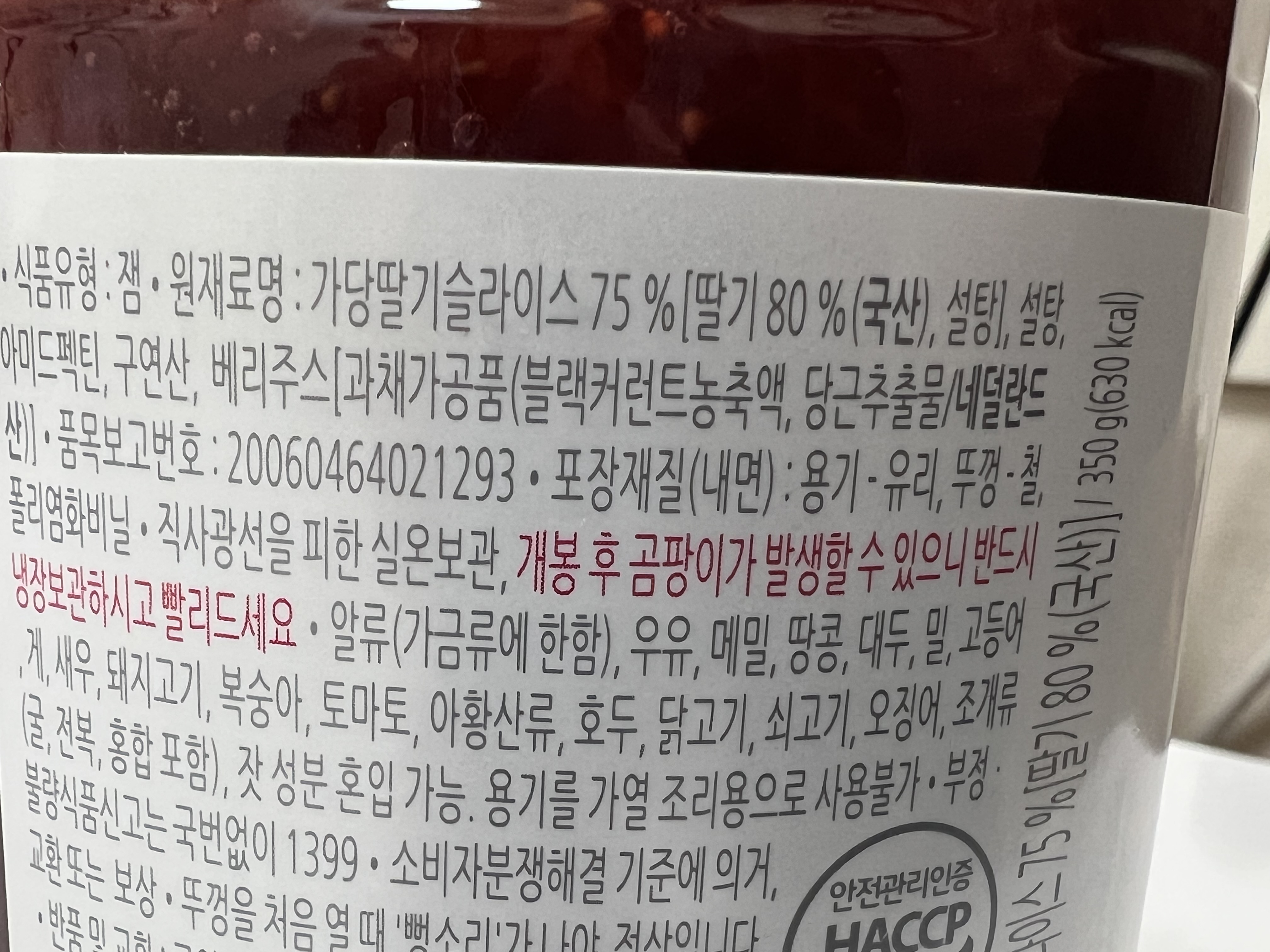 가당 딸기의 함량이 75%이고, 그 중에서 딸기 함량이 80%이라고 하니 전체 중량 대비 60%가 딸기라는 계산이 나오네요. 보통 딸기와 설탕의 비율이 50%만 되어도 딸기 함량이 높다고 하는데 이 제품은 무려 60%나 들어 있습니다.