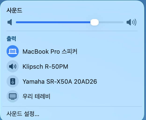 클립쉬 R-50PM는 75인치 TV 옆에 설치를 했습니다.사운드바는 e-ARC로, 클립쉬 R-50PM는 Optical로 연결했는데 음악을 듣기에는 확실히 클립쉬 R-50PM가 한 수 위의 소리를 들려 줬습니다. 물론 돌비 애트모스를 지원하는 야마하 TrueX 50A의 공간감은 확실히 공연장 가운데 있는 느낌을 주었습니다만, 소리의 질감이나 무게감, 그리고 보컬의 힘 같은 음악 자체만큼은 클립쉬 R-50PM가 듣기 좋았습니다.