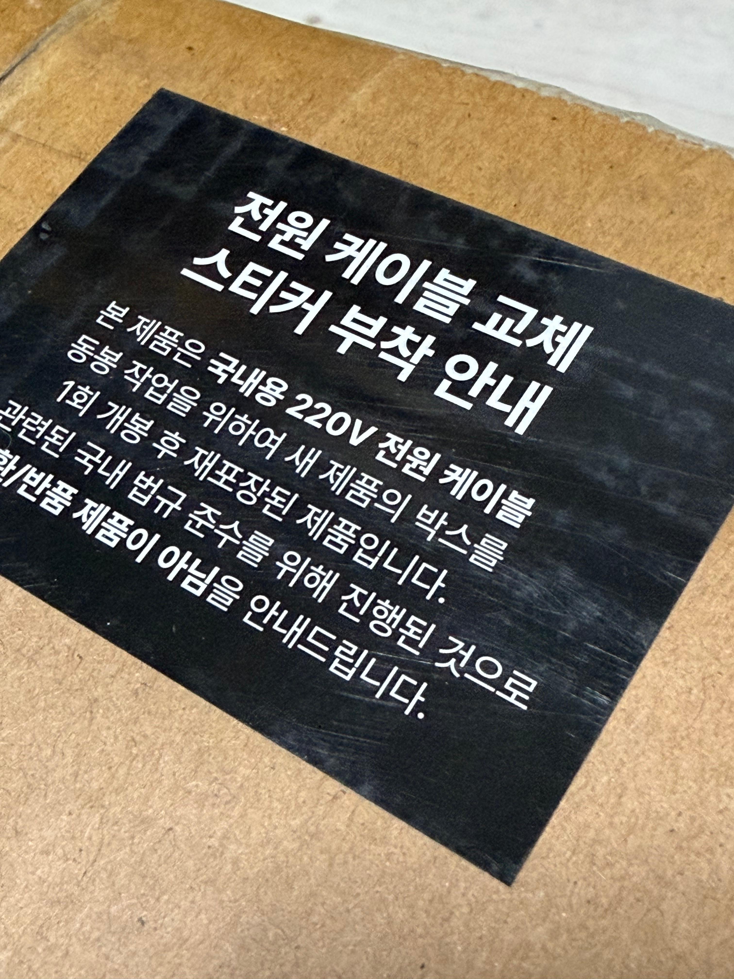 제품 포장은 꽤 두꺼운 골판지로 되어 있습니다. 전원 케이블을 아마 KR 규격으로 바꾸기 위해서 제품 포장을 뜯은 후 가장 위에 케이블을 동봉하는 작업을 거치는가 봅니다. 제조사에서 해 주면 가장 좋겠지만 판매량이 많지 않은 경우에는 이런 식으로 많이 하는 만큼 큰 문제가 되지는 않을 겁니다.