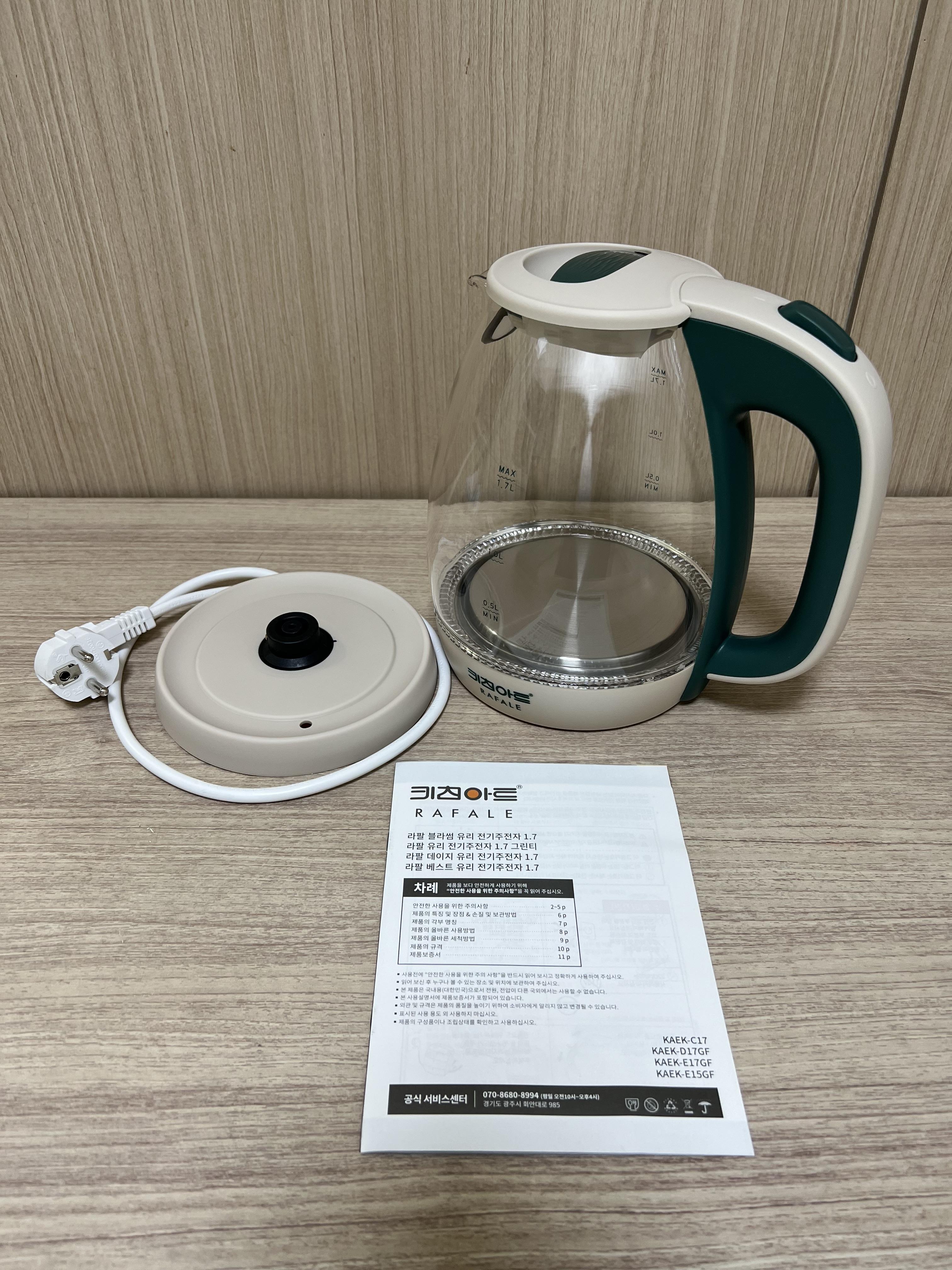 키친아트 라팔 전기주전자의 구성품은 단촐합니다. 전기주전자 본체, 전원을 연결하는 받침대, 그리고 설명서입니다. 굉장히 심플하지만 그렇다고 전기주전자에 더 이상이 필요한가 하는 생각이 들기도 합니다. 딱 필요한 만큼 있을 거 있으면 충분합니다.
