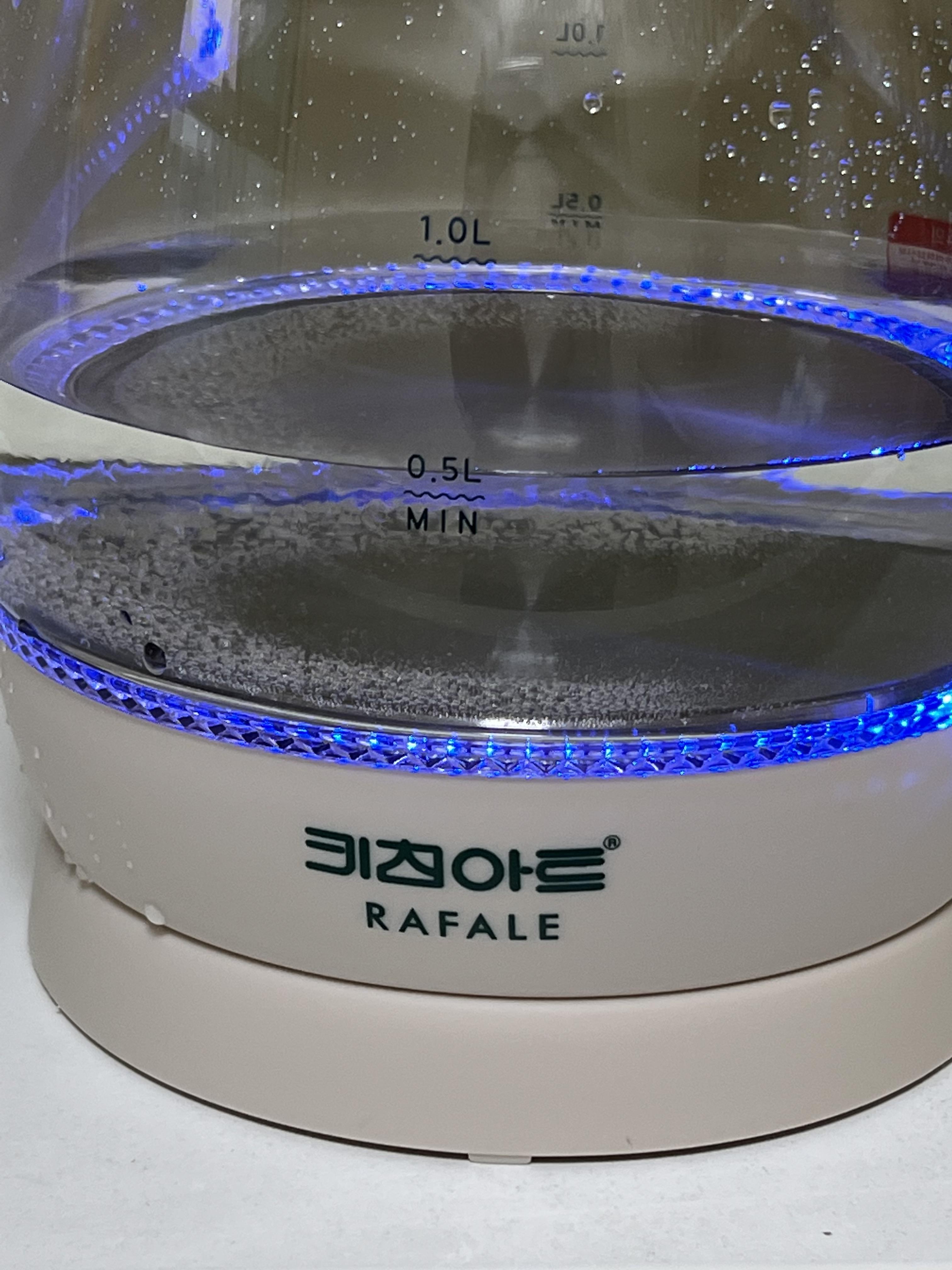 키친아트 라팔 전기주전자를 구입하고나서 가장 마음에 드는 부분이 바로 사용 중에 들어오는 푸른색 LED 입니다. 제가 기존에 사용하는 제품의 경우는 손잡이에 달려 있는 전원스위치에만 희미한 LED가 들어오고, 다른 제품의 경우는 기껏해야 플라스틱이나 스테인레스 사이에 물의 양을 확인할 수 있는 영역에 한해서 LED가 들어오는 수준인 것에 비해 이 제품은 제품 하단 전체를 둘러서 푸른색 LED가 들어오기 때문에 안전 문제에 더욱 신경을 쓸 수가 있습니다.